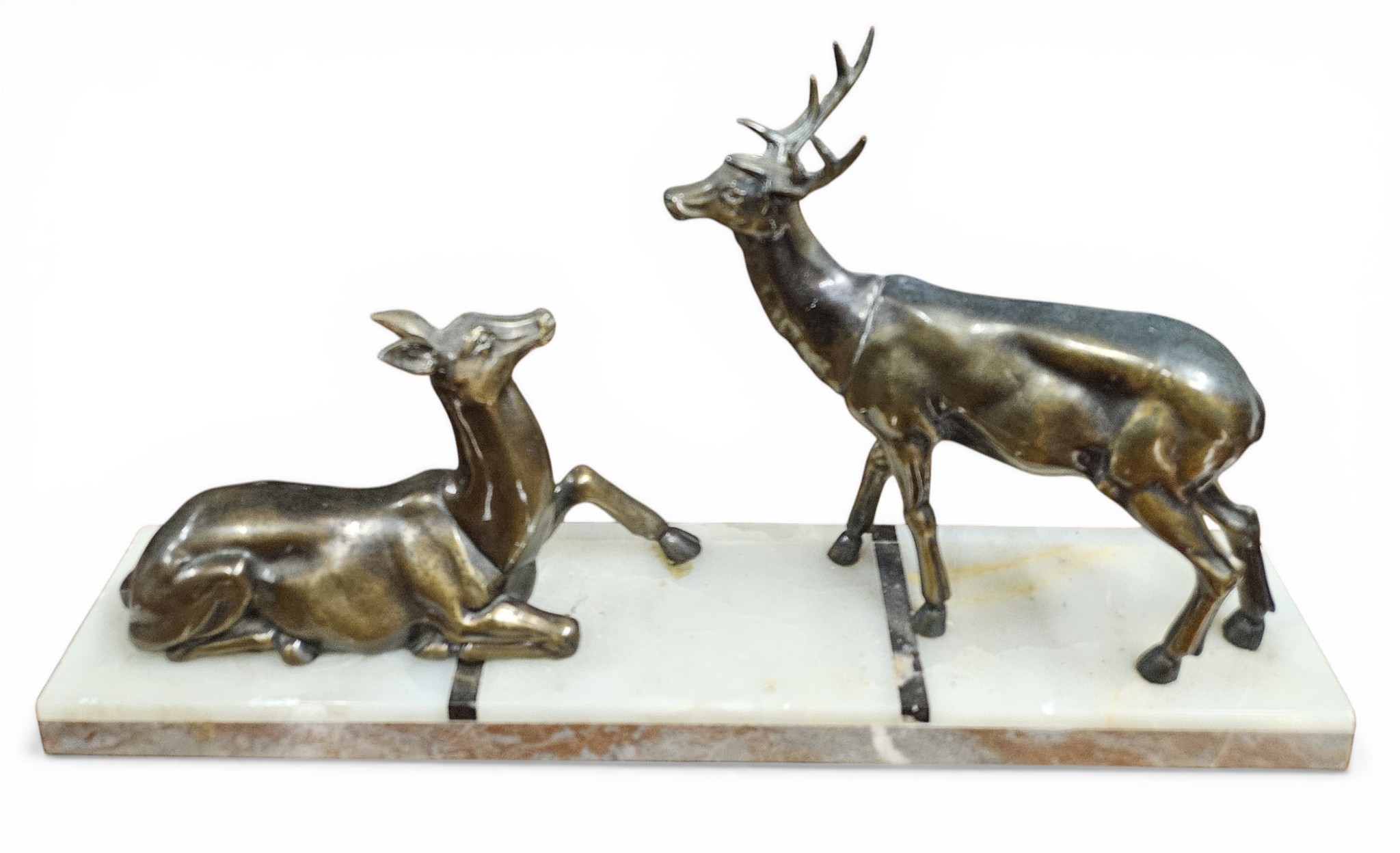 A good Metal and Marble Centre Piece depicting a Stag and a Doe. L 37.5 cm approx.