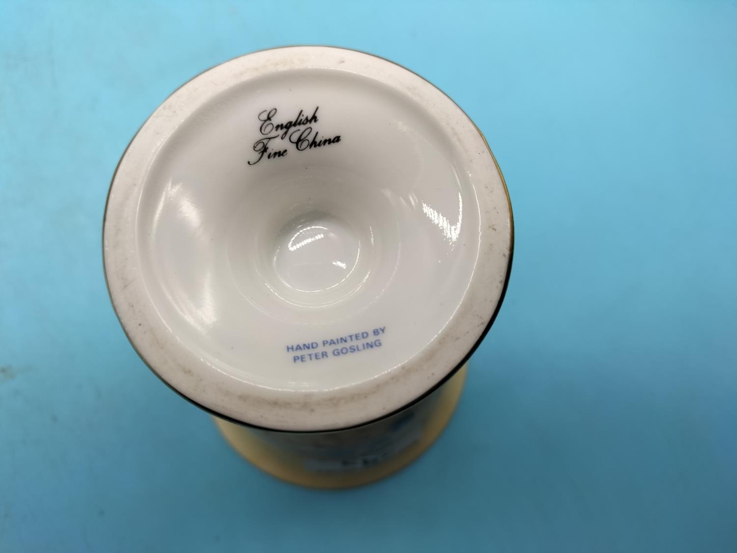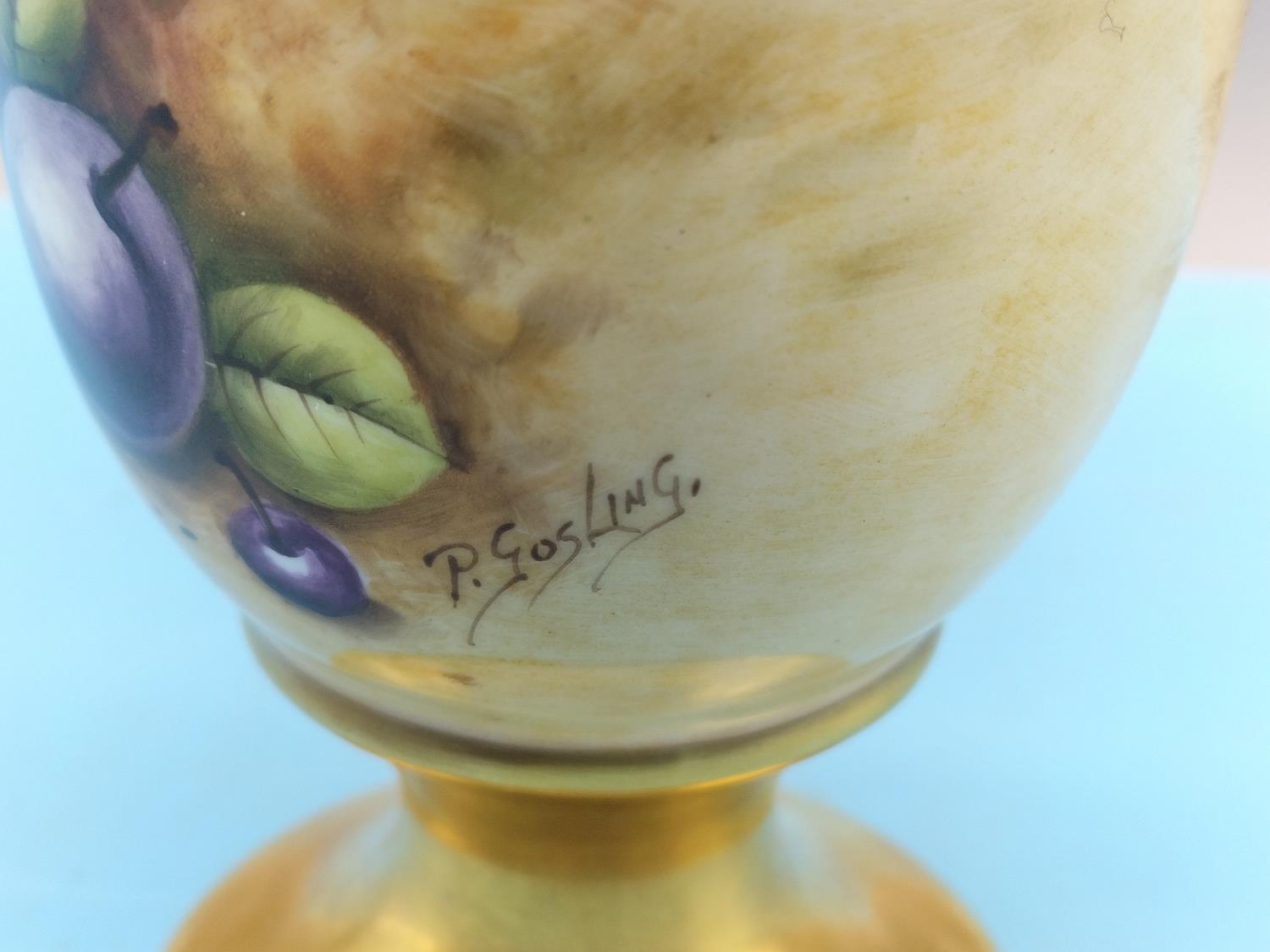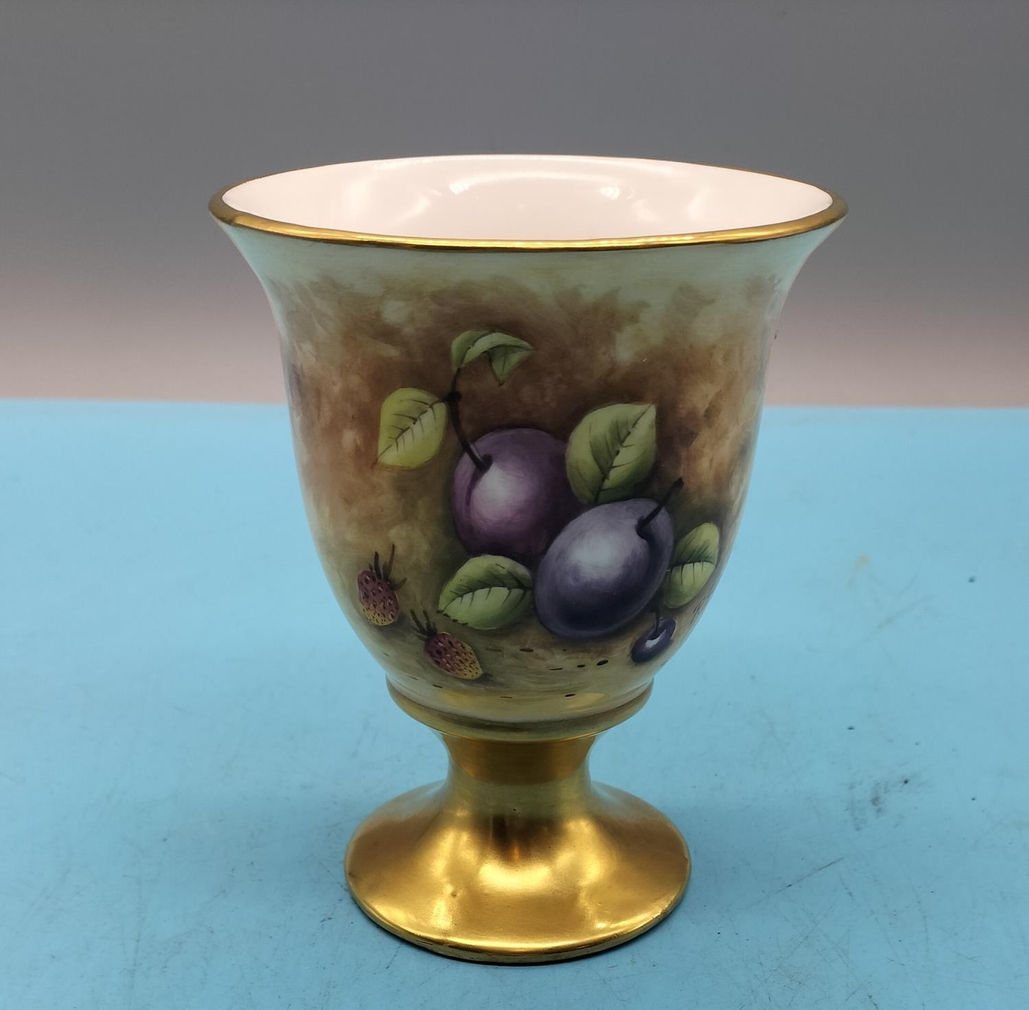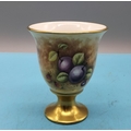 Peter Gosling Hand Painted 11.5cm Goblet Vase. Fruit Scene and 24ct Gilding. Signed and Back Stamped Peter Gosling who in the 1970's was Head of Prestige Art at Minton and Coalport China.