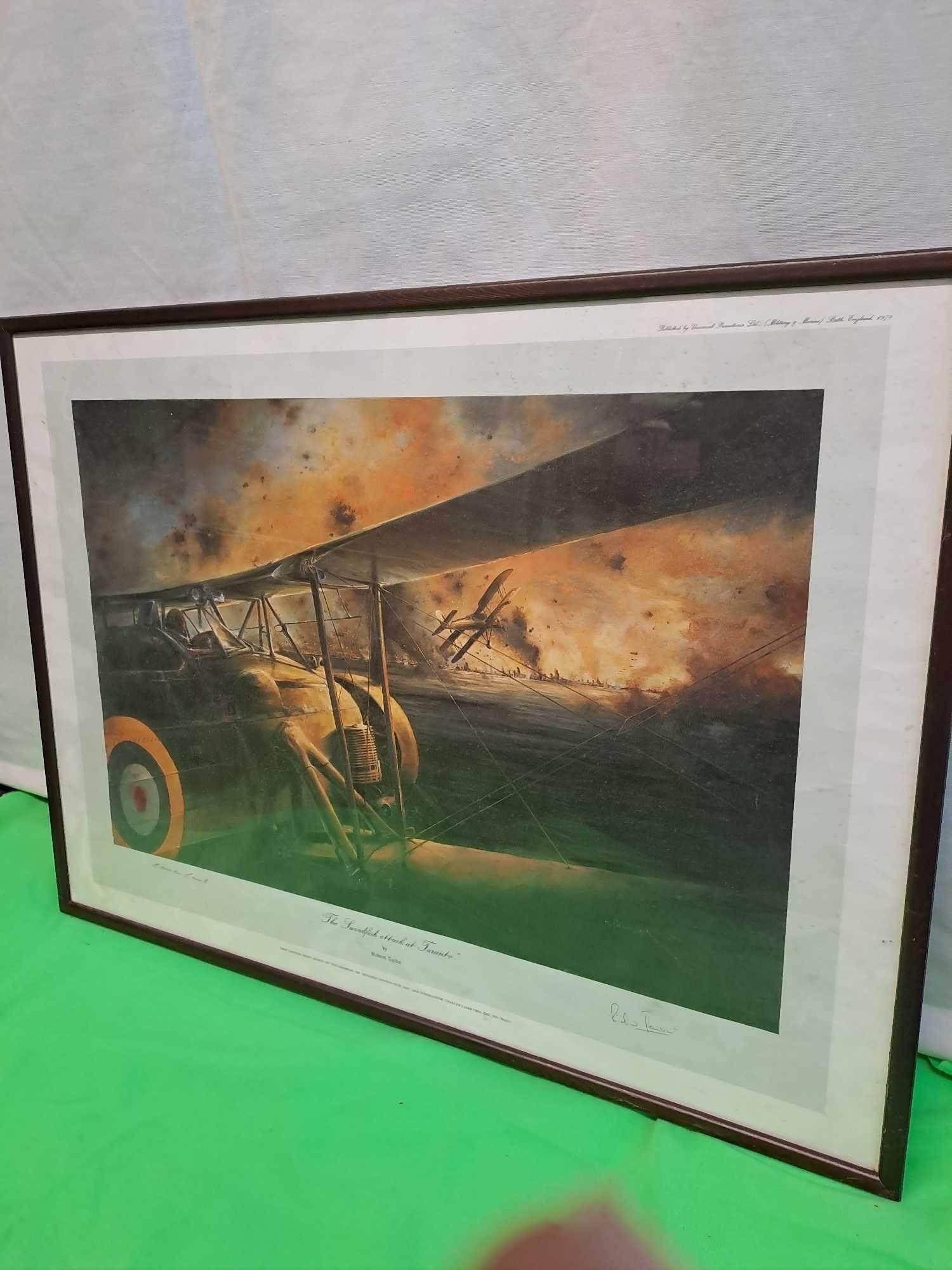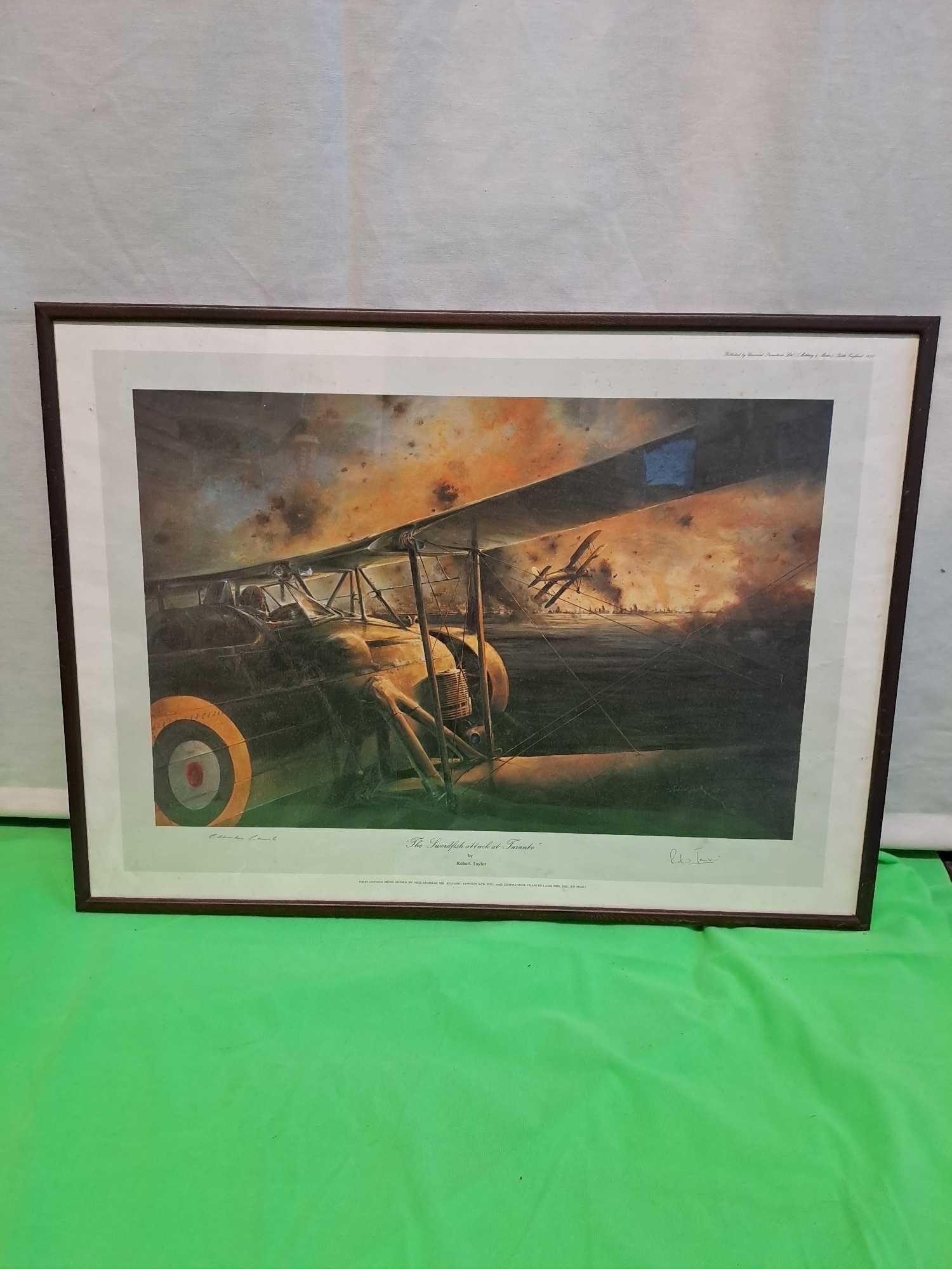 The Swordfish Attack At Taranto First Edition Print Signed By Vice-Admiral Sir Richard Janvrin Kbc, Dsc, And Commander Charles Lamb Dso, Dsc, Rn (Retd.) In Dark Wooden Frame 63 Cm X 47 Cm