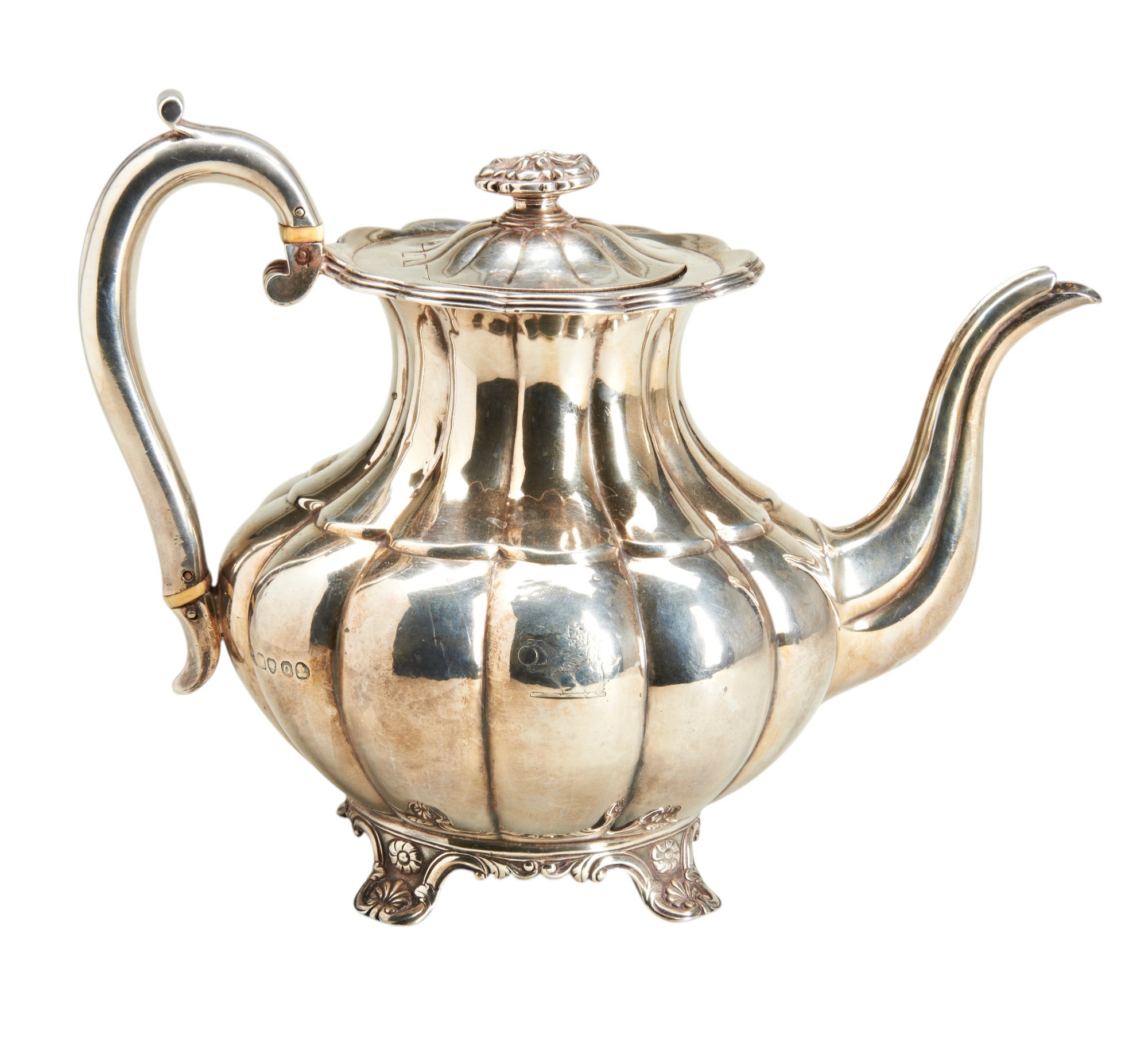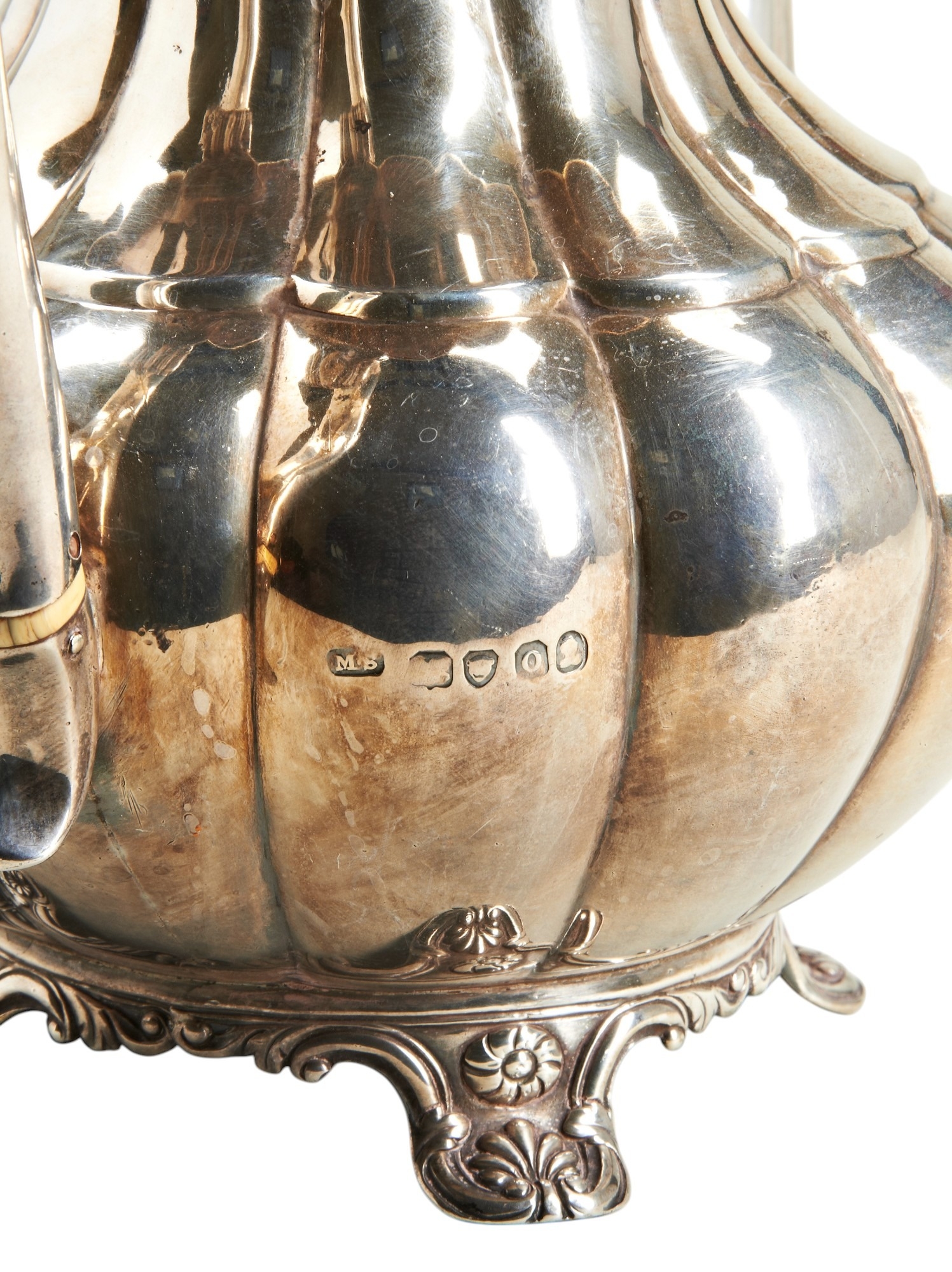 A baluster shaped (melon) coffee pot on four cast shell and flower feet