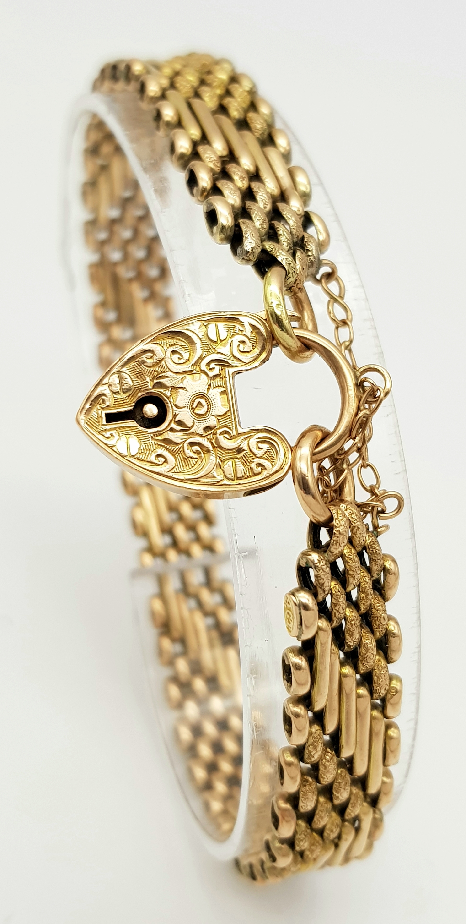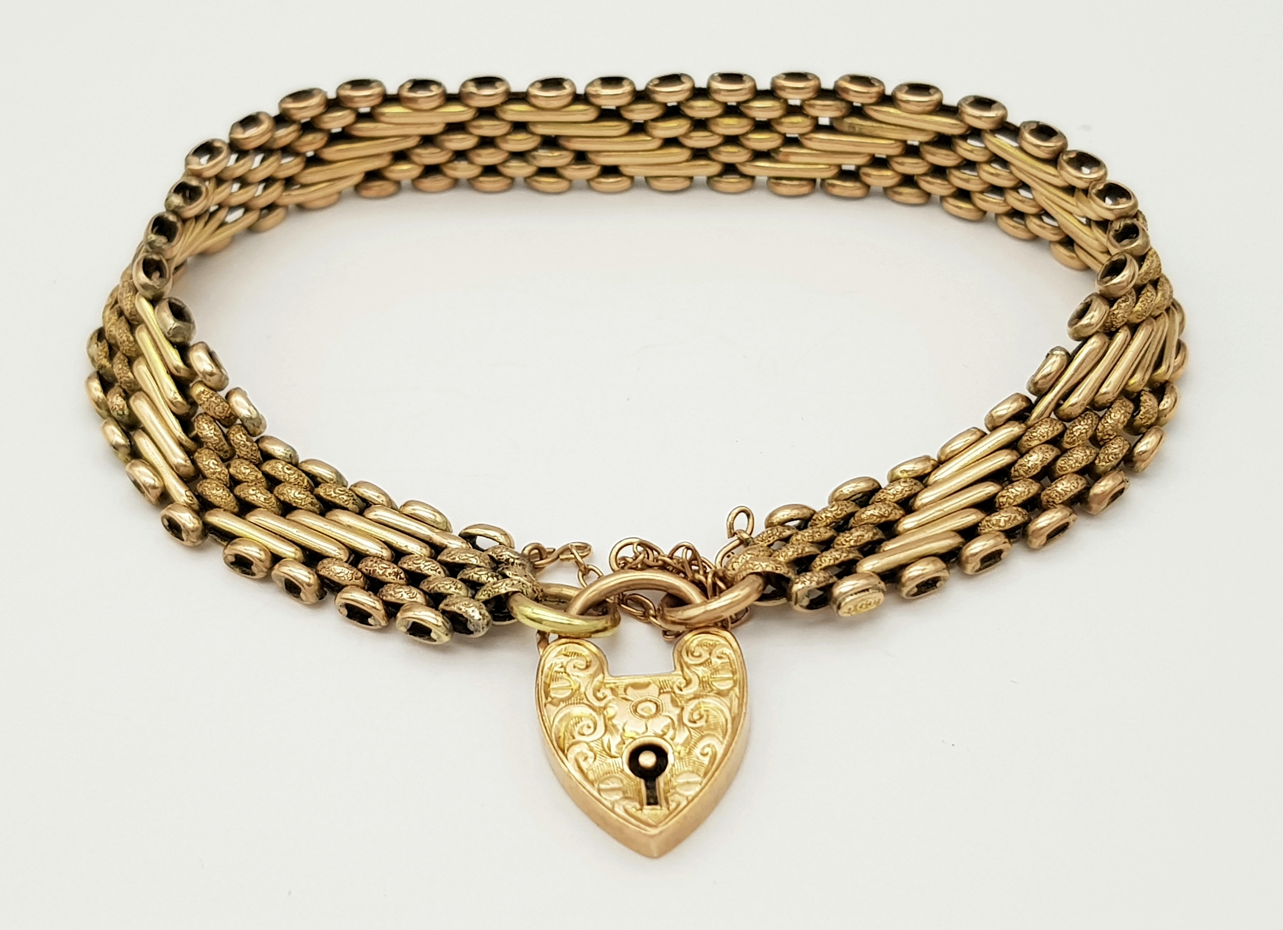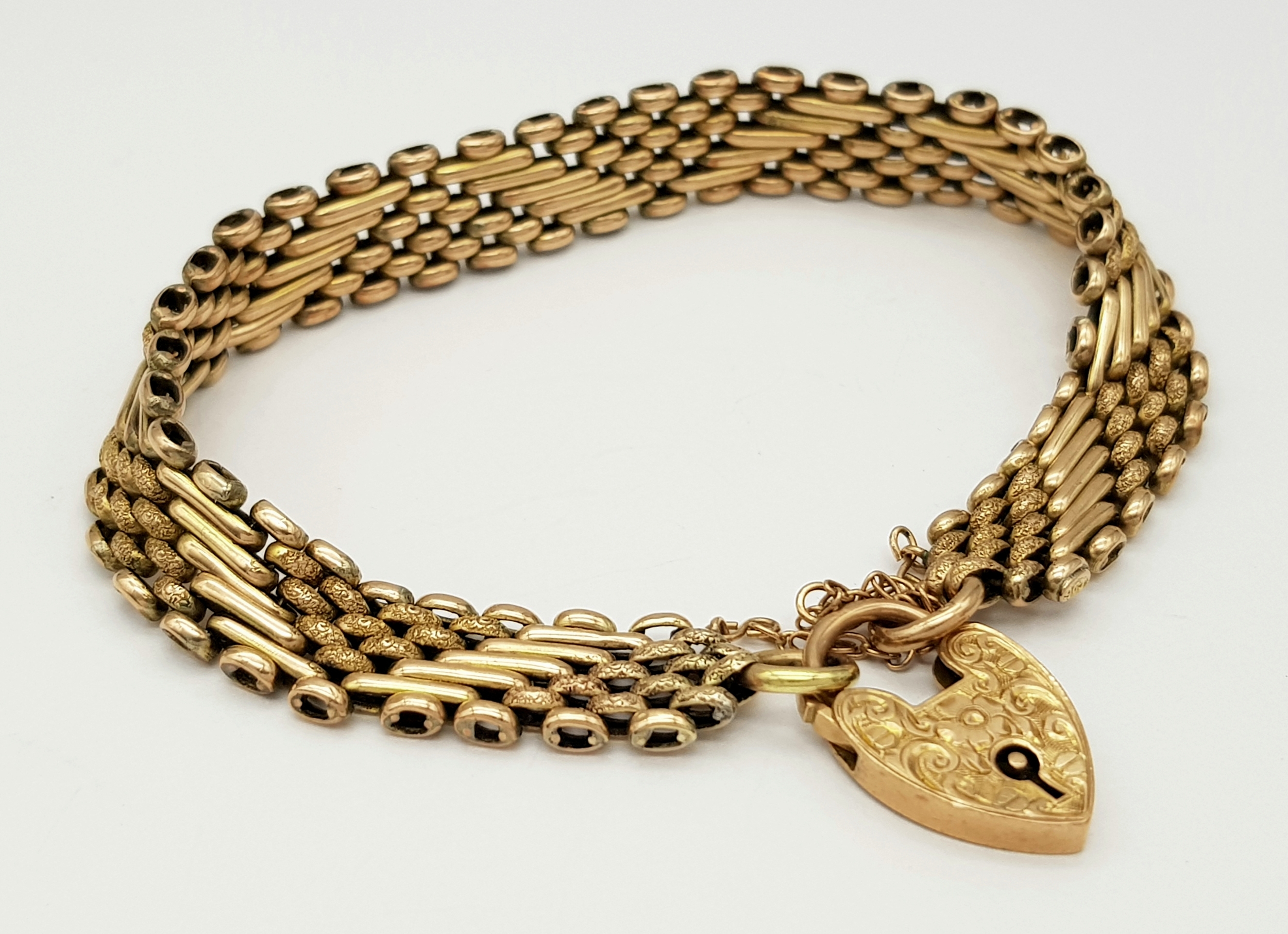 A Lovely Vintage 9K Gold Intricate Link Patterned Bracelet with Heart Clasp. 18cm. 14.8g.