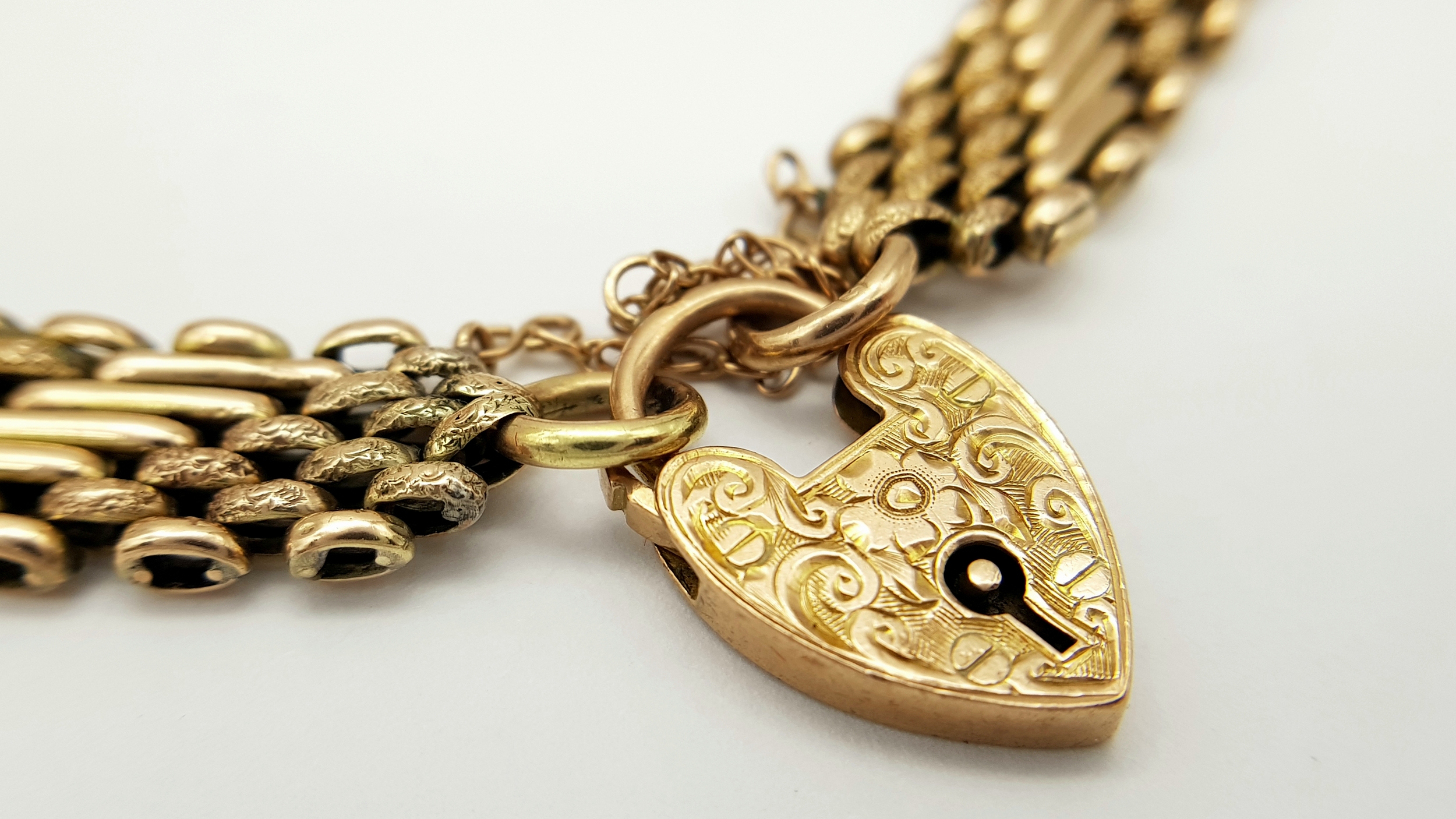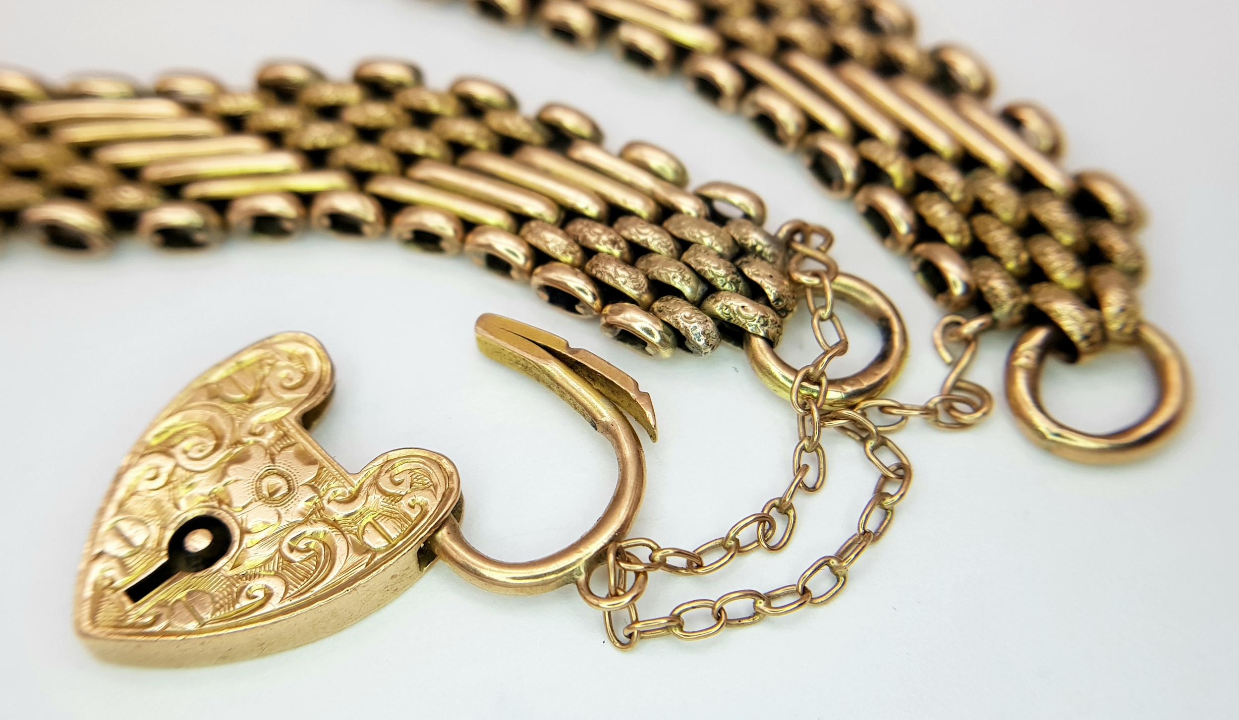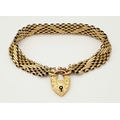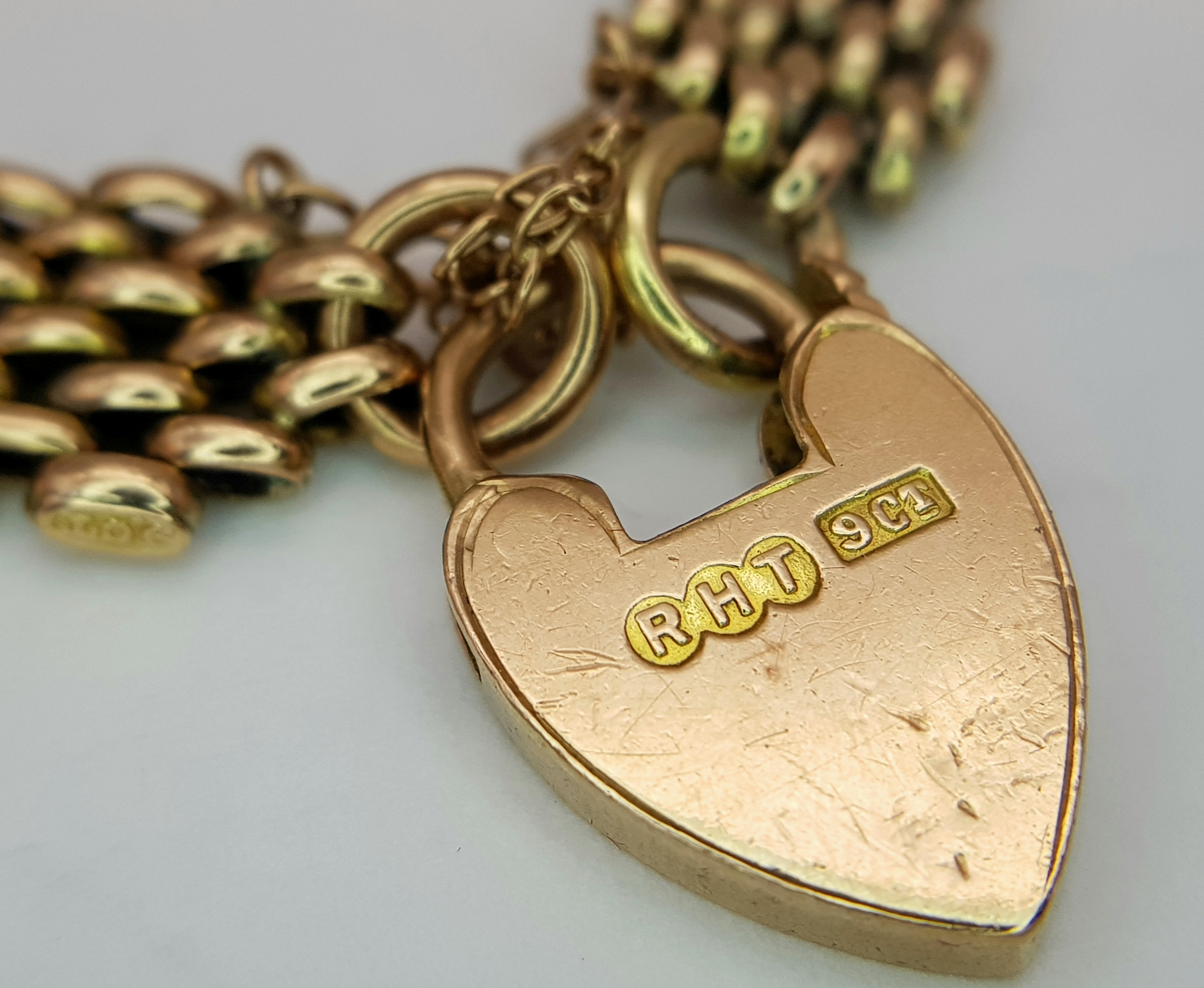 A Lovely Vintage 9K Gold Intricate Link Patterned Bracelet with Heart Clasp. 18cm. 14.8g.