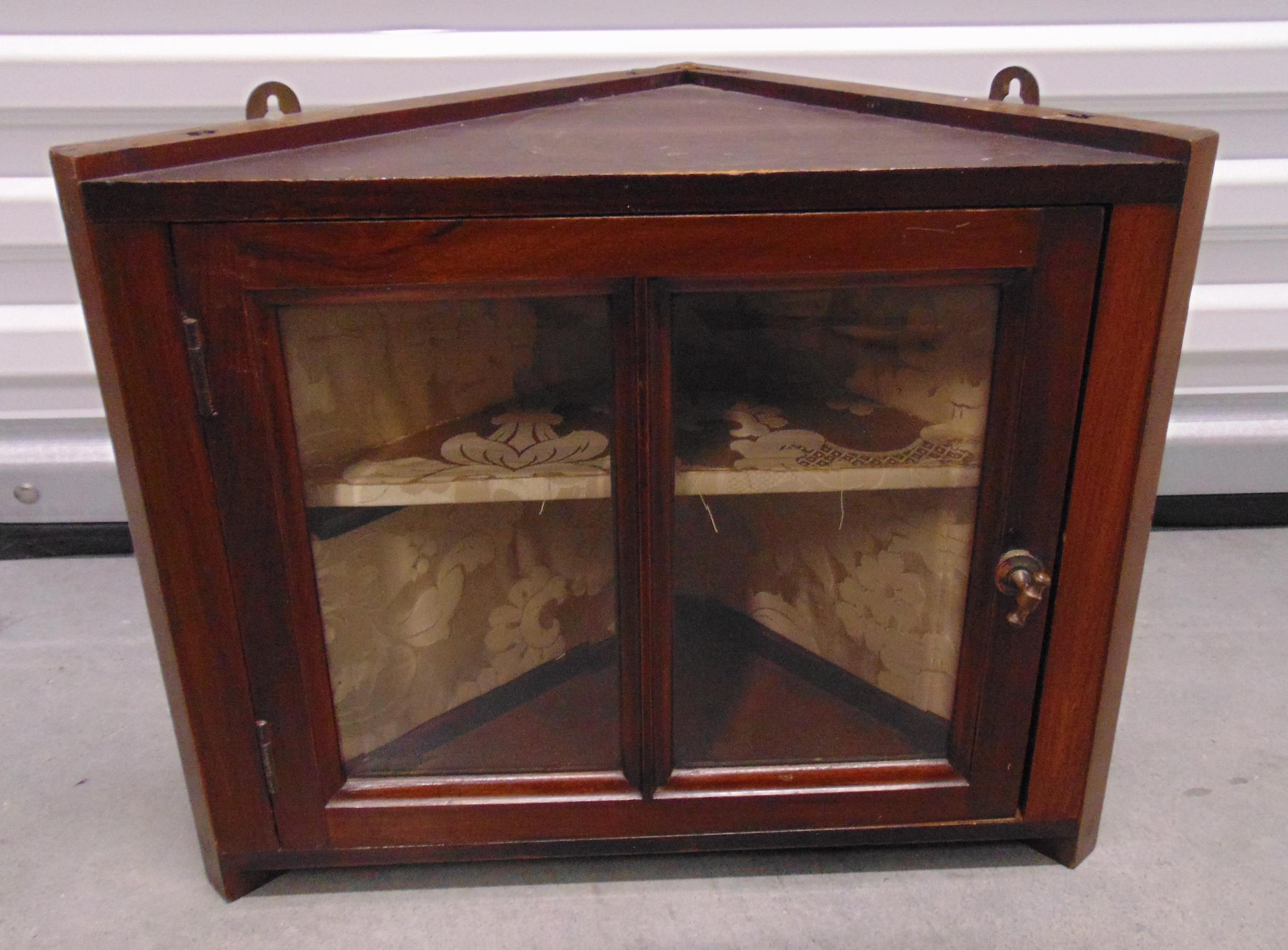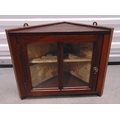 A mahogany wall hanging corner cabinet with a single shelf and hinged glazed door, 35 x 43 x 23cm