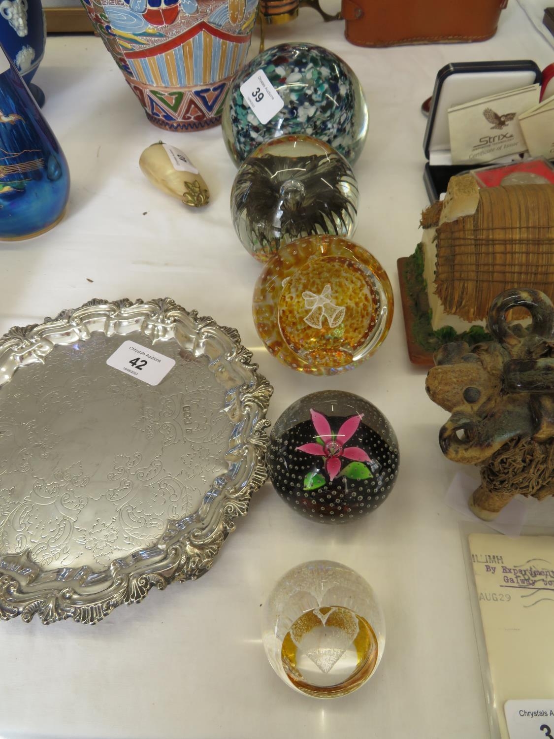 Five glass paper weights including Caithness