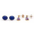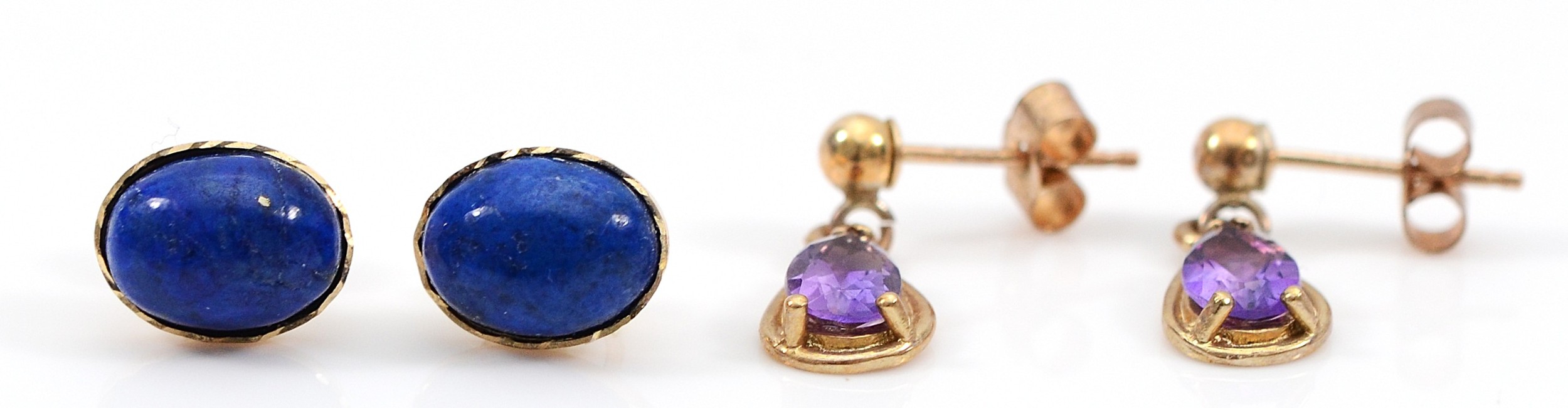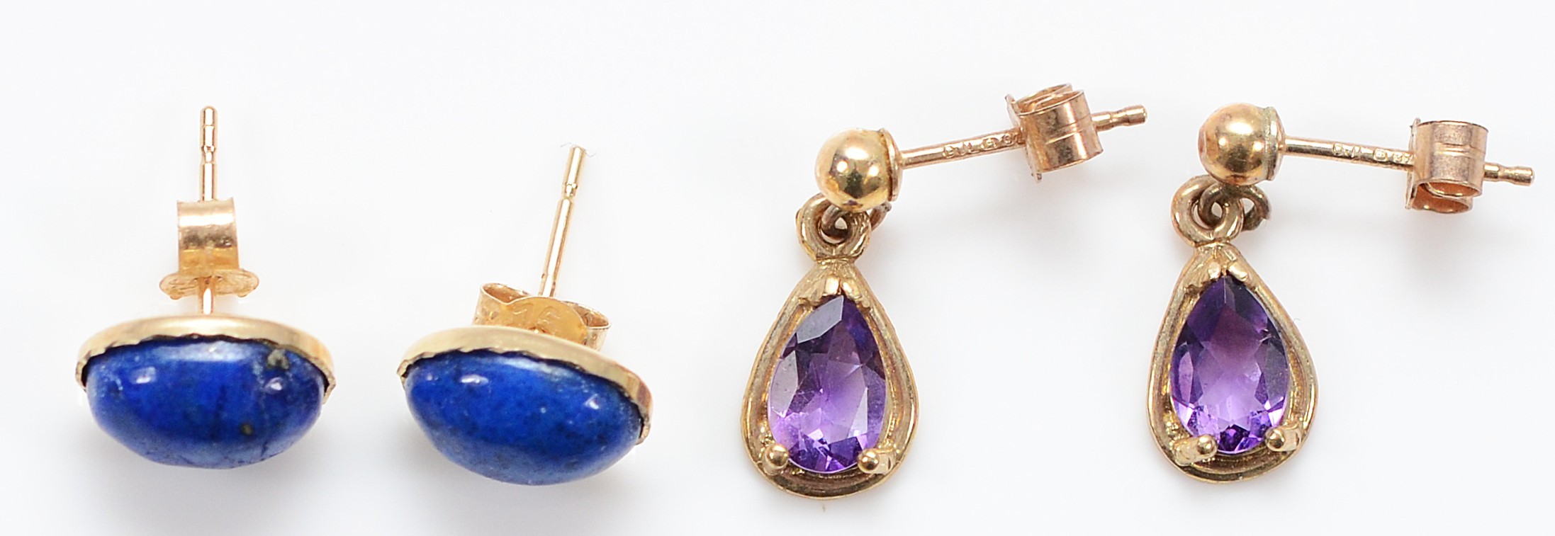 A pair of 9ct gold amethyst drop earrings with a pair of 9ct gold lapis lazuli earrings with scroll backs, 2g