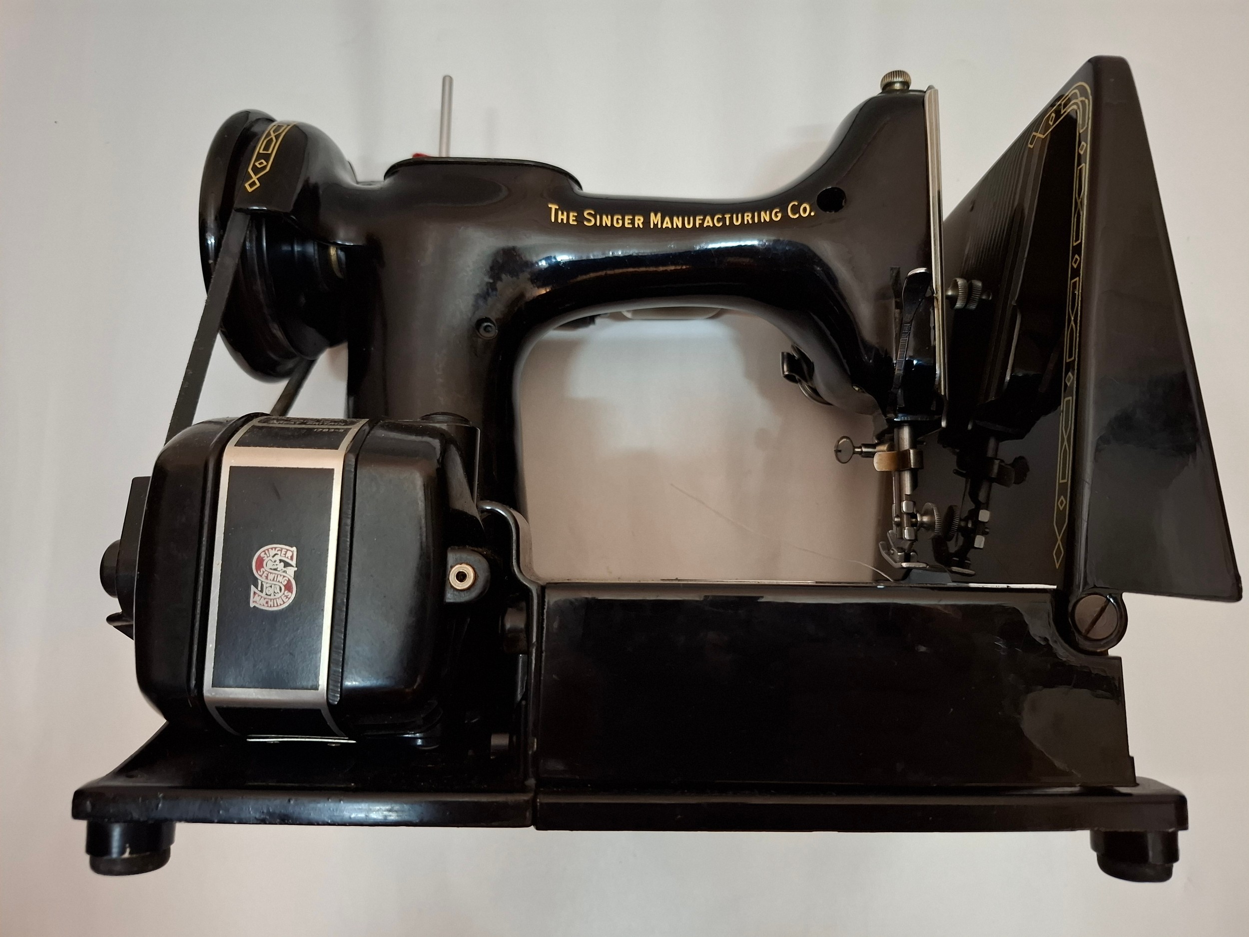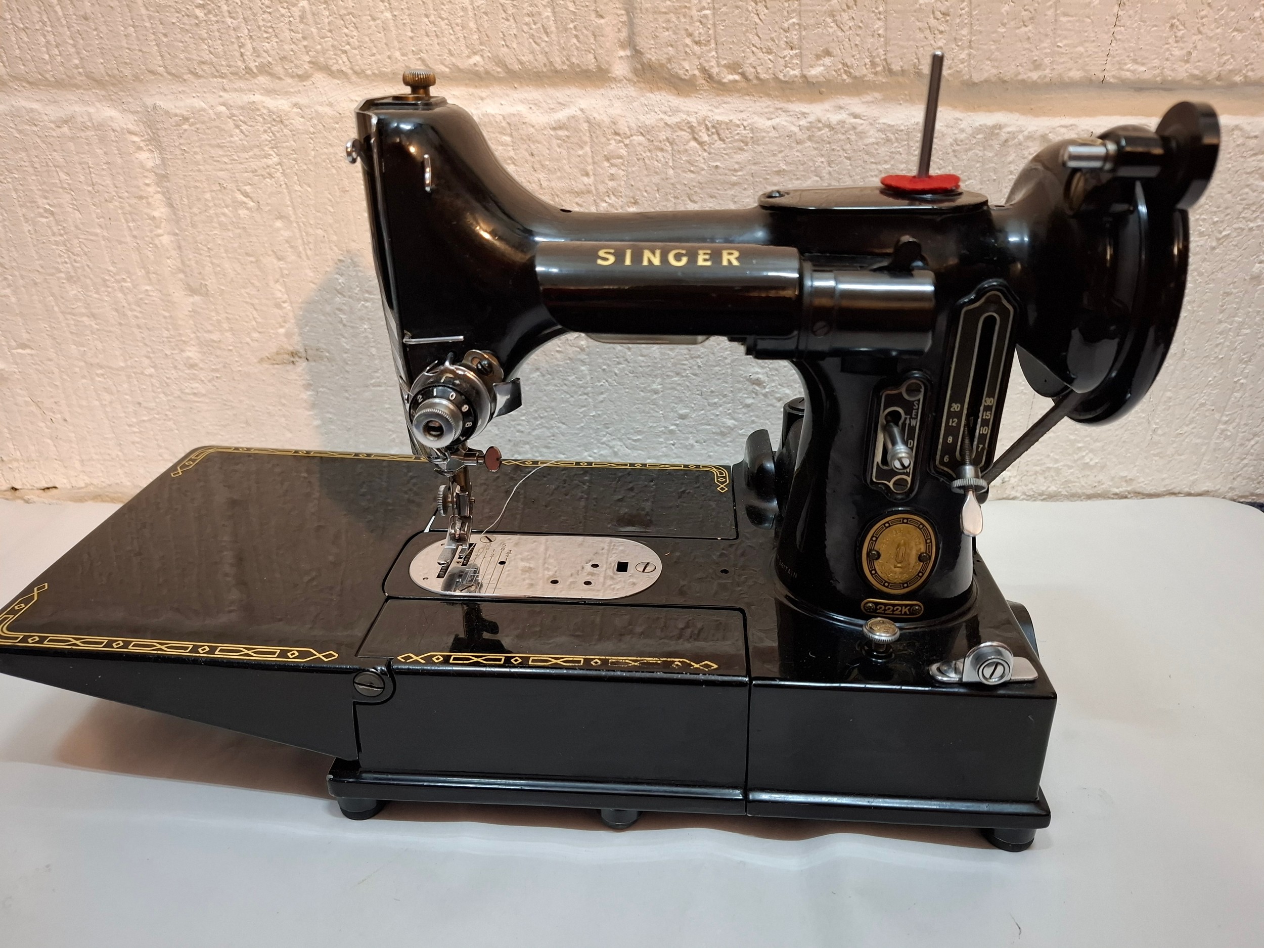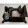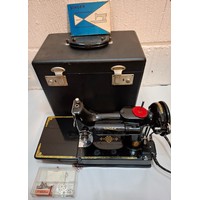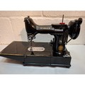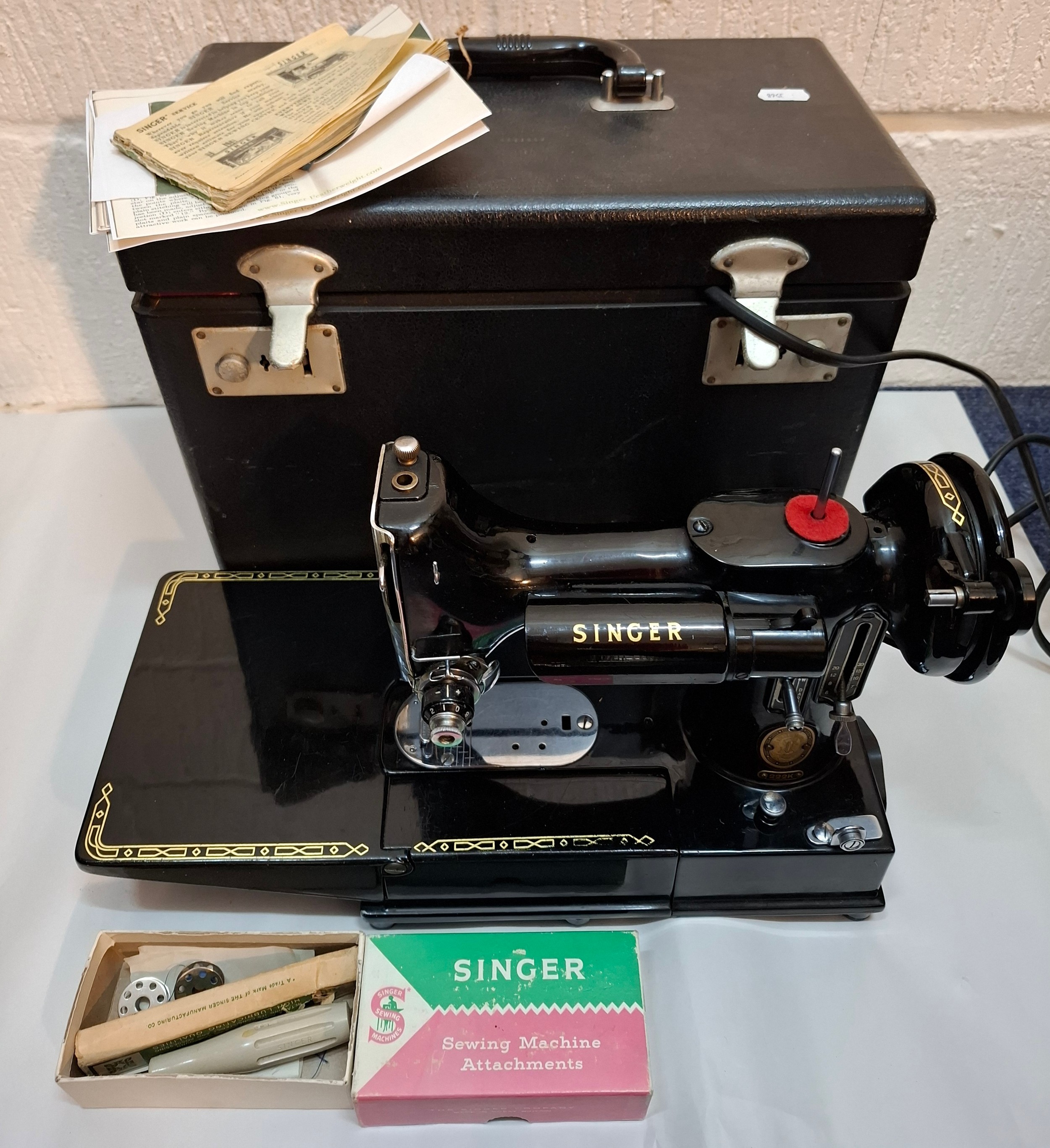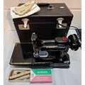 A 1957 Singer Feather weight 222K electric sewing machine serial no:EM957054 with case and accessories. Location: 1-3