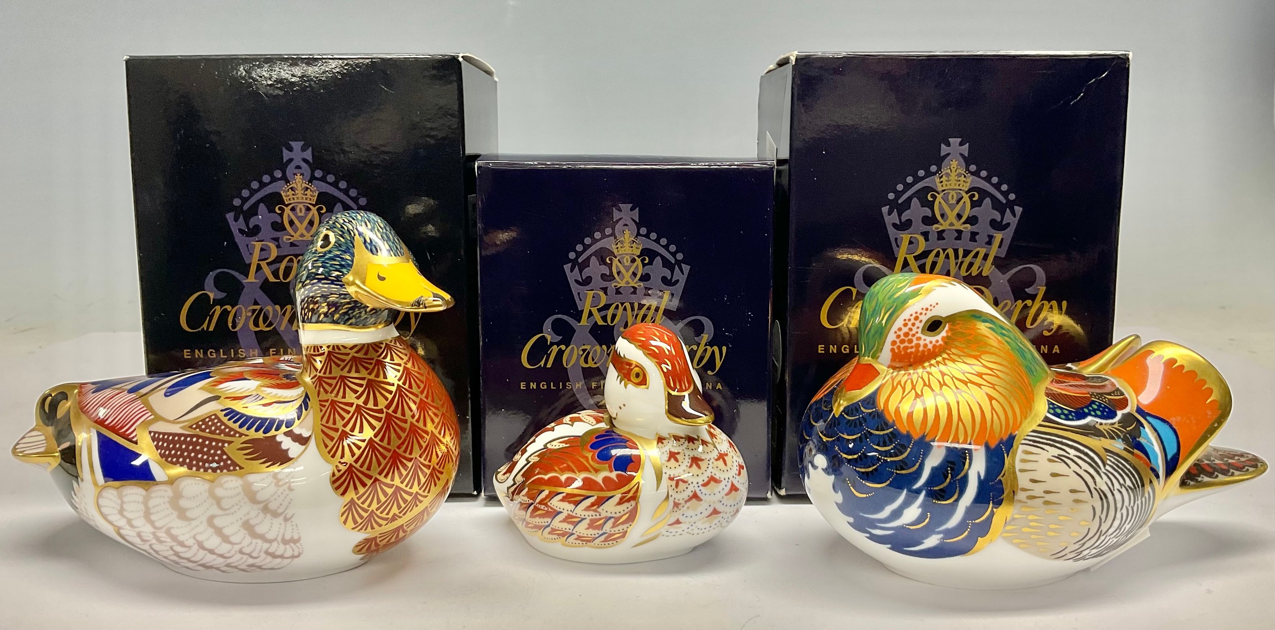 A Royal Crown Derby paperweight, Mallard, gold stopper, 15cm long, printed mark in red, boxed; others, Mandarin Duck, gold stopper, 12cm, printed mark in red, boxed; Swimming Duckling, gold stopper, 7.5cm long, boxed (3)