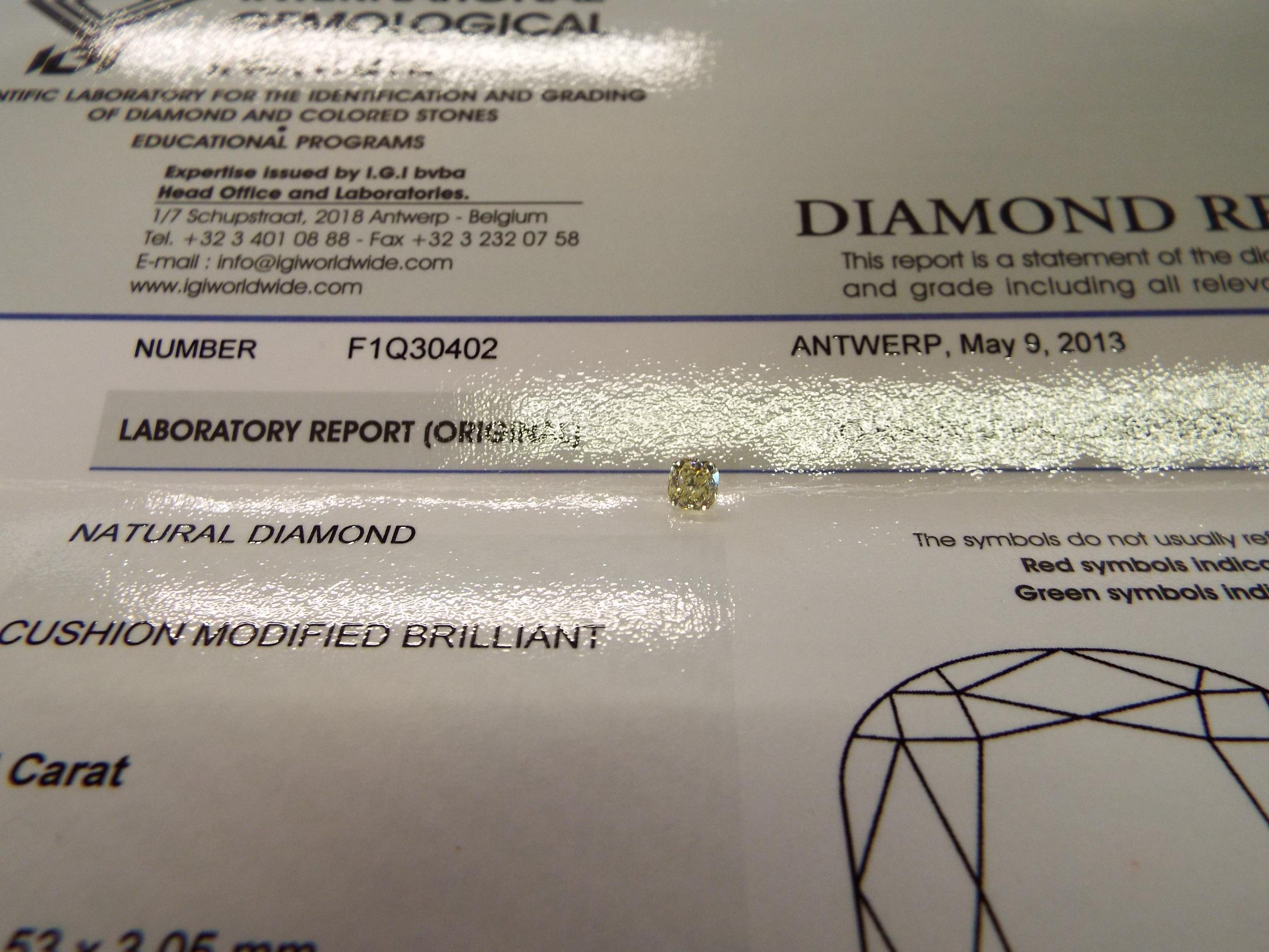 A 0.54 carat cushion modified brilliant cut natural fancy light yellow diamond VVS2 measuring 4.69 x 4.53 x 3.05mm