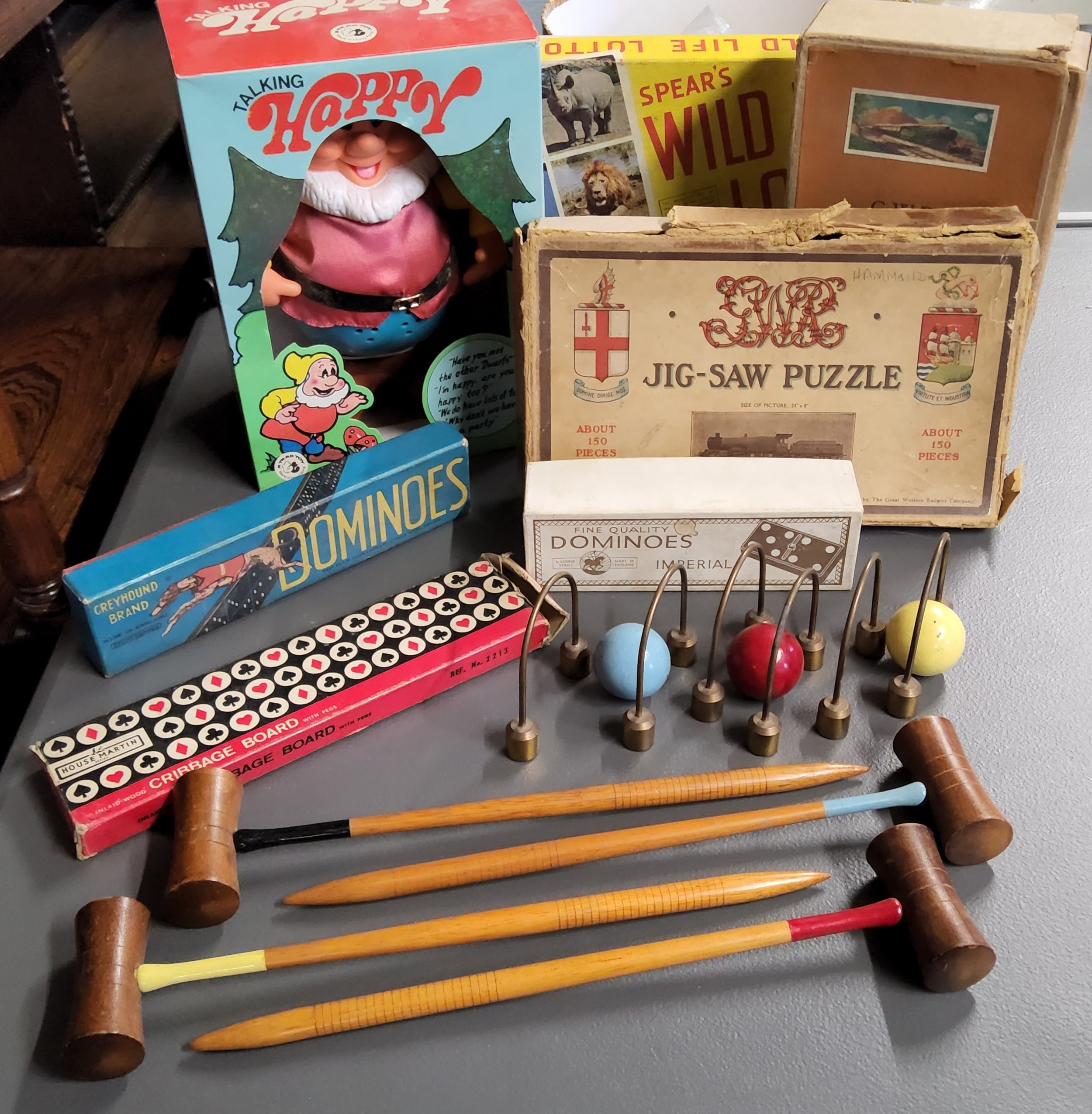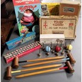 Juvenalia including a Table Croquet Game part set only, 4 mallets, 3 balls and 6 brass hoops; another modern lawn croquet set; a Trad Toys Walt Disney Talking Happy from Snow White; Chad Valley G.W.R. jigsaws Cornish Riviera & Caerphilly Castle (not checked); vintage games etc.