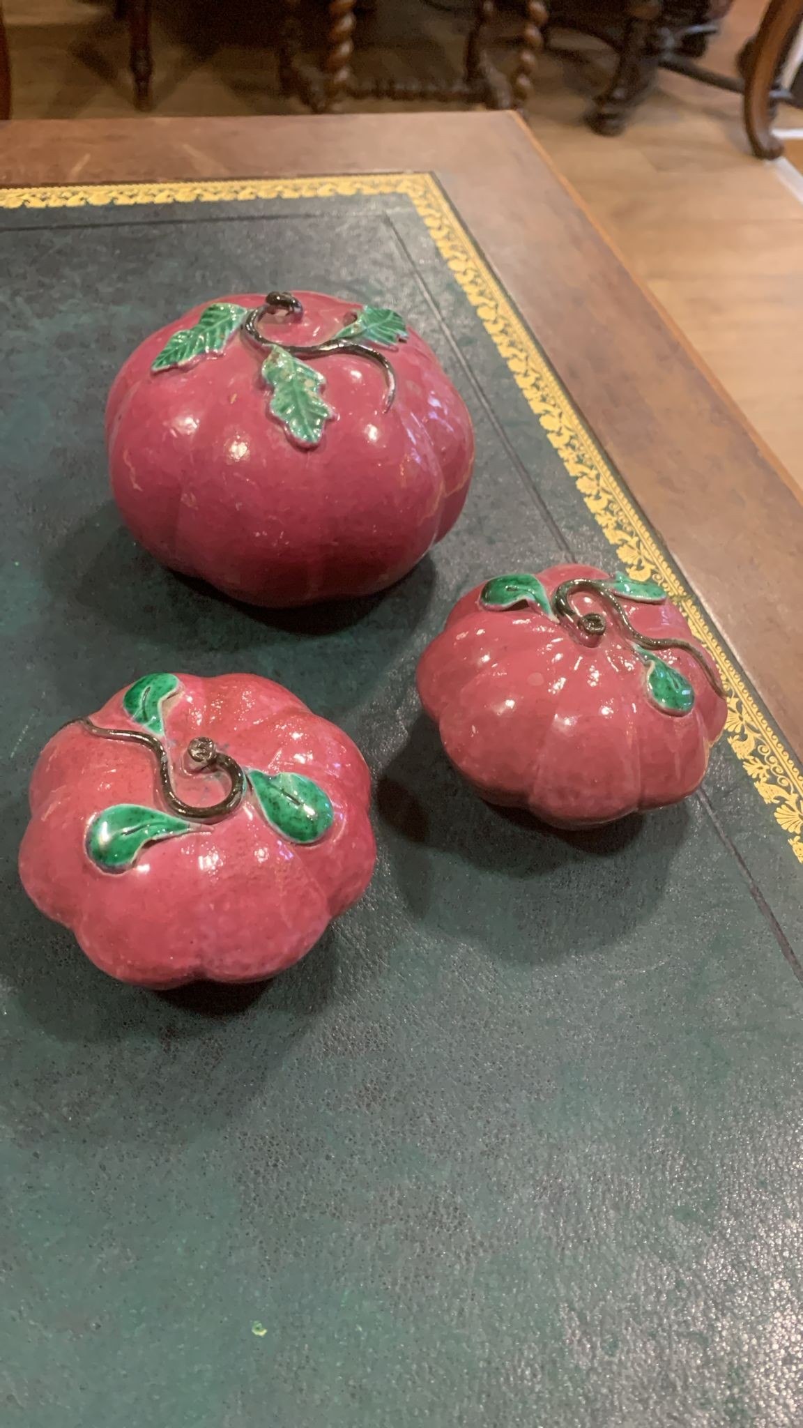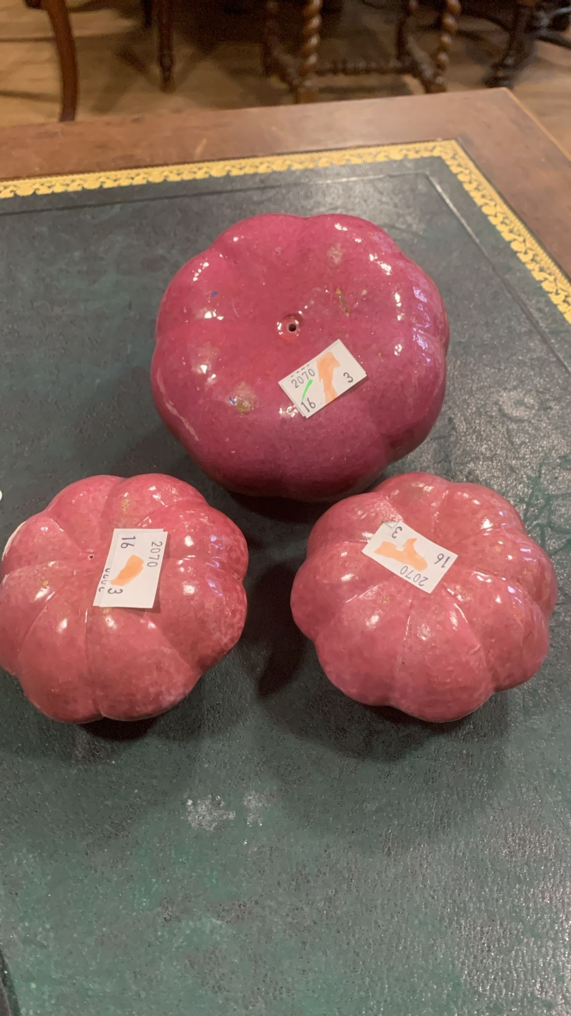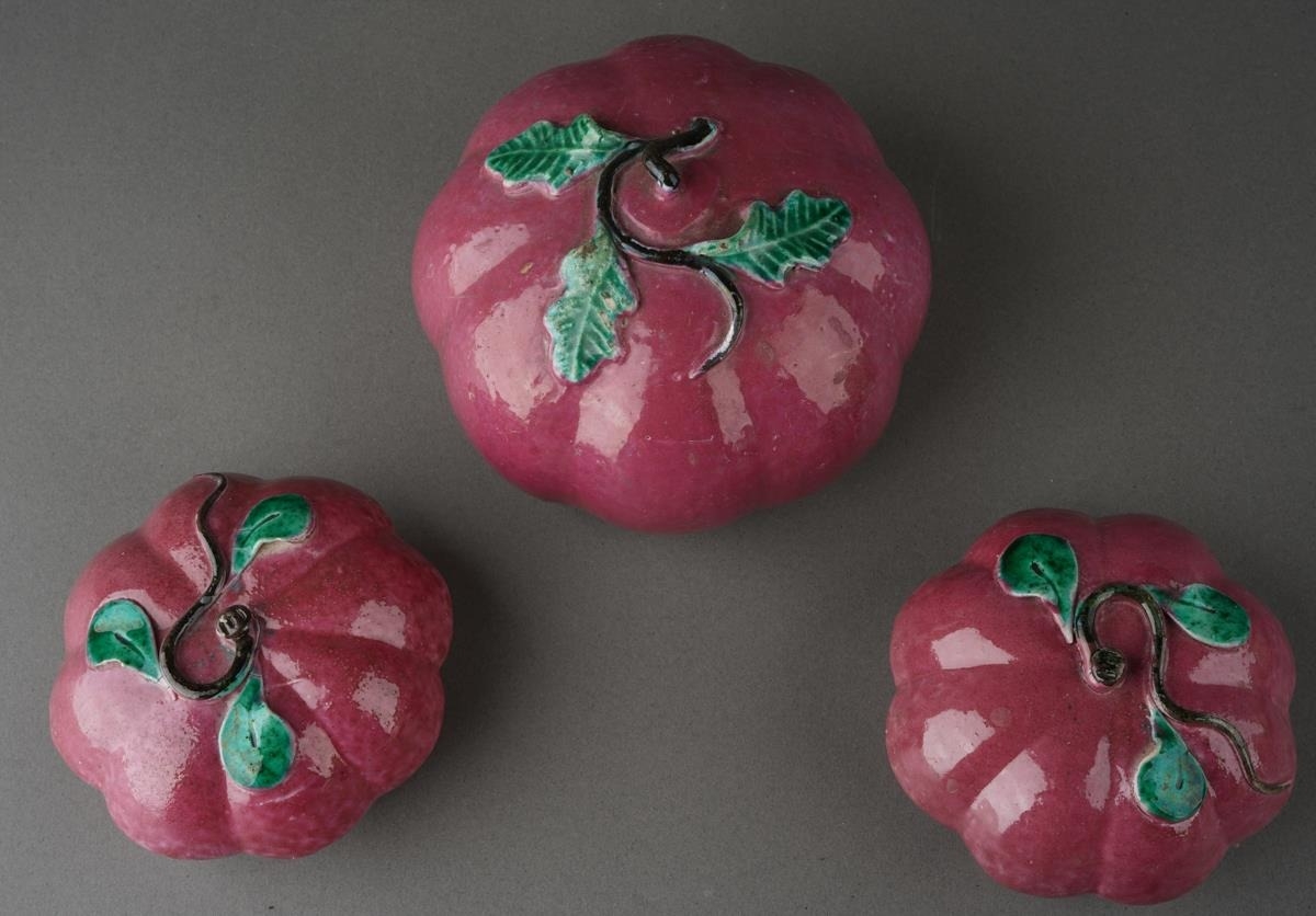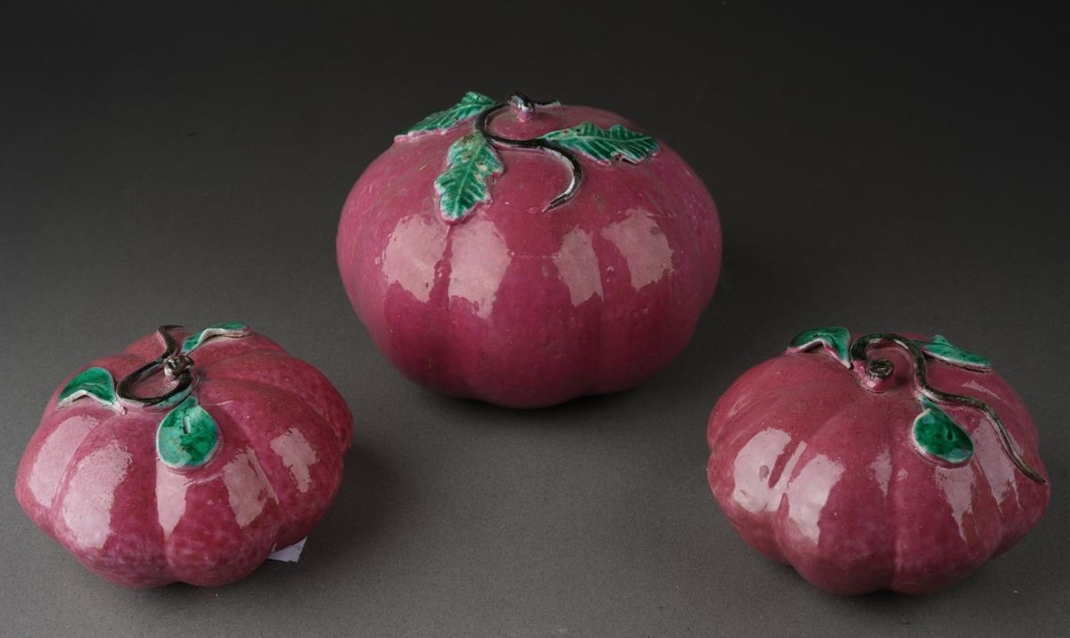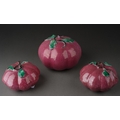 Three Chinese ceramic Altar fruits comprising three various purple pumpkins [3]