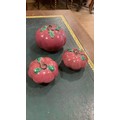 Widths range 9cm to 12cm. Heights 4.5cm and 8cm. One smaller fruit has a chipped leaf and all have firing cracks. Larger fruit has some glaze scuffs to leaves.