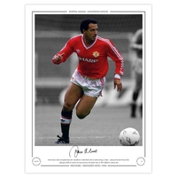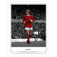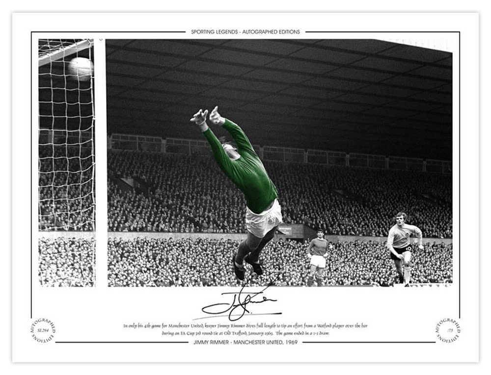 Autographed JIMMY RIMMER 1969 Limited-Edition : A superbly produced Limited Edition print measuring 16 x 12, depicting Man United goalkeeper JIMMY RIMMER at full stretch, trying in vain to prevent a goal for Watford during an FA Cup fourth round tie at Old Trafford in 1969, a replay was needed following a 1-1 draw, limited to just 75 editions it has been signed to the lower border in fine black marker.
