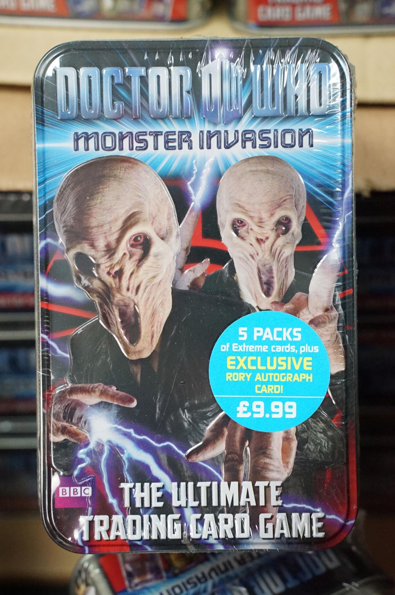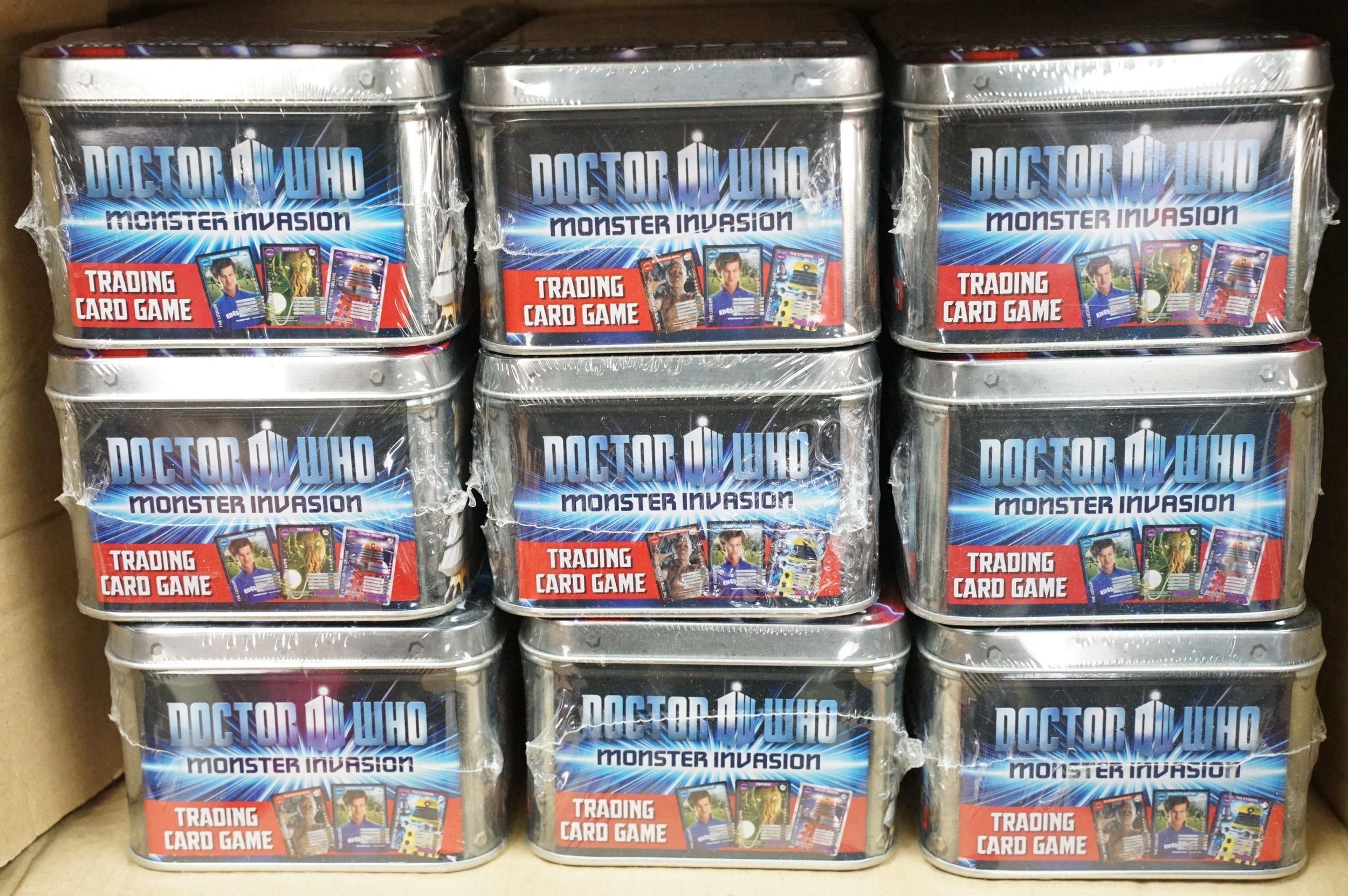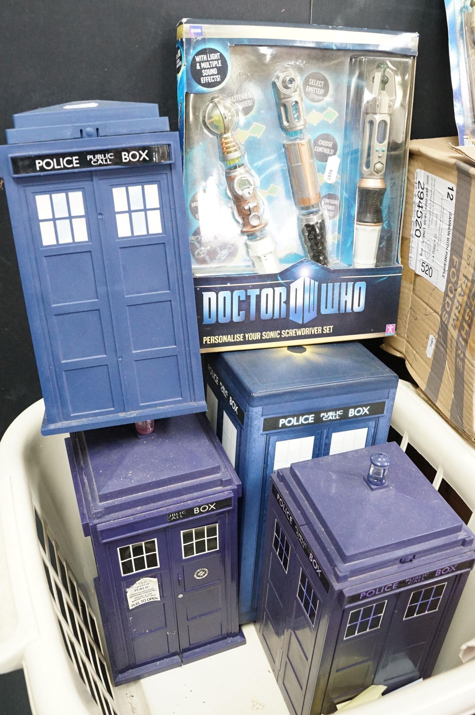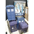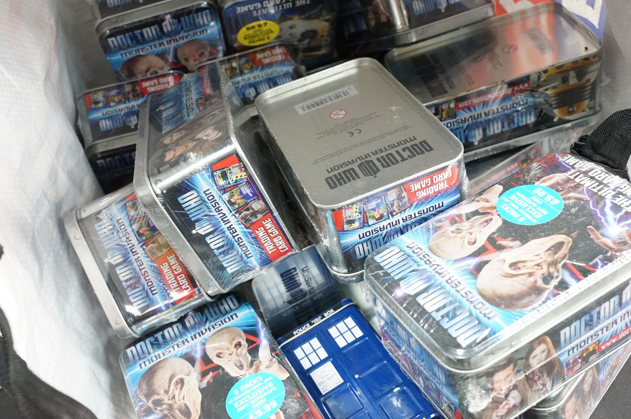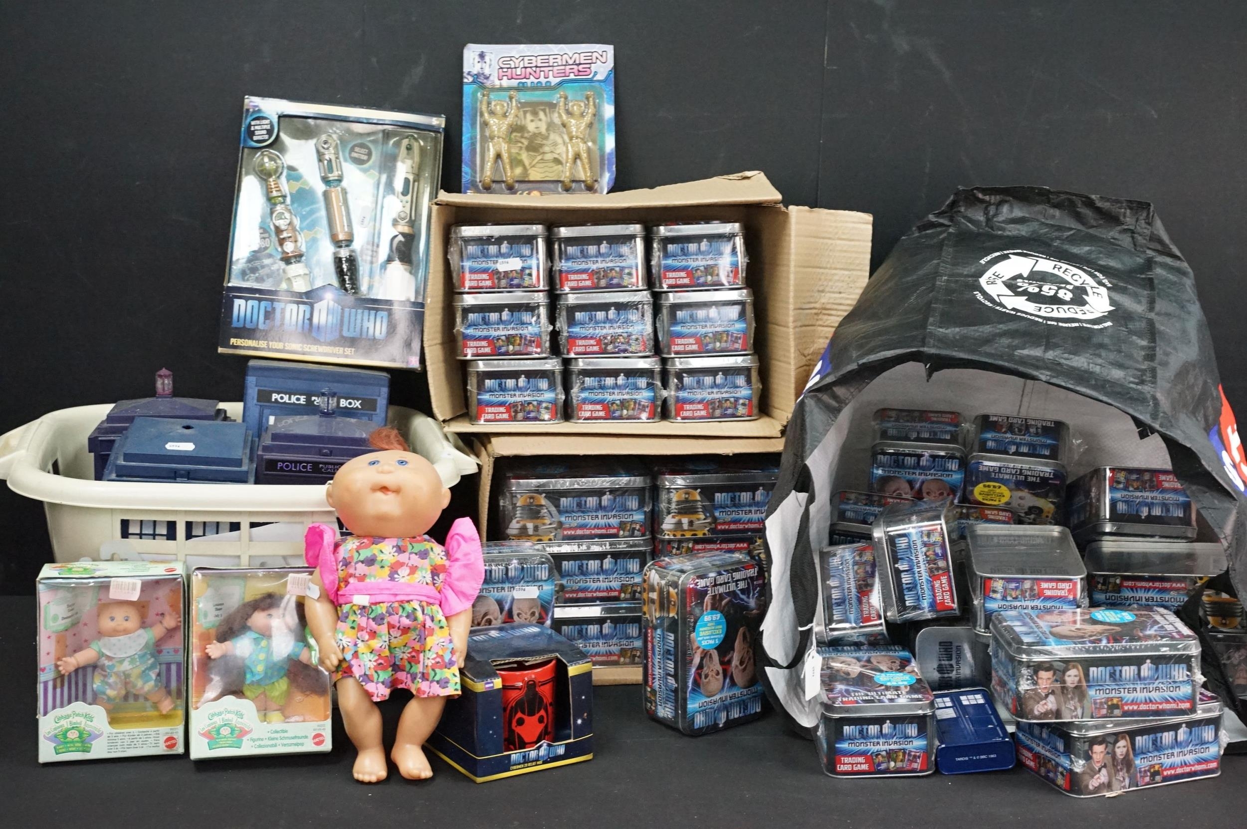 Quantity of mixed Doctor Who toys to include over 40 x sealed Monster Invasion Trading Card Game, Doctor Who Sonic Screwdriver Set, 4 x Tardis' including trading card examples, etc (3 Boxes)