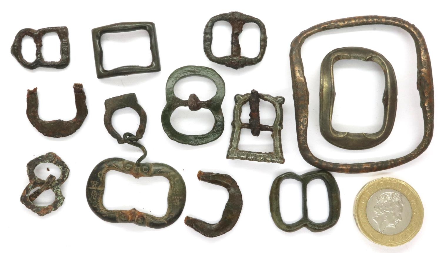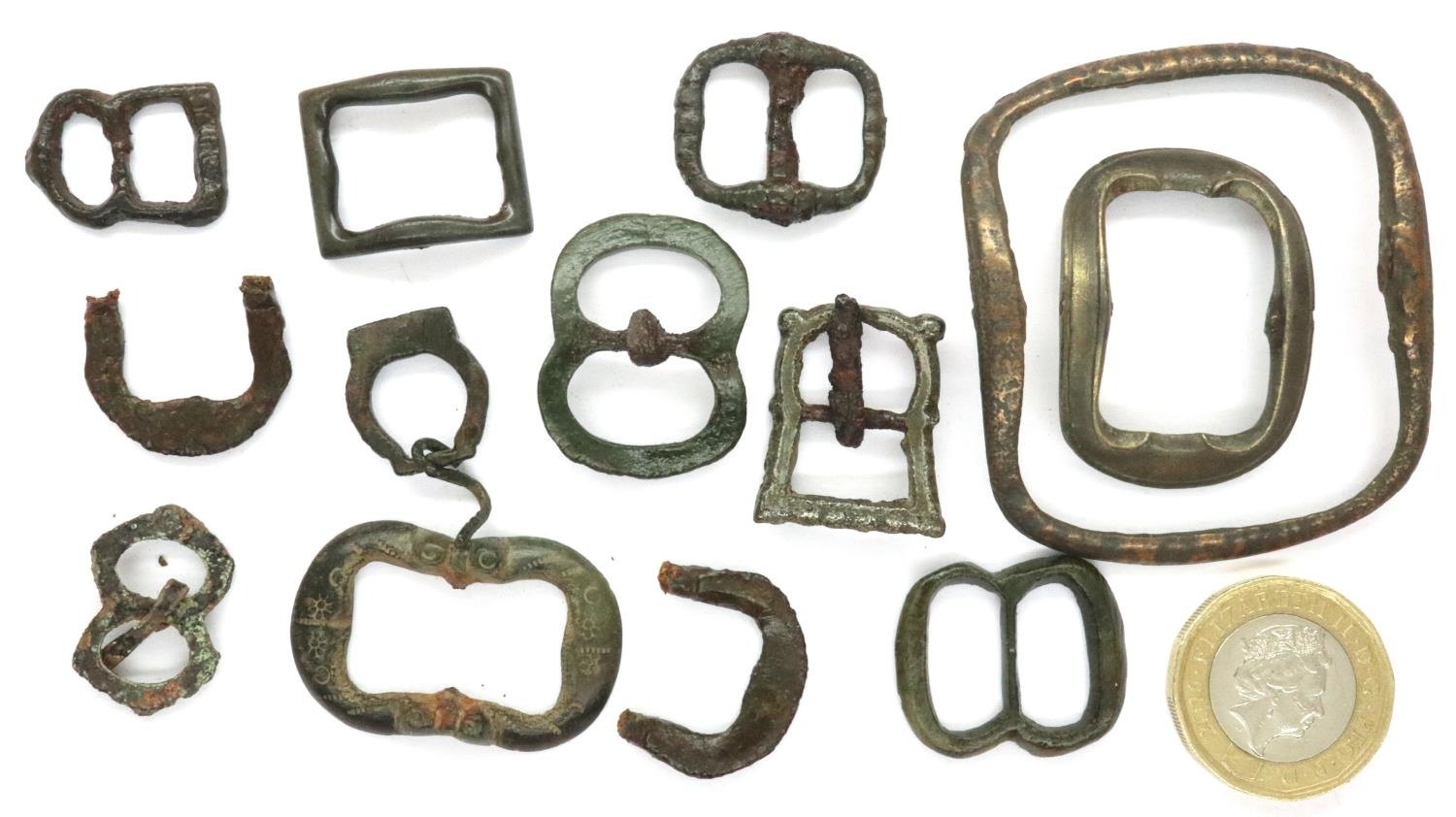 Mostly UK Civil War belt buckles and hasps, largest L: 50 mm. P&P Group 0 (£5+VAT for the first lot and £1+VAT for subsequent lots)