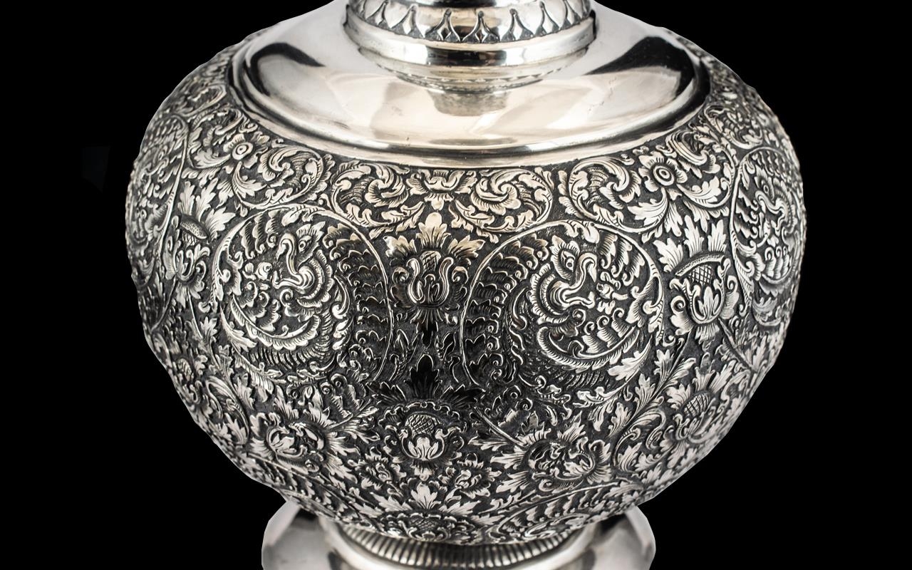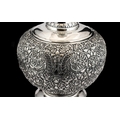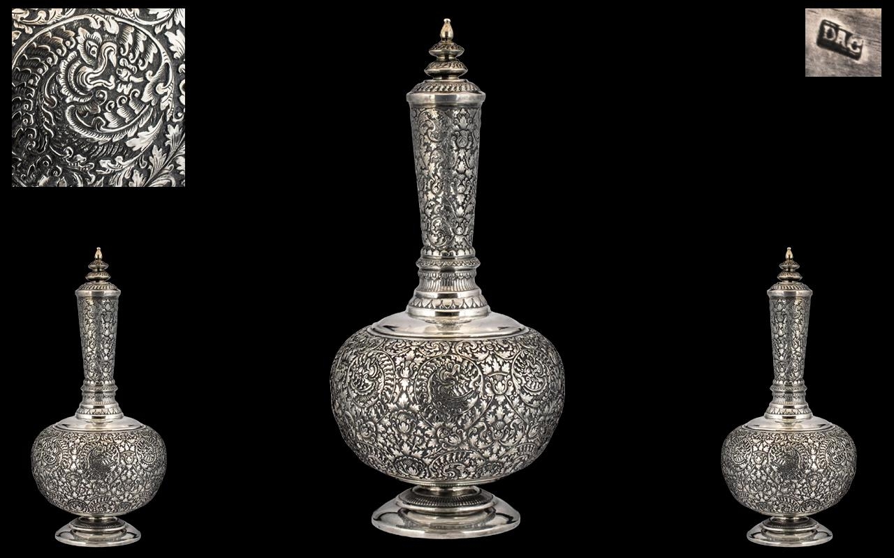 Anglo Indian 'Kutch' Superb Late 19th Century Solid Silver Repousse Lidded Vase. Circa 1880, of excellent form and distinguished by its finely worked foliate and floral repousse design. 11.75'' - 29 cm tall. All aspects of condition excellent.