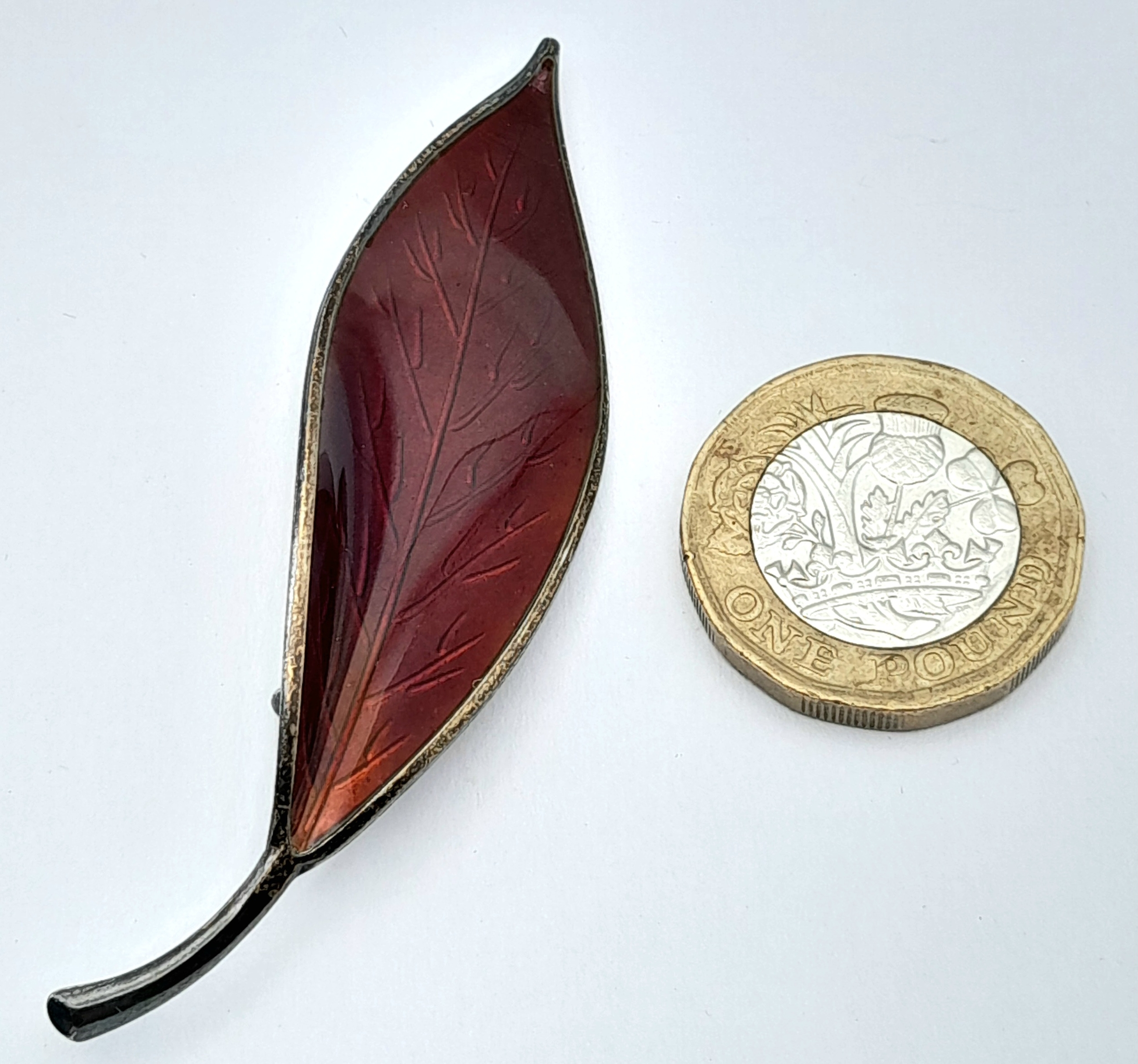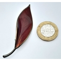 A David Andersen Sterling Silver and Red Enamel Leaf Shaped Pin Brooch. Hallmarked D-A 925S Norway Sterling, Total Weight 8.48 Grams.