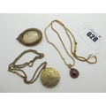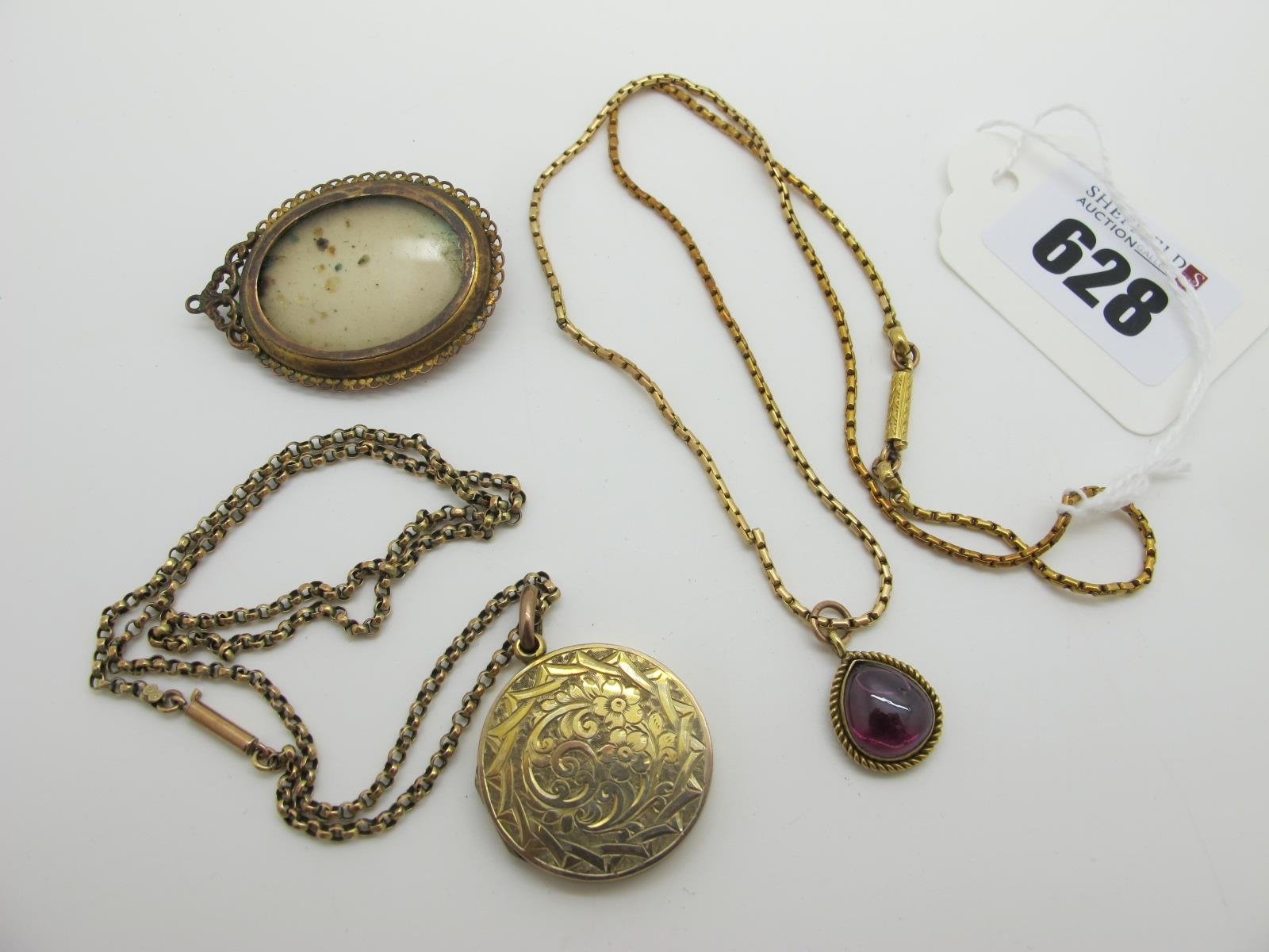 A Fancy Link Chain, suspending cabochon pendant (closed back); together with a decorative circular locket pendant, allover foliate engraved, on a chain stamped "9c"; and an oval locket pendant (damaged).