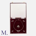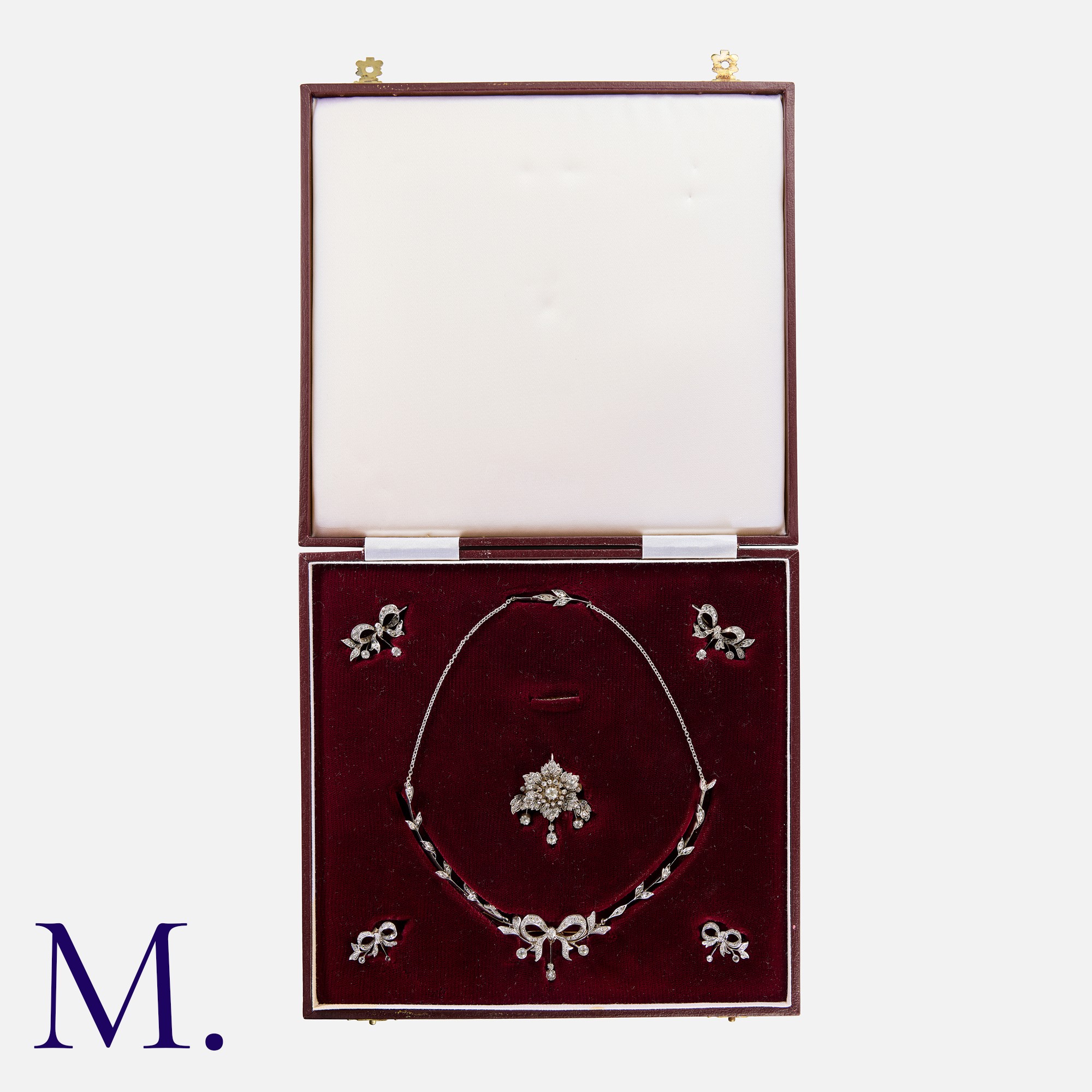 A Diamond Suite in yellow gold and silver. Comprising a necklace, a brooch and a pair of earrings. of floral and bow design, set with old cut and rose cut diamonds. Additional bow motif necklace extensions. All diamonds totalling approximately 5.0ct. Unmarked tests indicate 15 carat gold and silver.