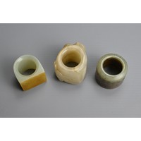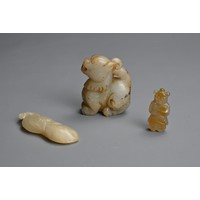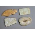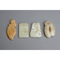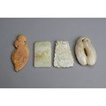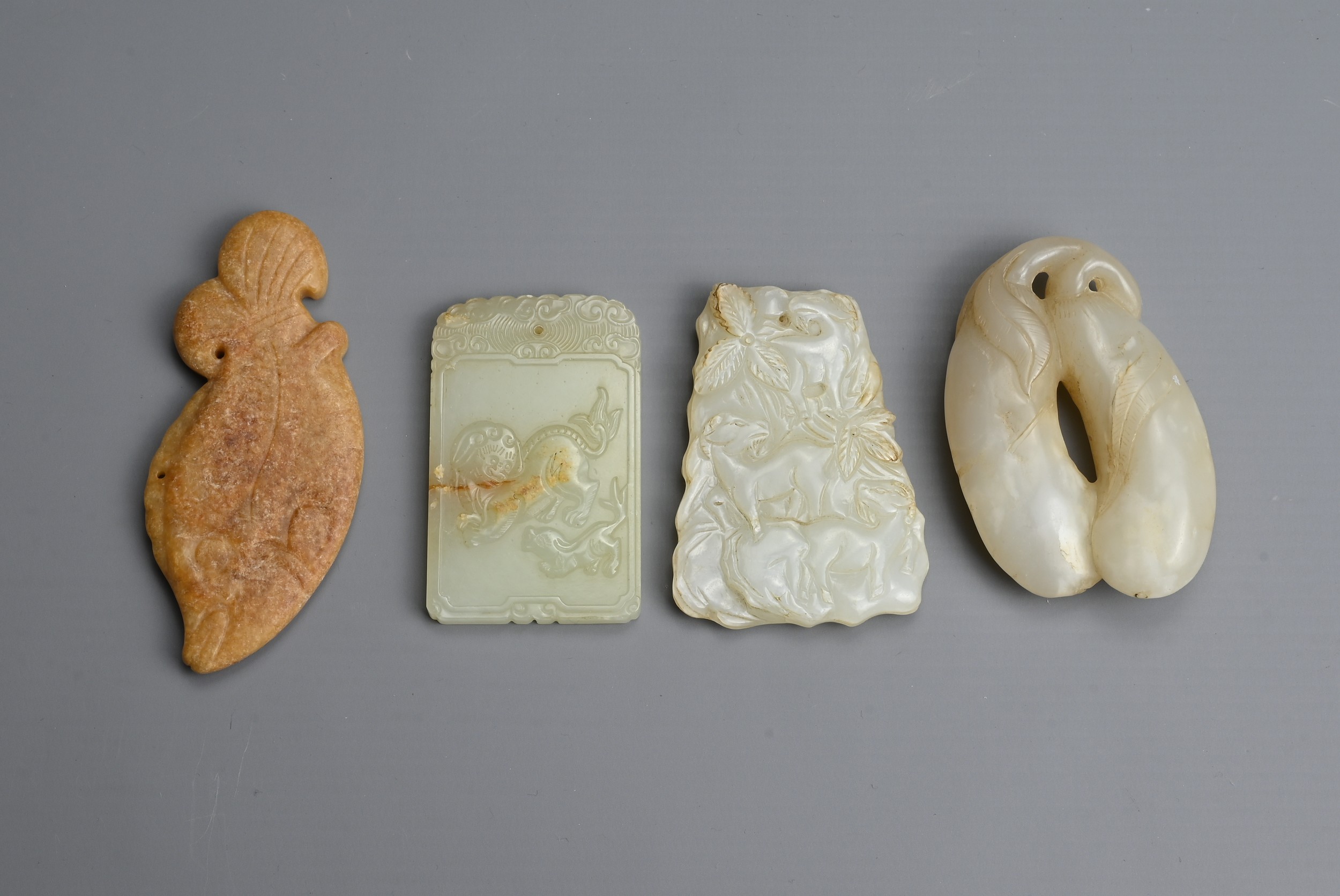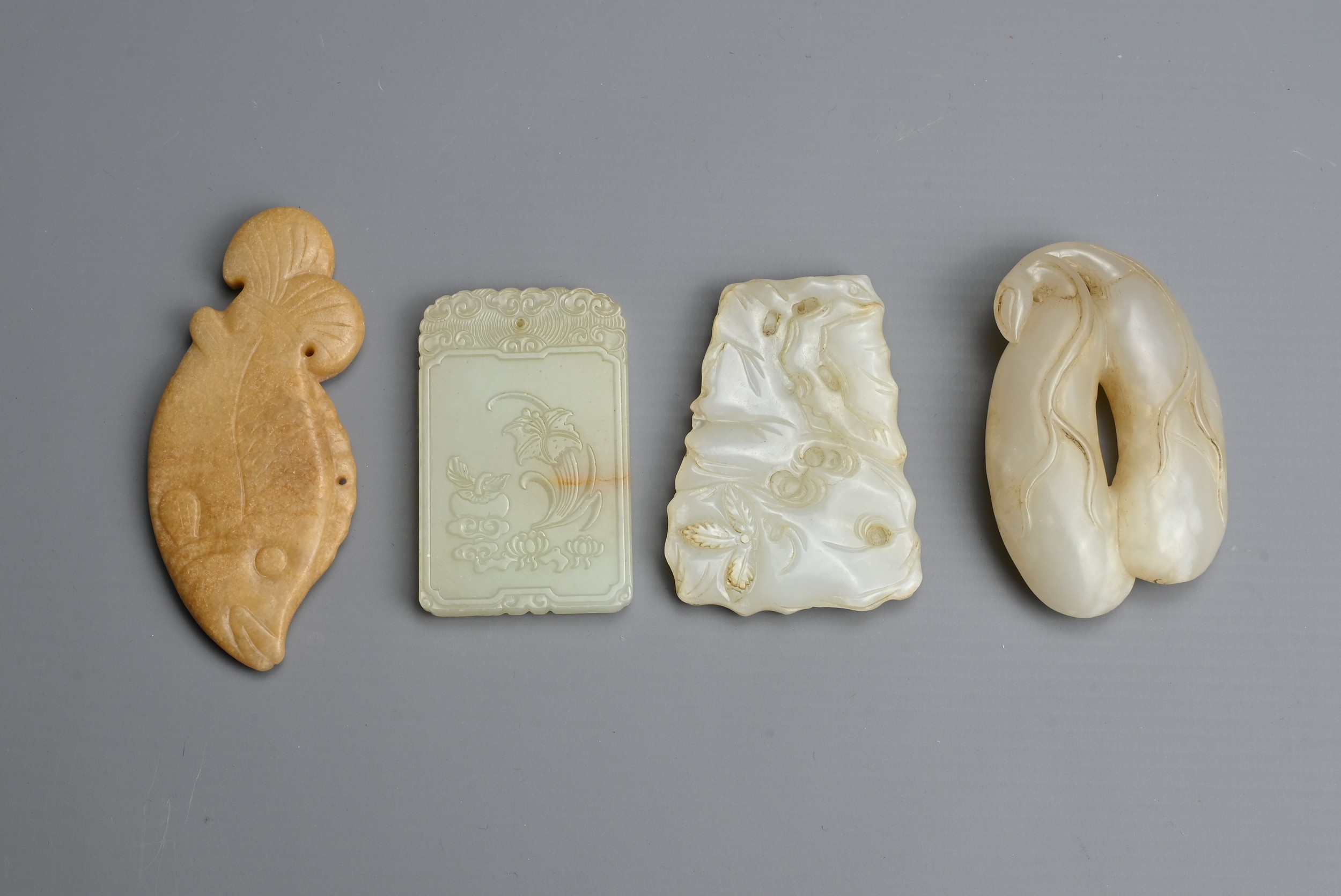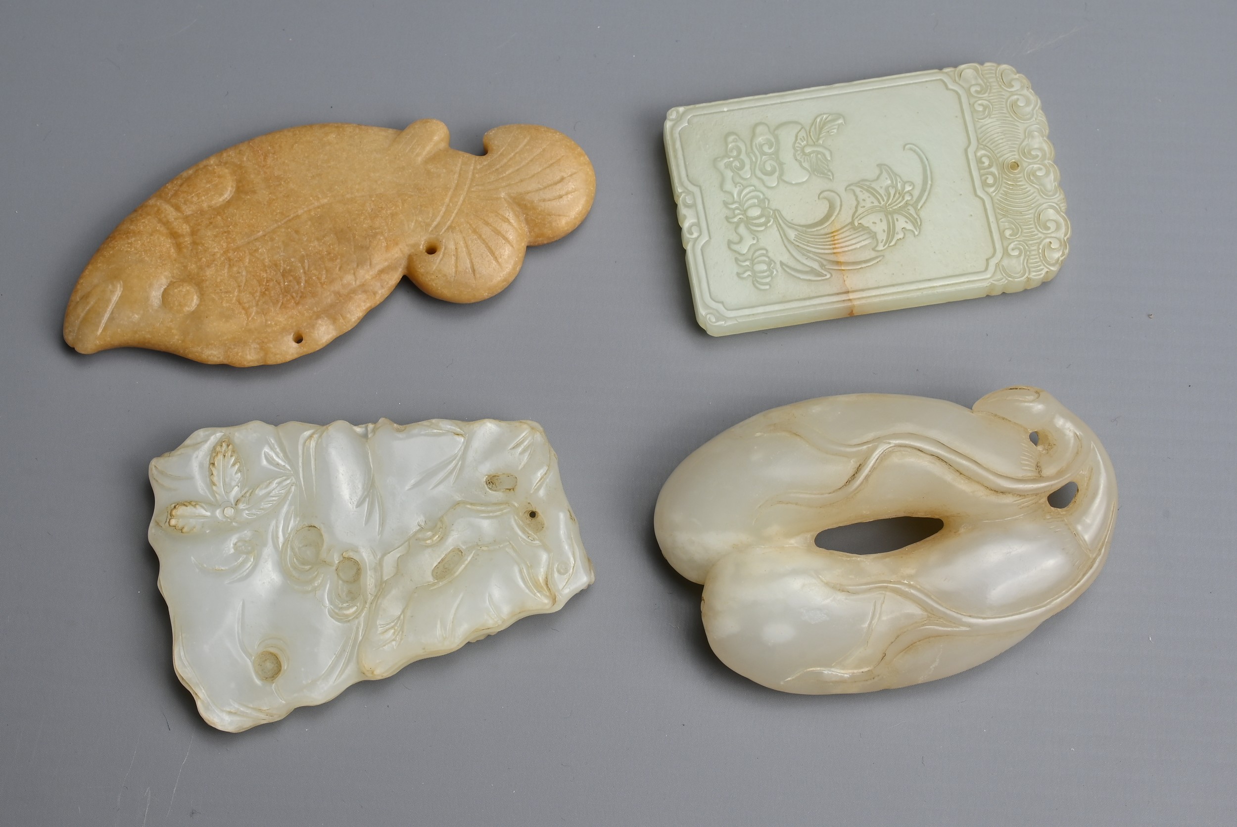 FOUR CHINESE CARVED JADE AND STONE PENDANTS. A pale celadon rectangular pendant carved in relief with lion dogs; A whitish pendant carved in relief with goat; A melon group; Together with a stone pendant ion the form of a fish. Approx. 6-9cm lengths. (4)