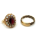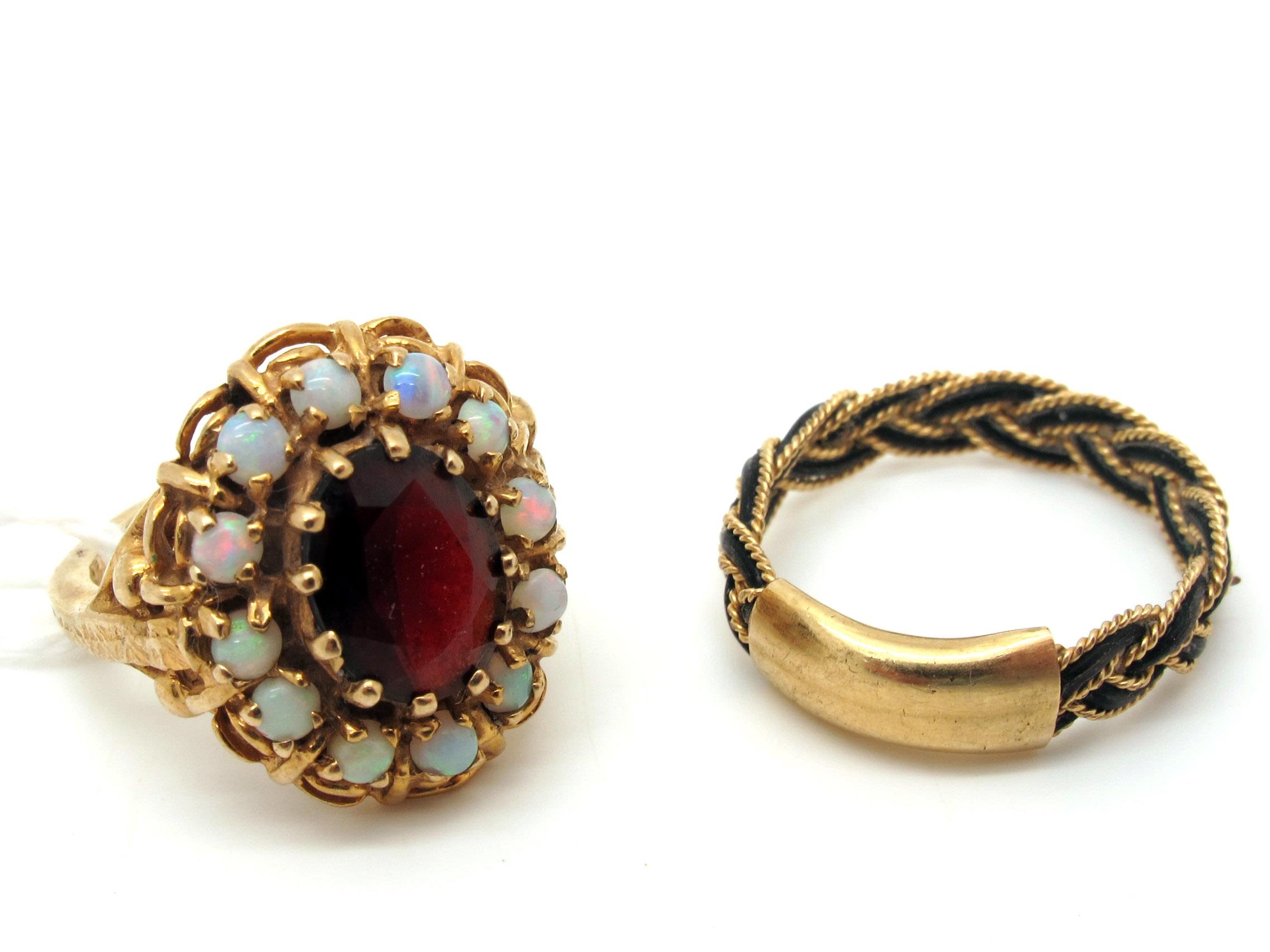 A 9ct Gold Opal and Garnet Cluster Ring, claw set to the centre (finger size I); together with a woven mourning style band. (2)