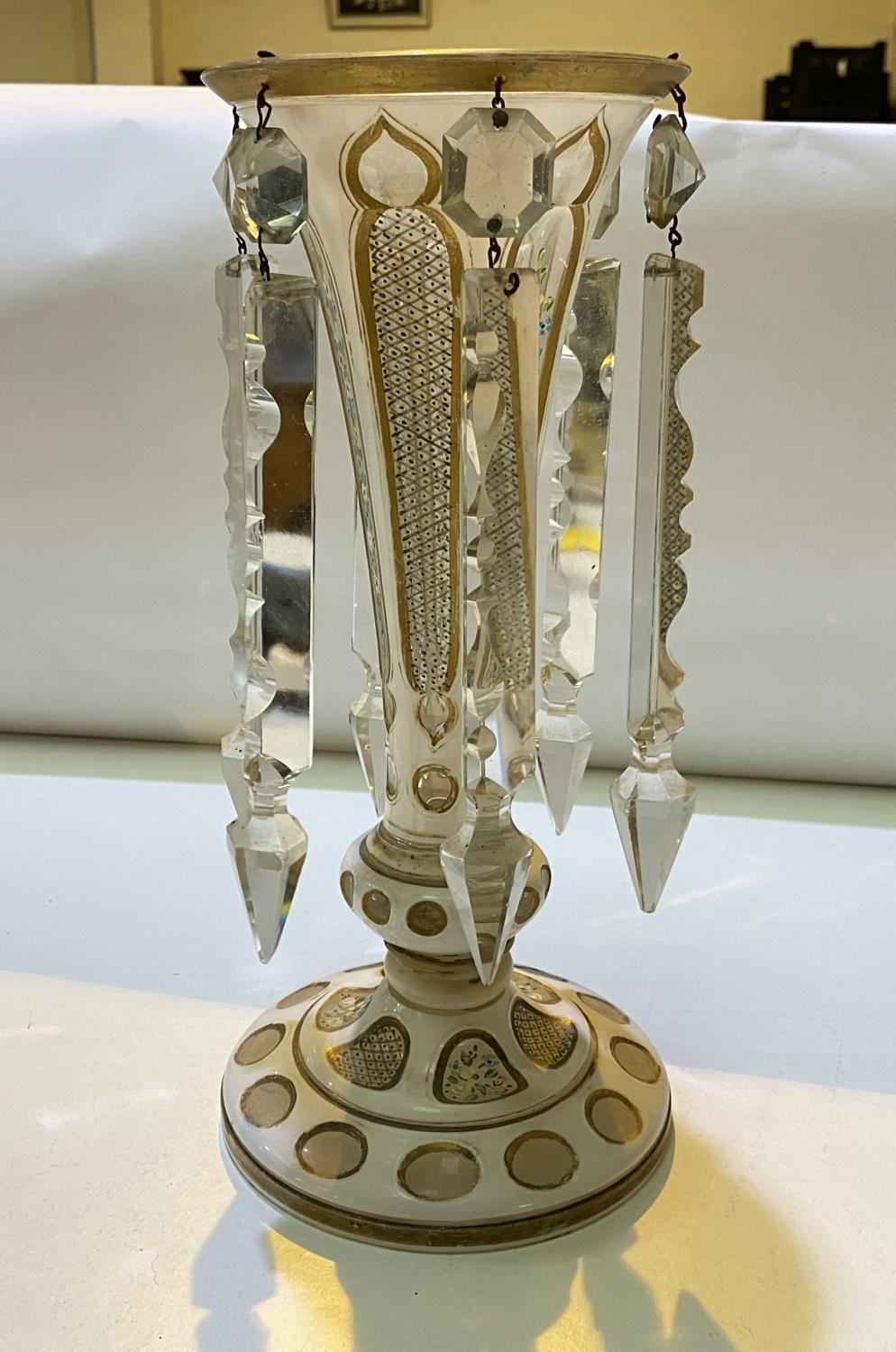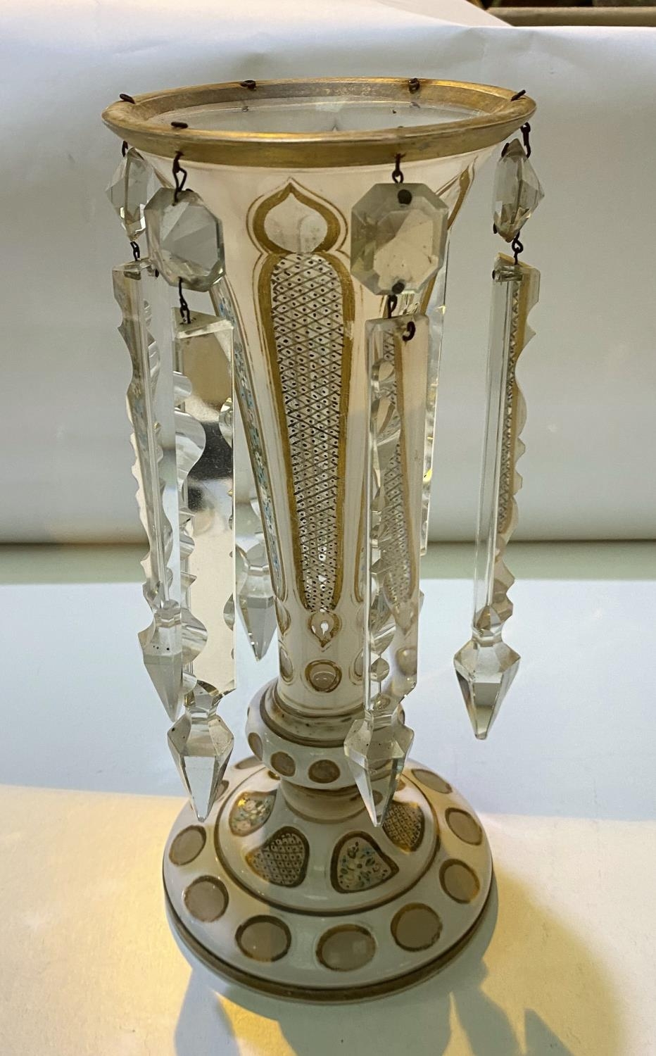 A 19th century Bohemian lustre, gilt overlaid, white ground and floral decoration, height 31cm