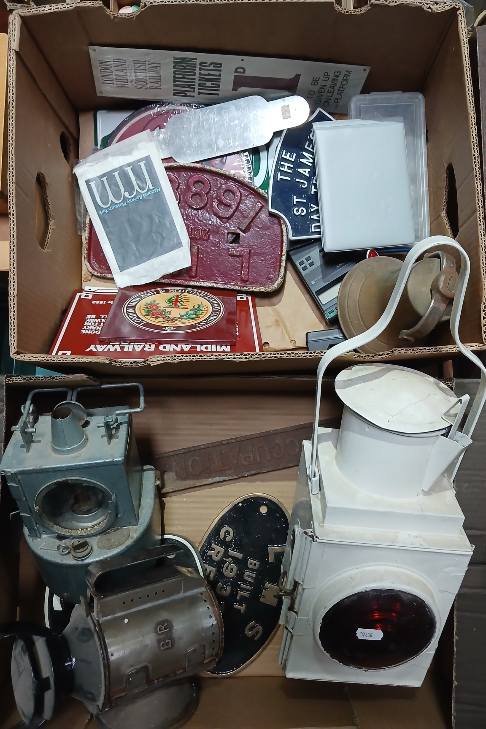 Two boxes of railway collectables including cast metal plates, lamps etc.