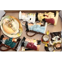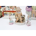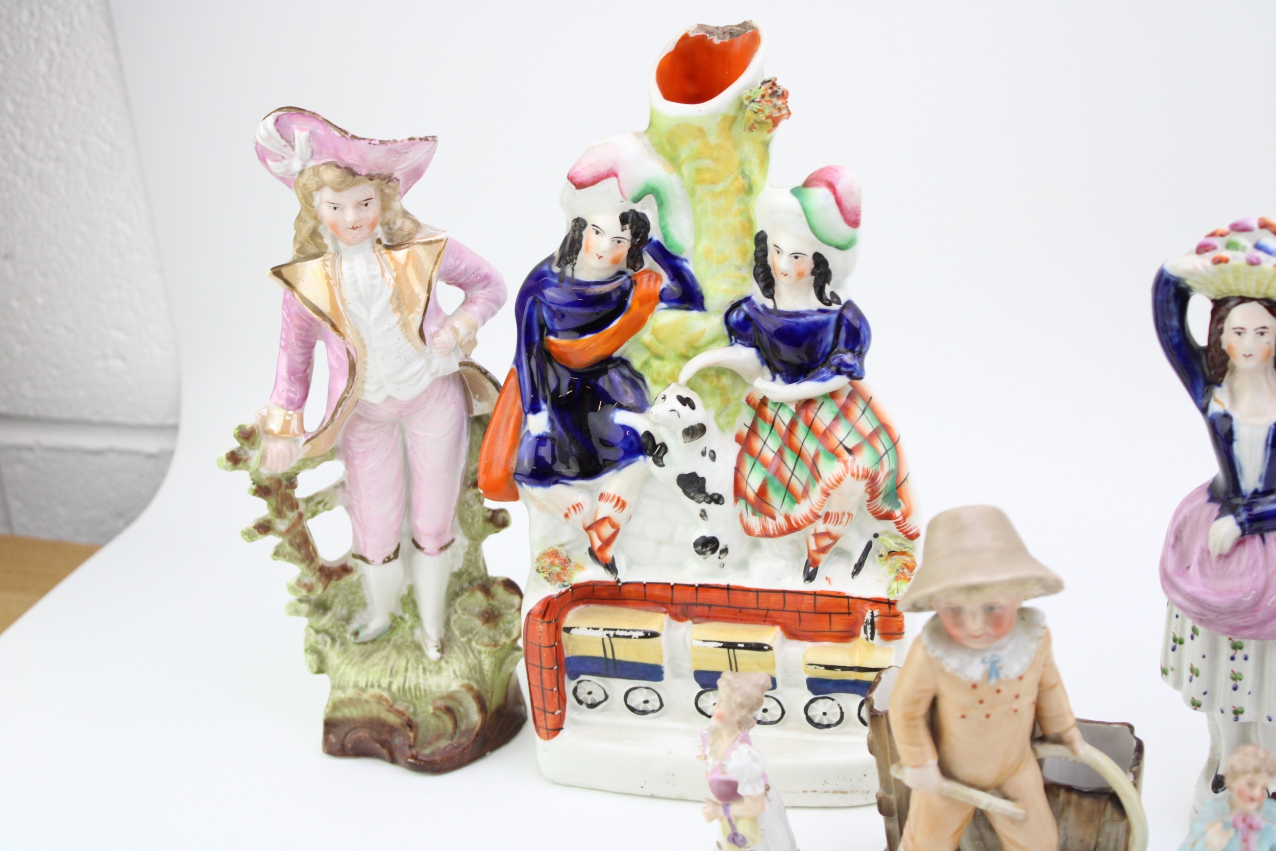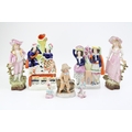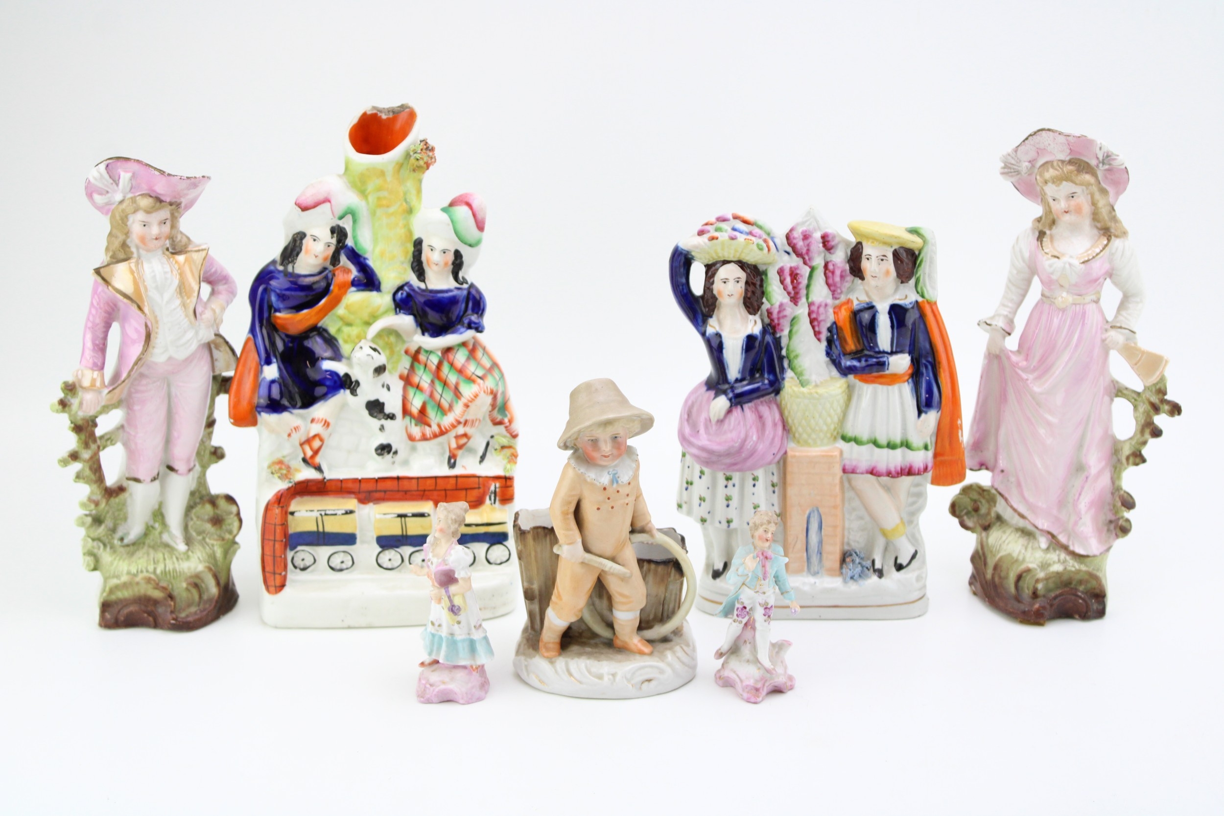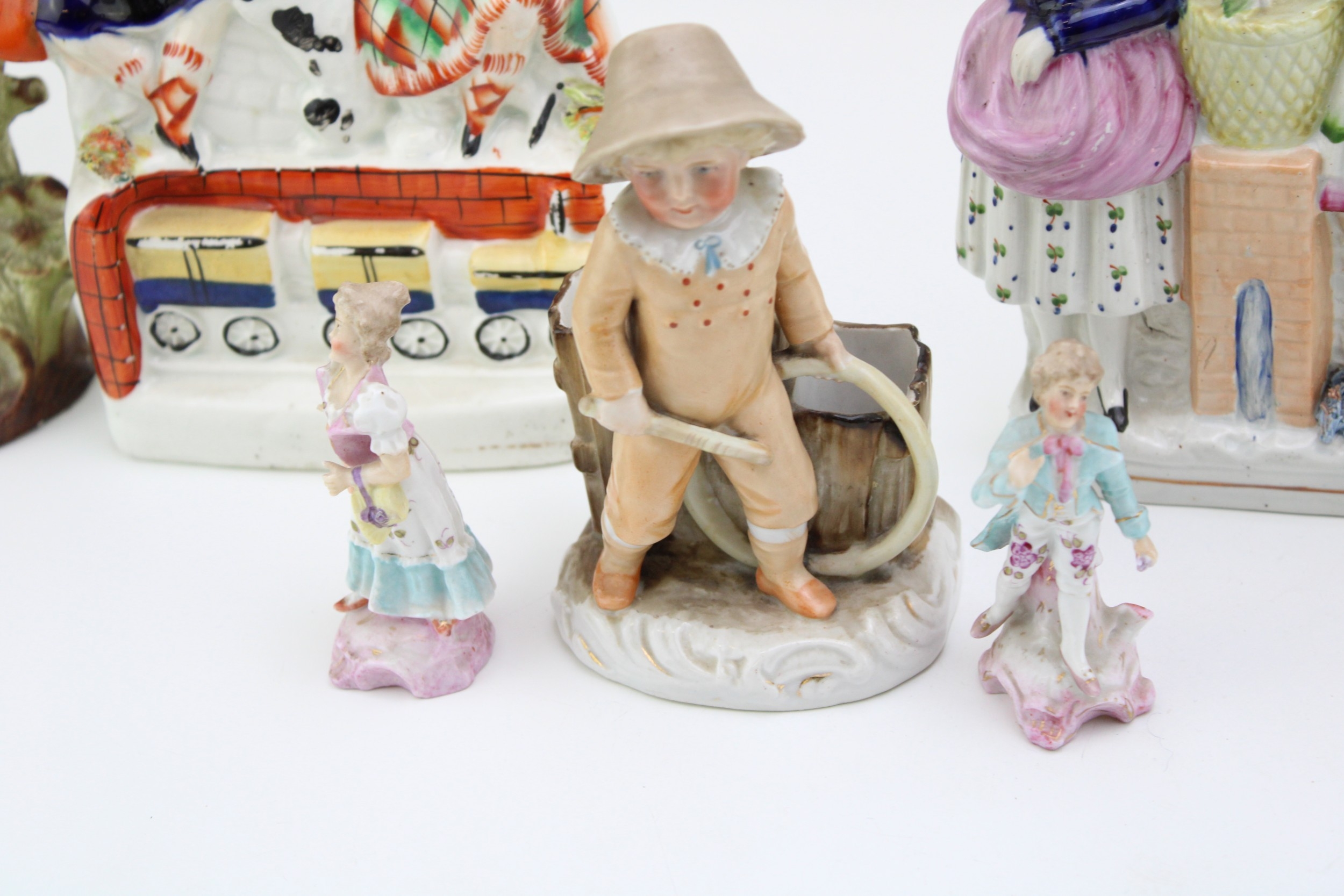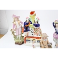A collection of continental and Staffordshire ceramics to include a pair of miniature figures, other continental figures and two Staffordshire flatback figures, 24cm tall, (7).