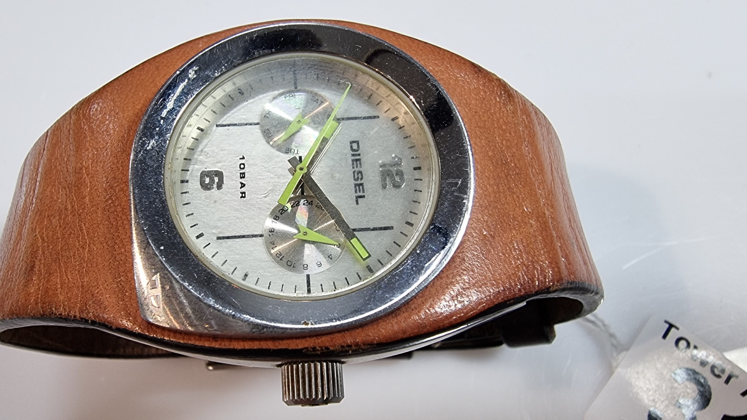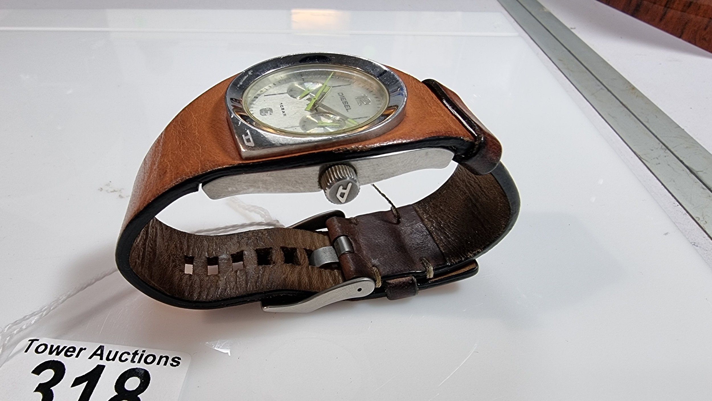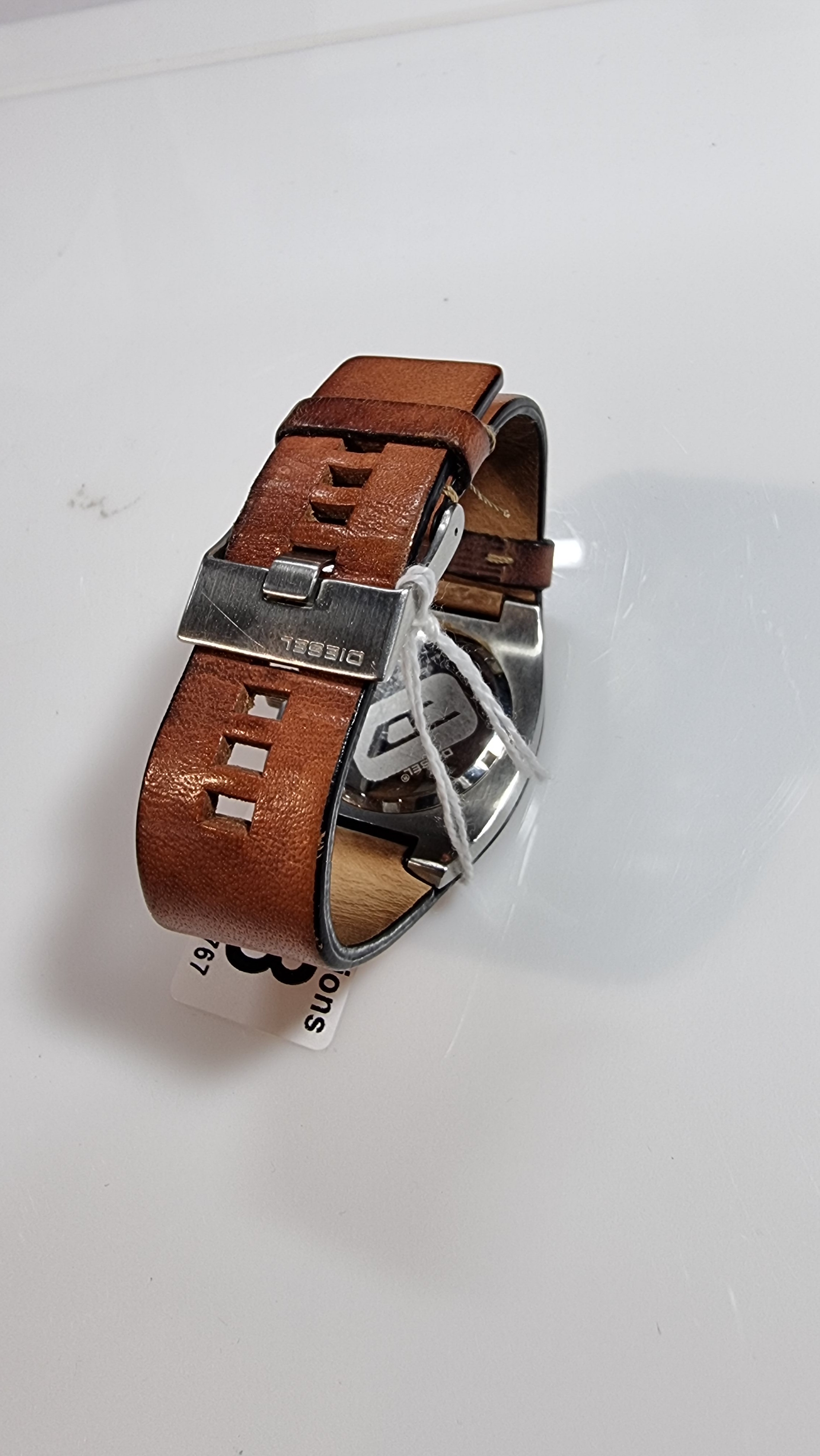 Vintage Diesel DZ/4020 gents wrist watch with a tan leather strap featuring an unusual attractive design excellent condition needs a new battery.