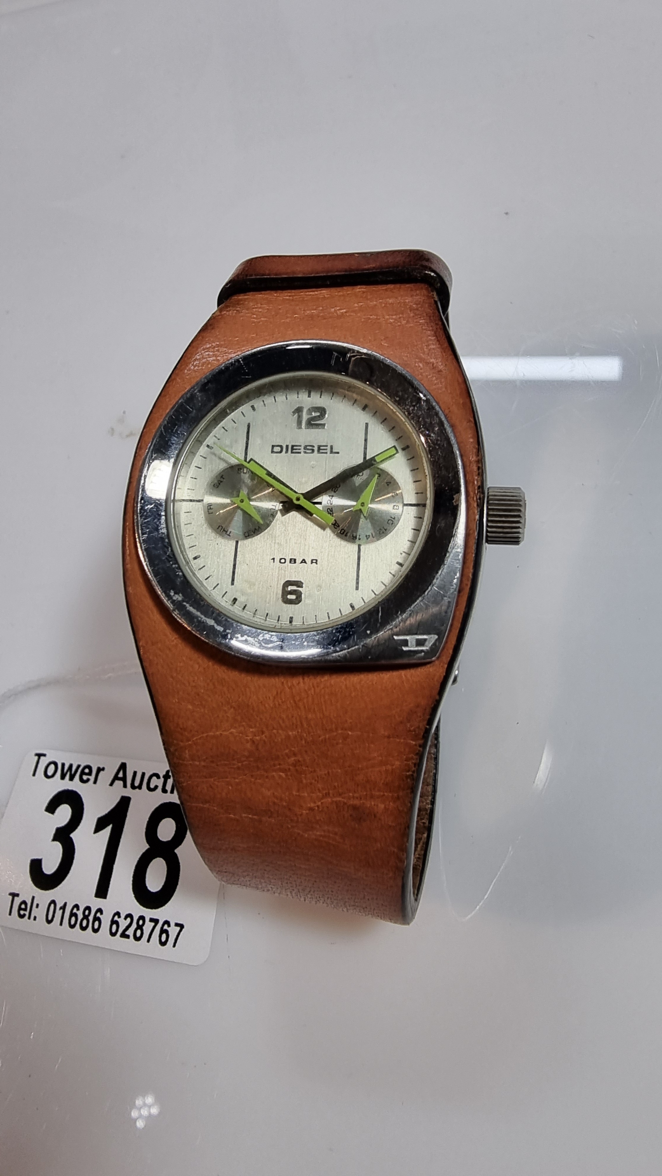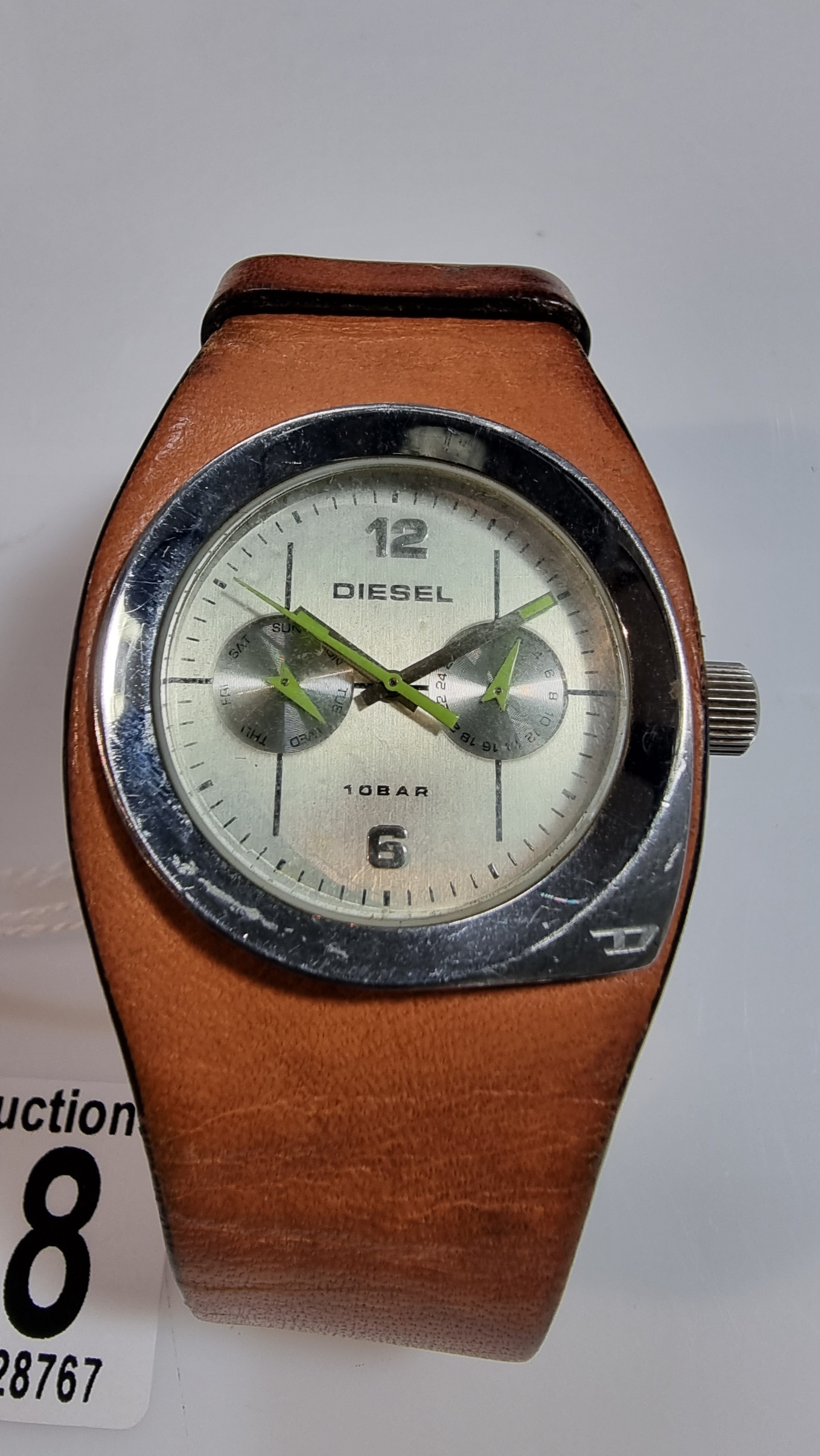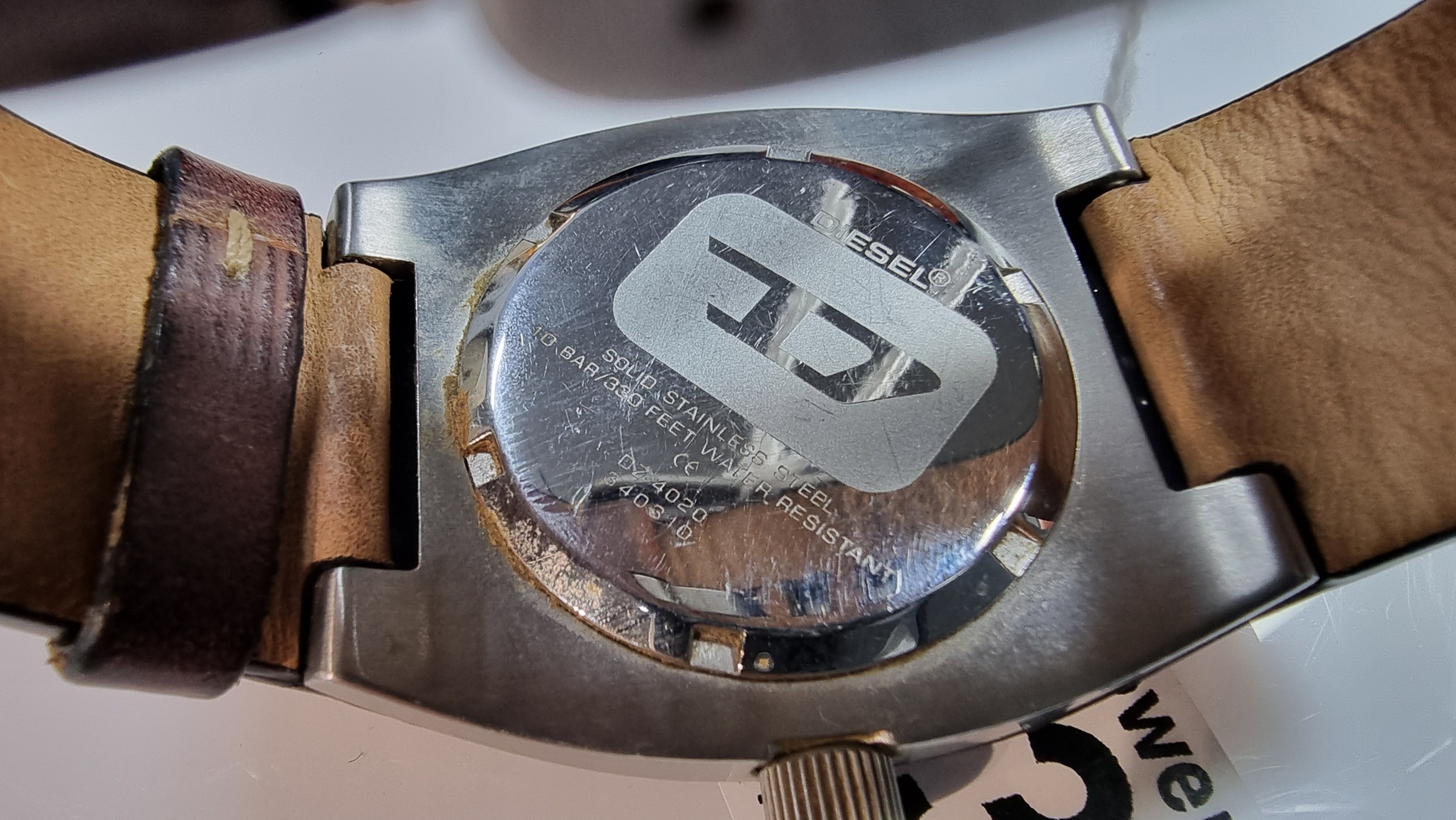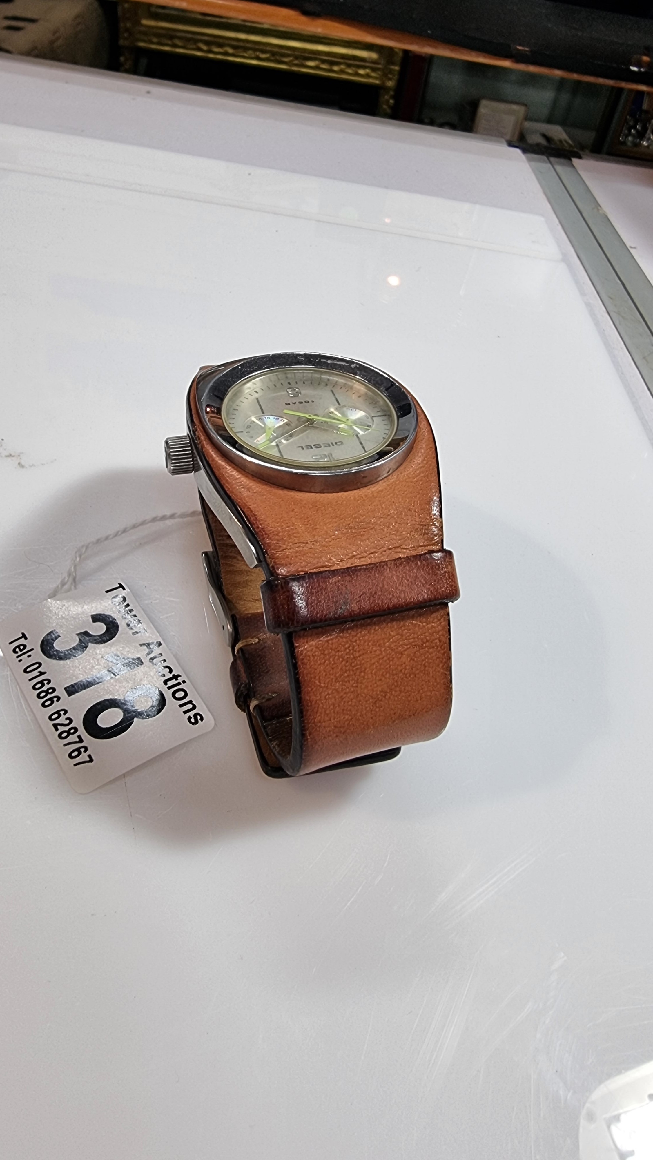 Vintage Diesel DZ/4020 gents wrist watch with a tan leather strap featuring an unusual attractive design excellent condition needs a new battery.