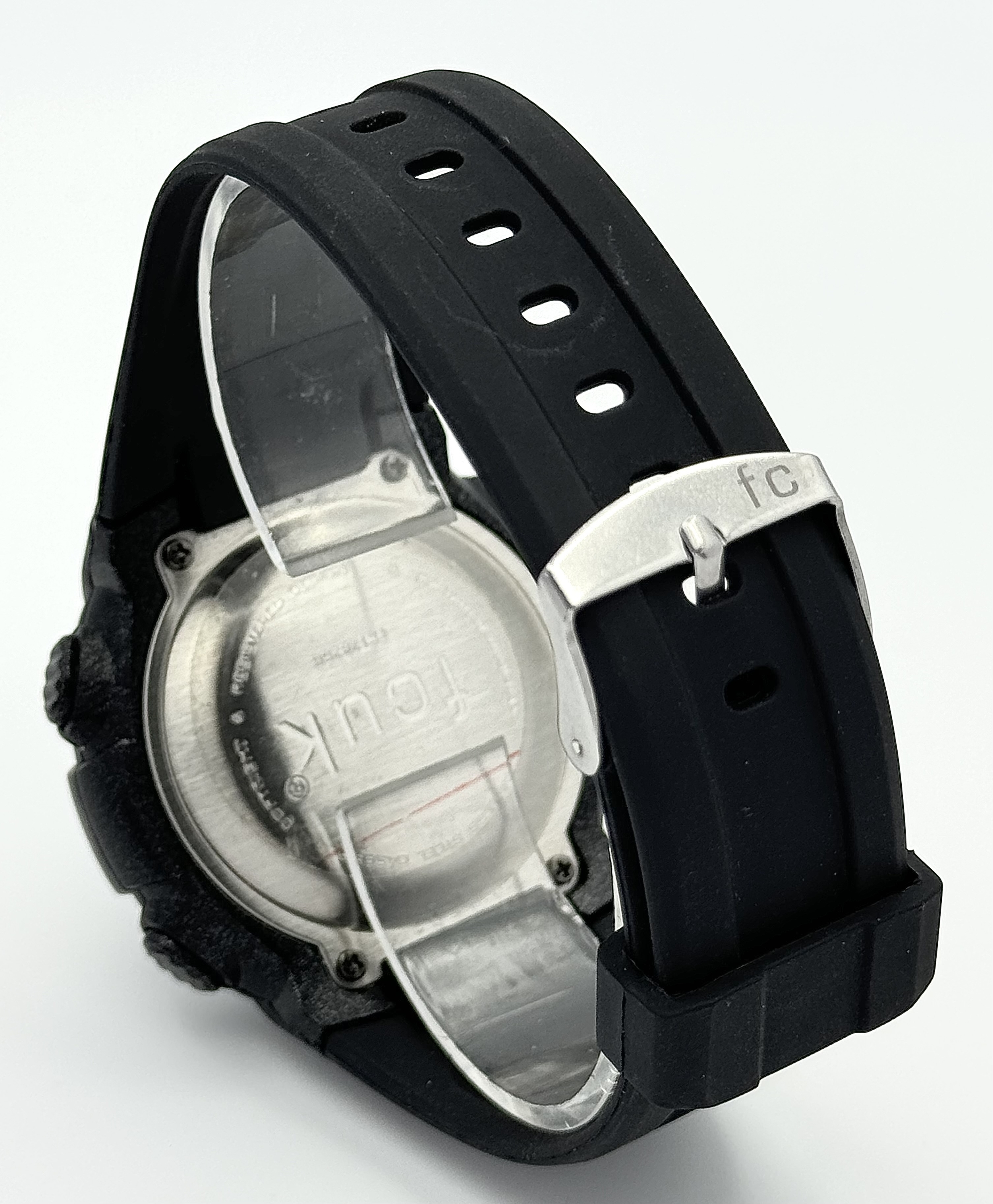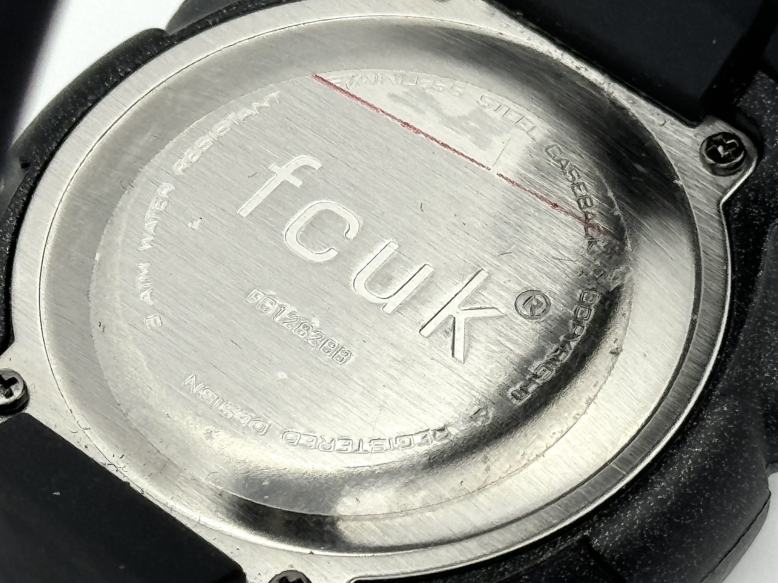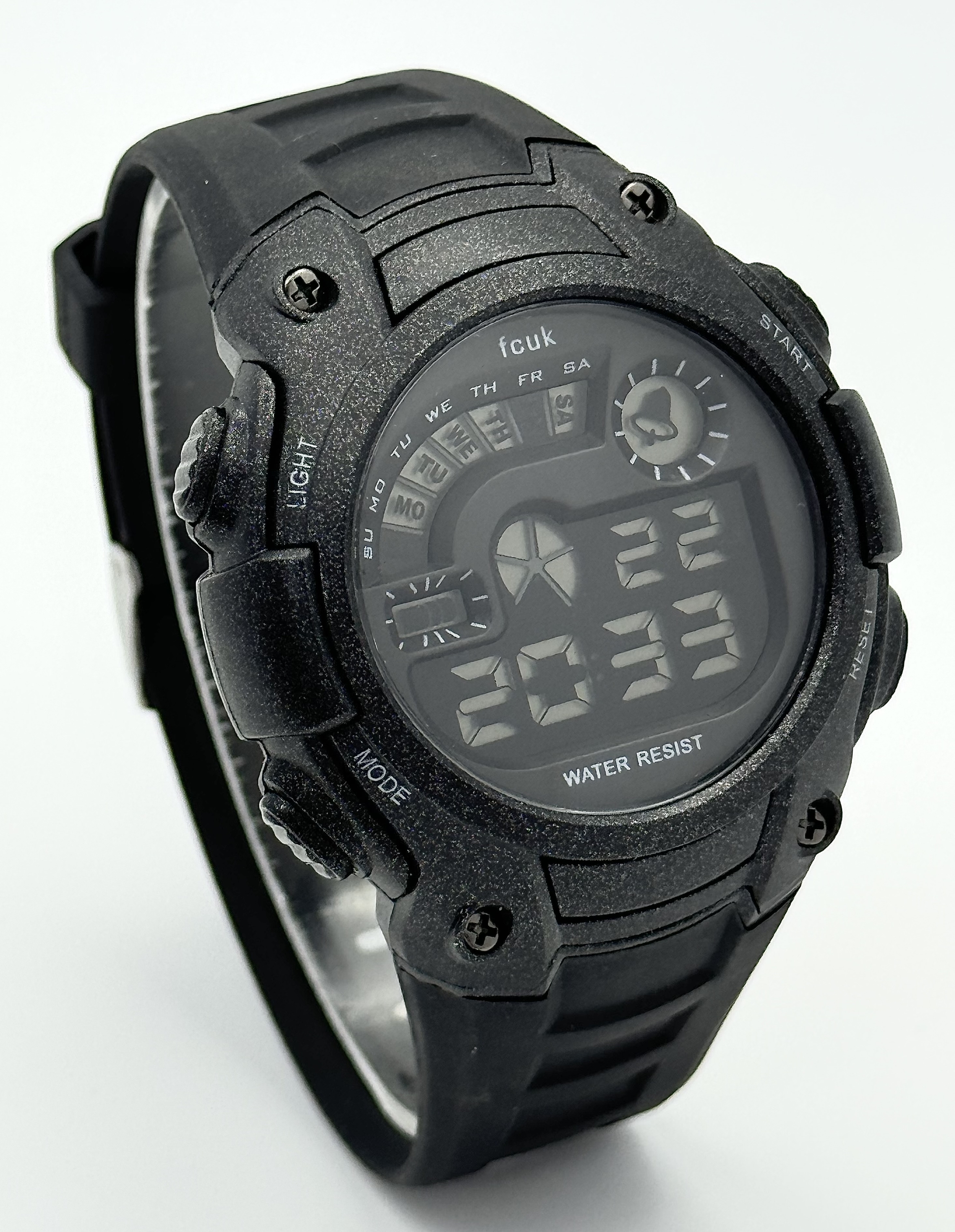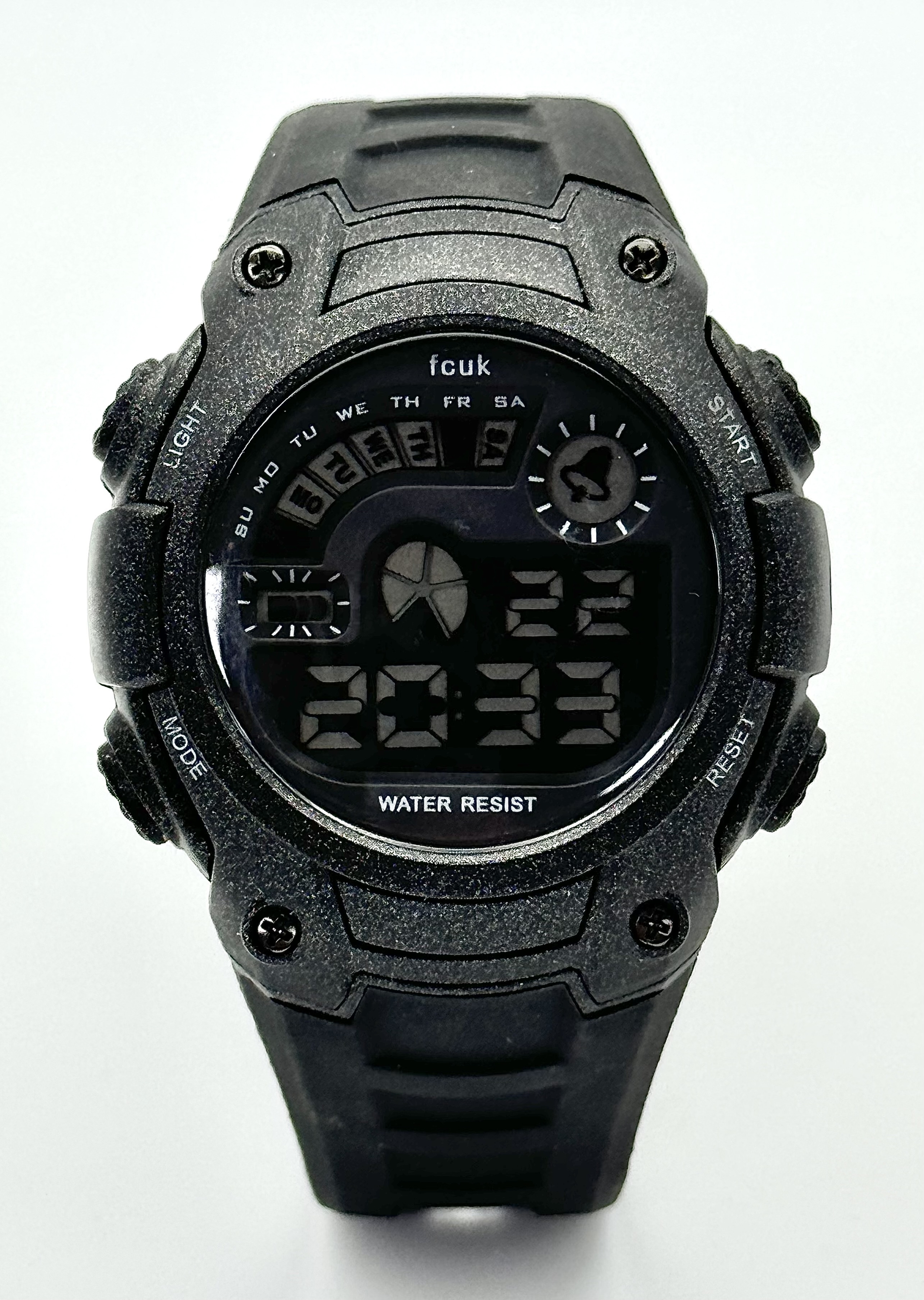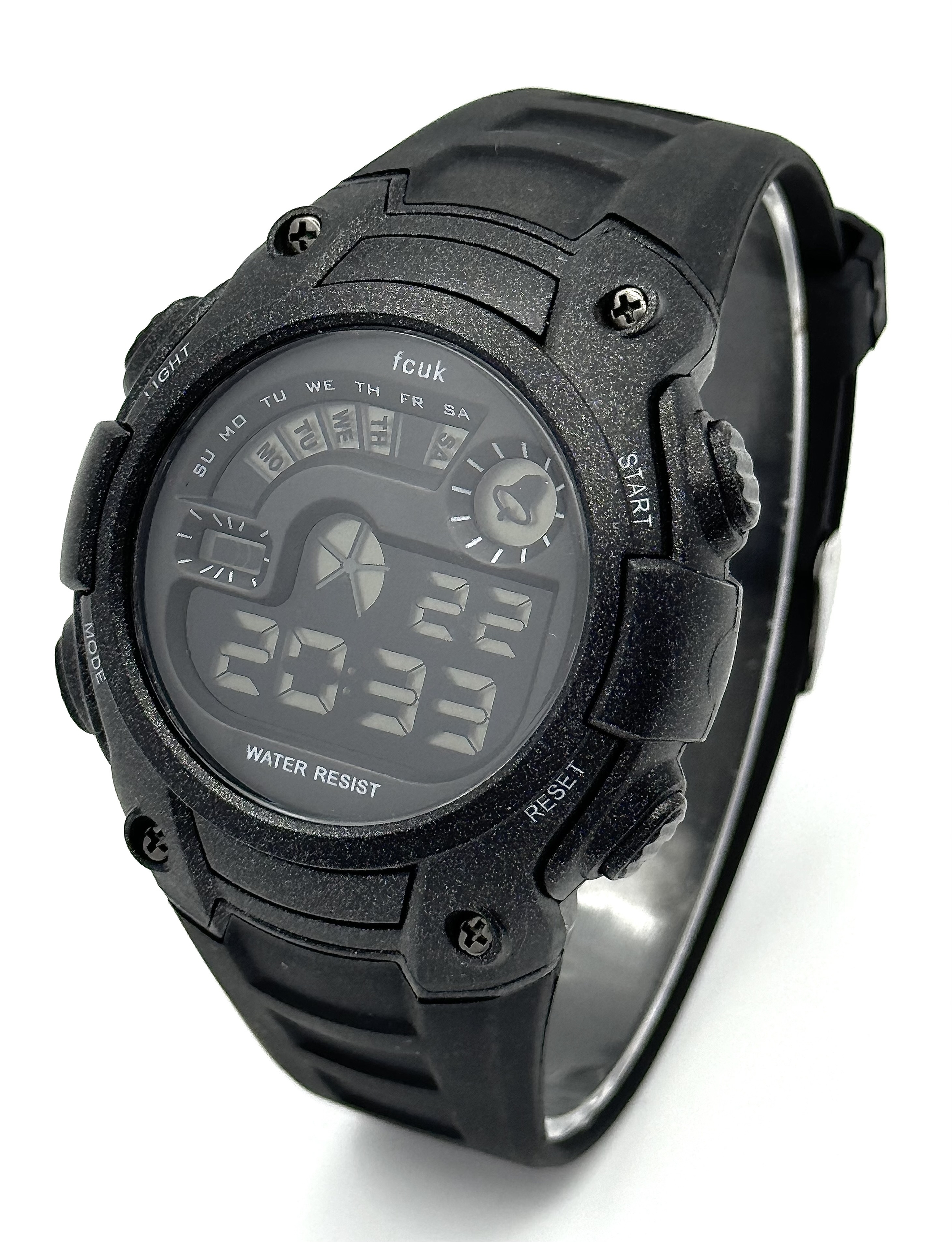 A FCUK DIGITAL WATCH ON BLACK RUBBER STRAP IN FULL WORKING ORDER. S/A 1267.
