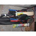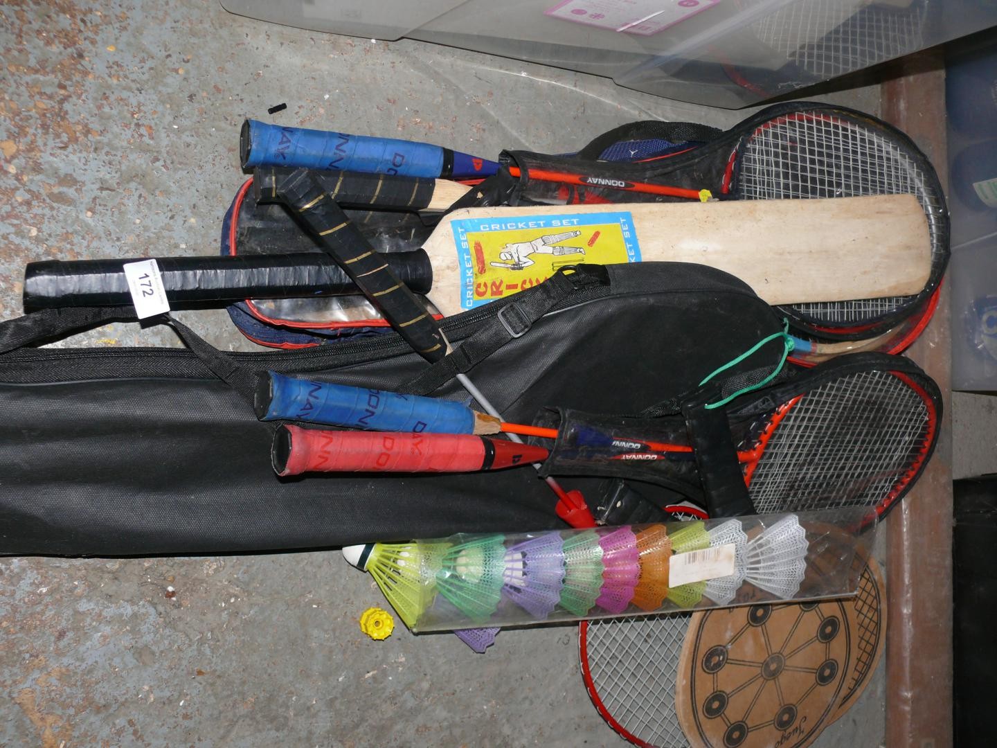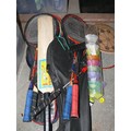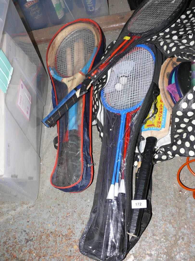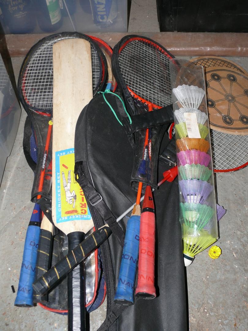 Selection of badminton sets, rackets, cricket bats etc