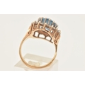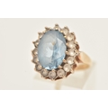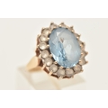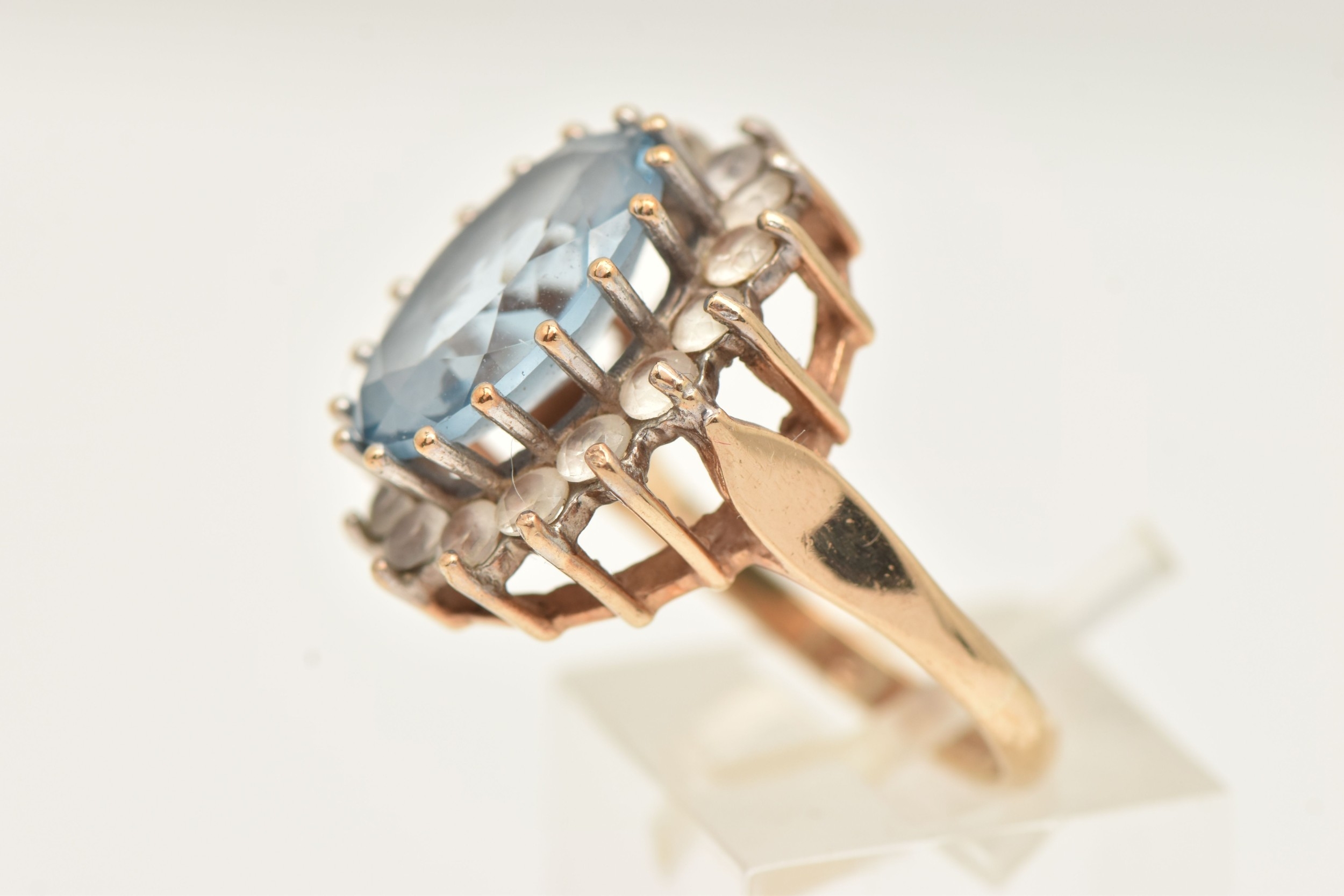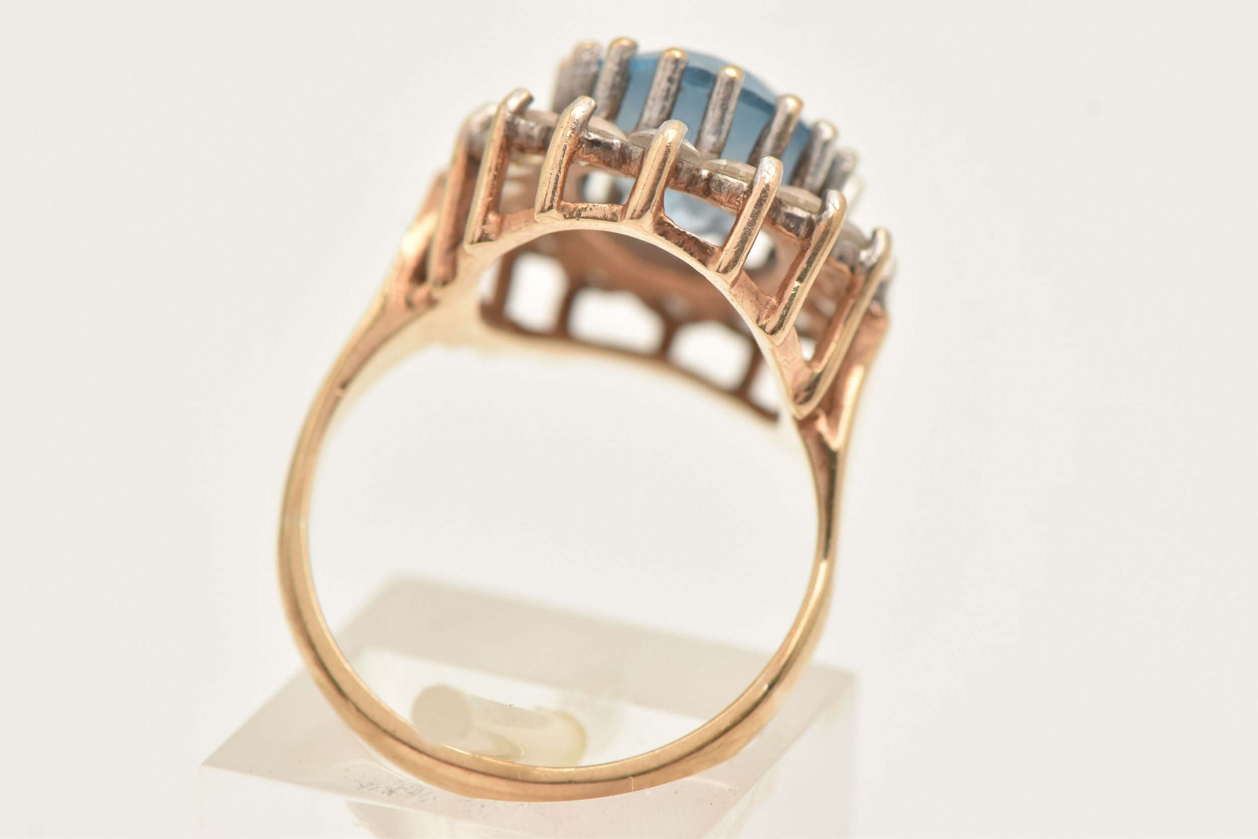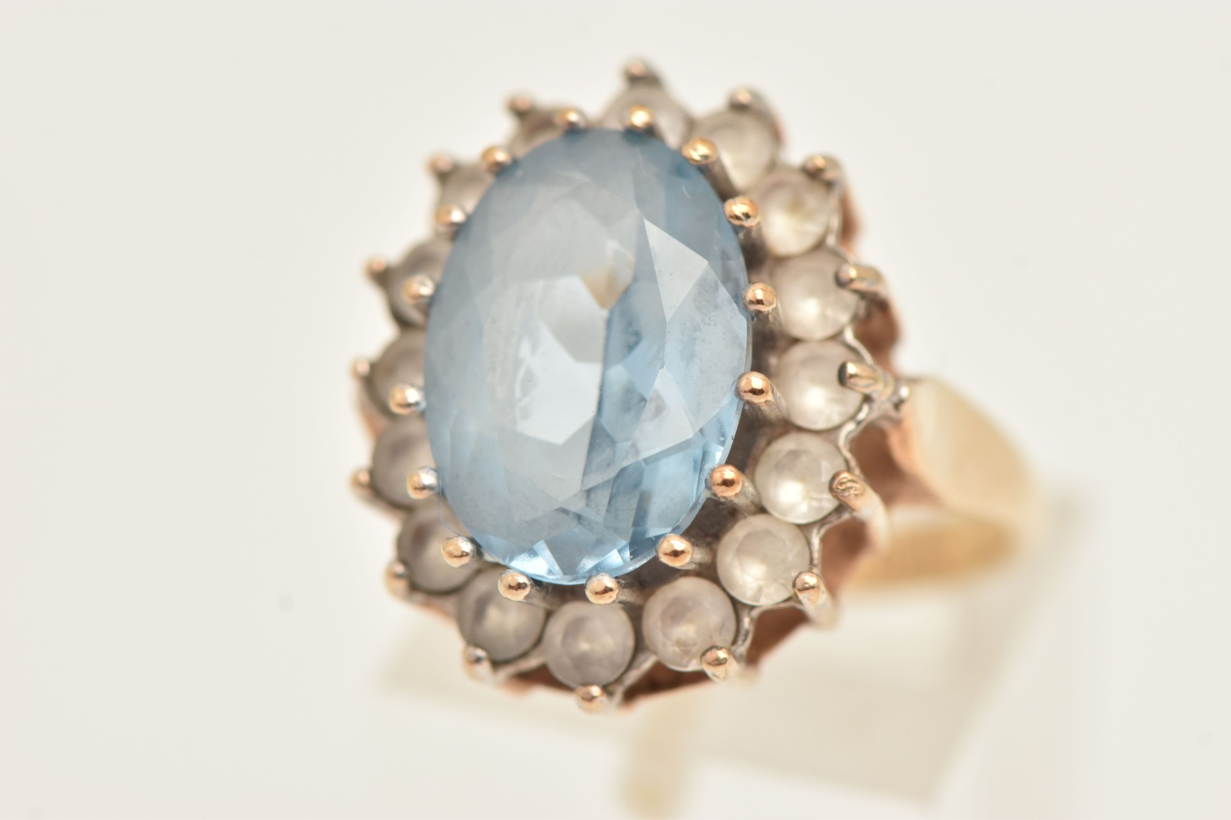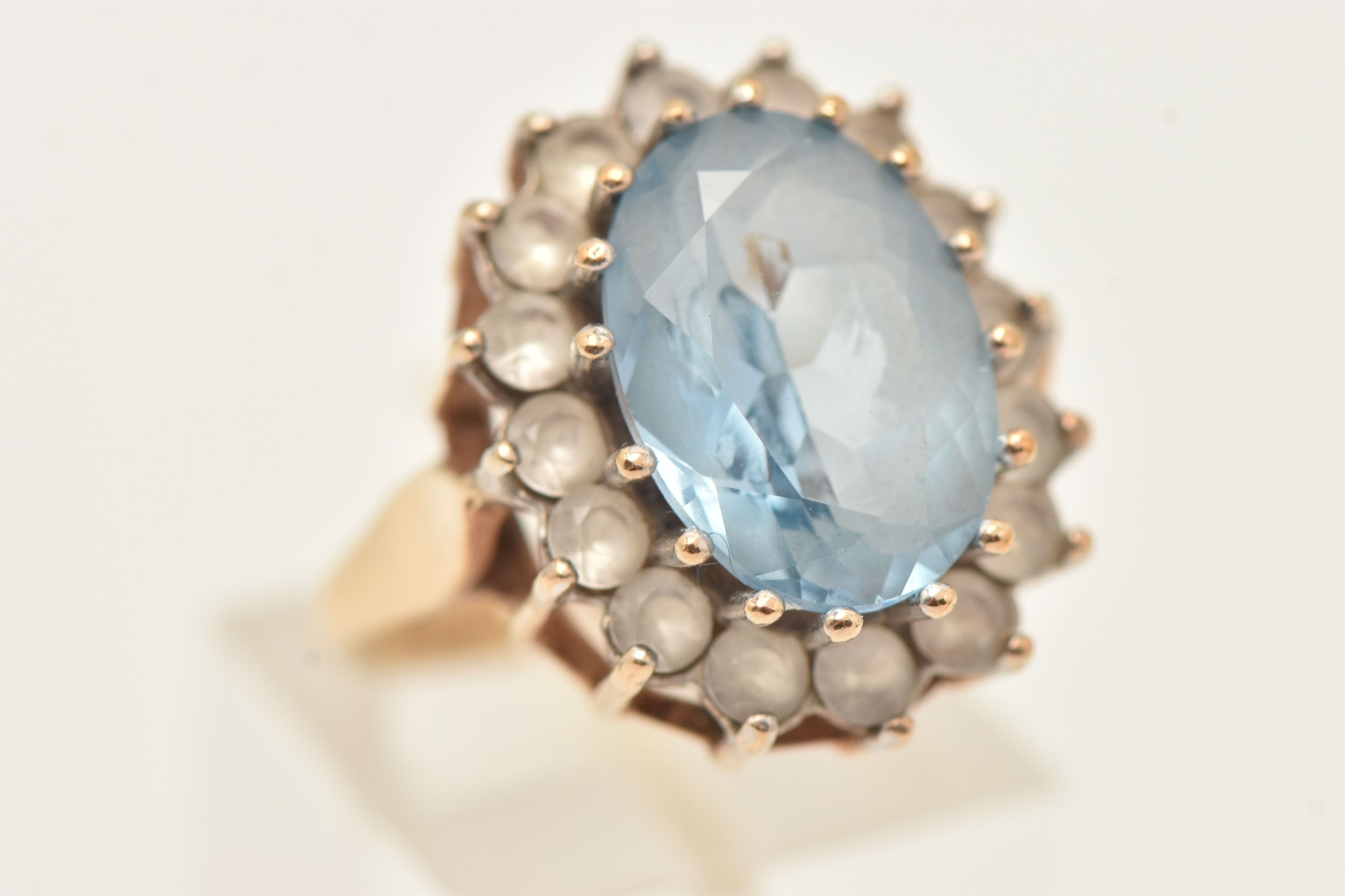 A 9CT GOLD SYNTHETIC SPINEL CLUSTER RING, of an oval form, set with a central light blue oval cut stone assessed as synthetic spinel, claw set in a surround of colourless spinel, polished band hallmarked 9ct Birmingham, ring size O 1/2, approximate gross weight 6.4 grams (condition report: general light wear, would benefit from a gentle clean, stones secure)