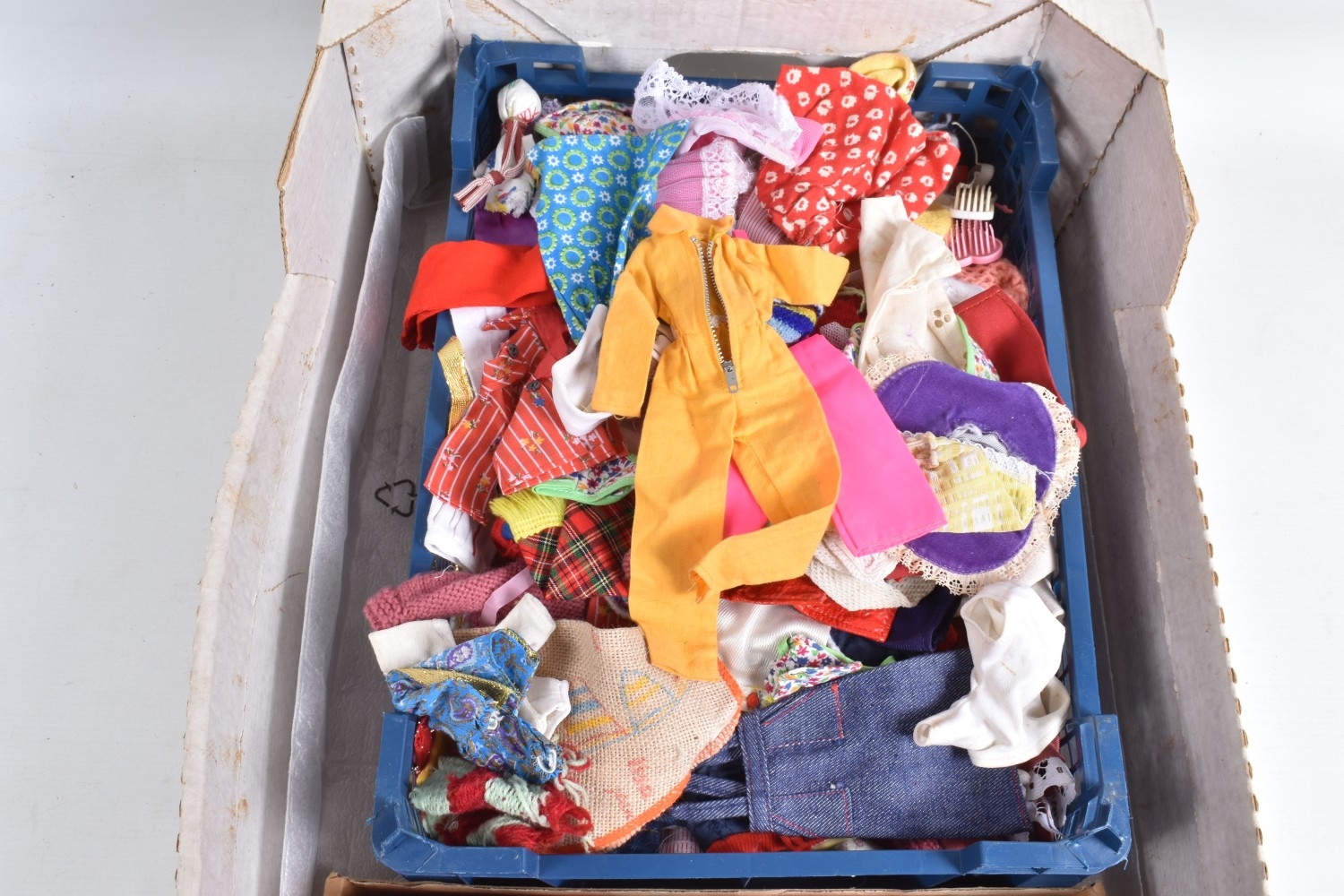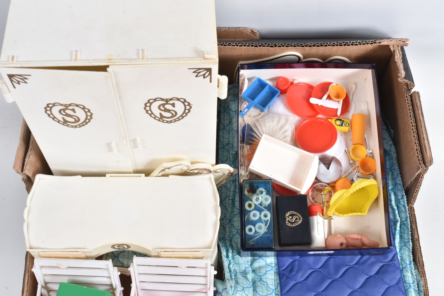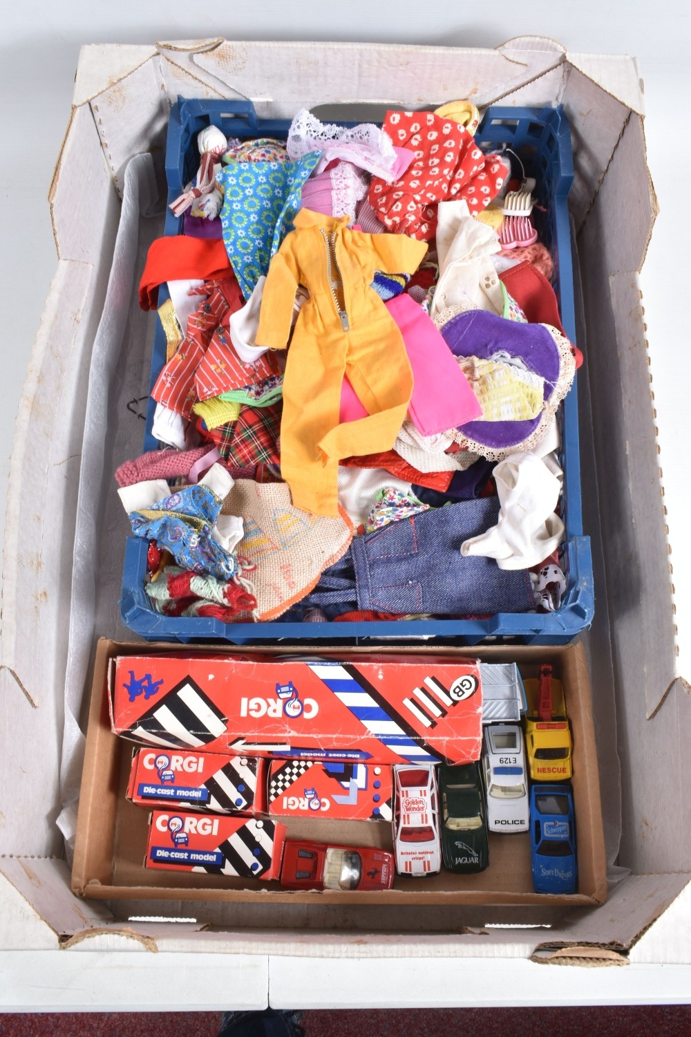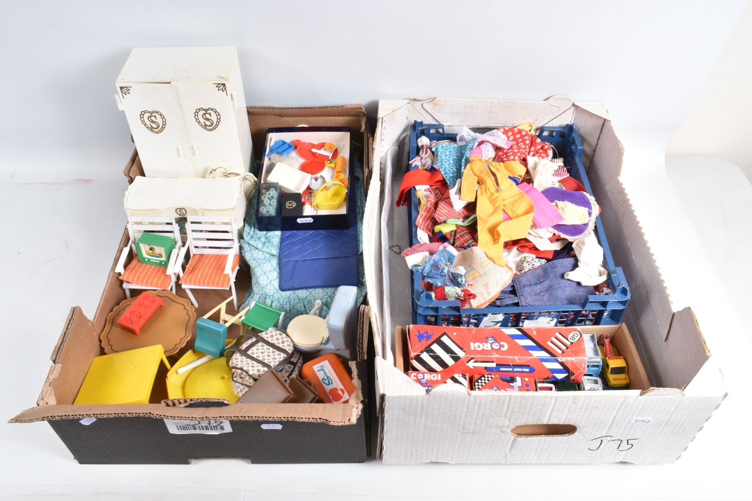 A QUANTITY OF ASSORTED SINDY FURNITURE, CLOTHING AND ACCESSORIES, large quantity of unlabelled contemporary Sindy/ Barbie size clothing, some knitted/homemade items, a quantity of Sindy and other furniture and accessories to include Wardrobe, Dressing Table and Bed, Patio Set, Suitcases, Toilet and quantity of small household and camping accessories etc., all in playworn condition, some with damage, wear and/or missing parts, with a small quantity of boxed and unboxed later issue Corgi Toys diecast vehicles, all in good condition, boes with damage and wear (2 boxes)