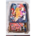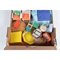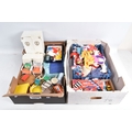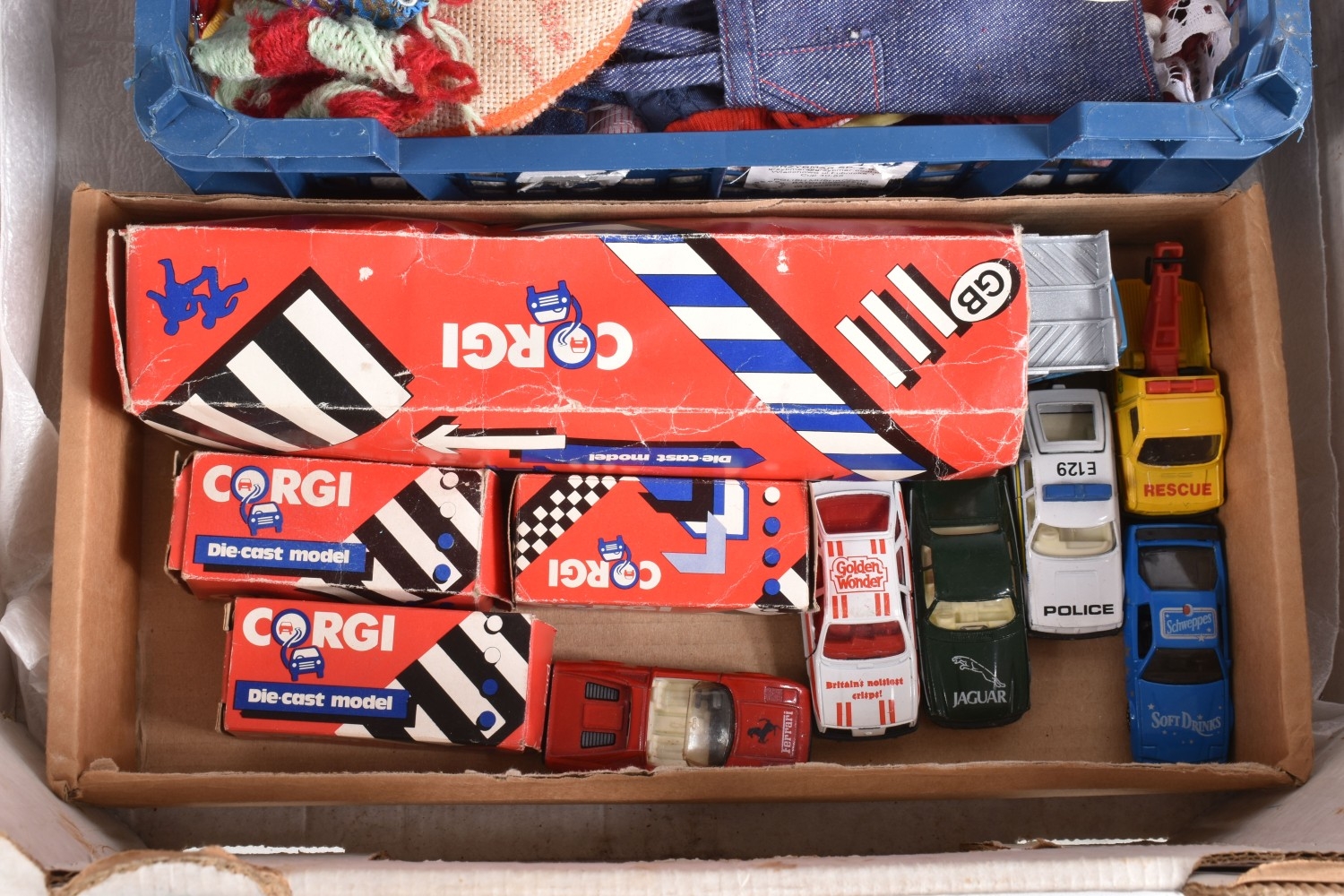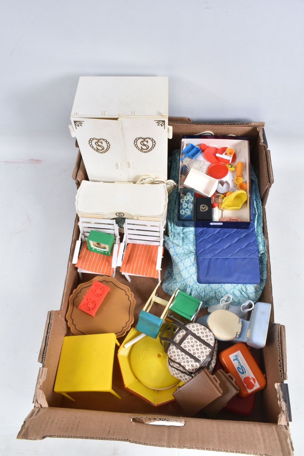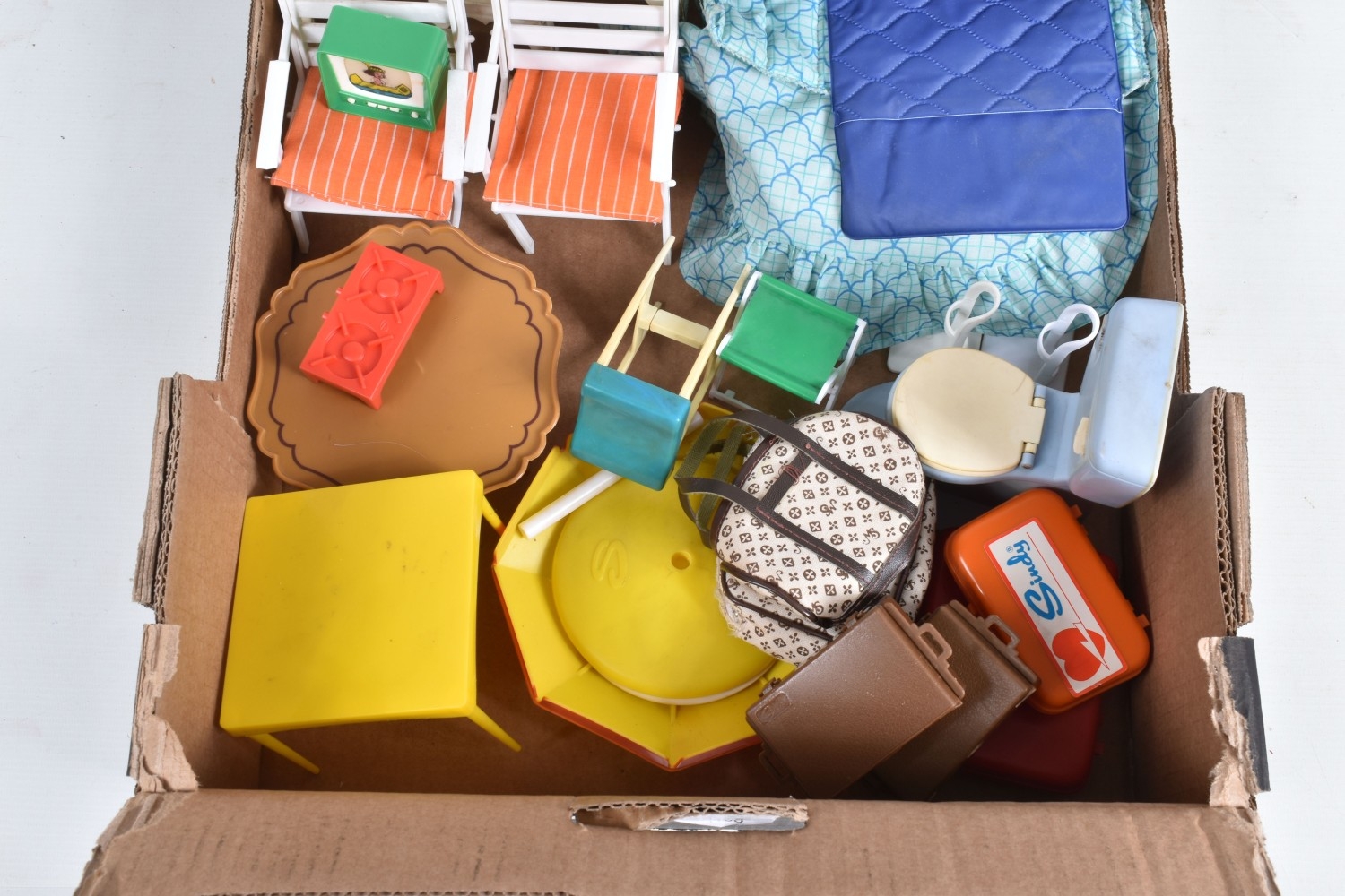 A QUANTITY OF ASSORTED SINDY FURNITURE, CLOTHING AND ACCESSORIES, large quantity of unlabelled contemporary Sindy/ Barbie size clothing, some knitted/homemade items, a quantity of Sindy and other furniture and accessories to include Wardrobe, Dressing Table and Bed, Patio Set, Suitcases, Toilet and quantity of small household and camping accessories etc., all in playworn condition, some with damage, wear and/or missing parts, with a small quantity of boxed and unboxed later issue Corgi Toys diecast vehicles, all in good condition, boes with damage and wear (2 boxes)