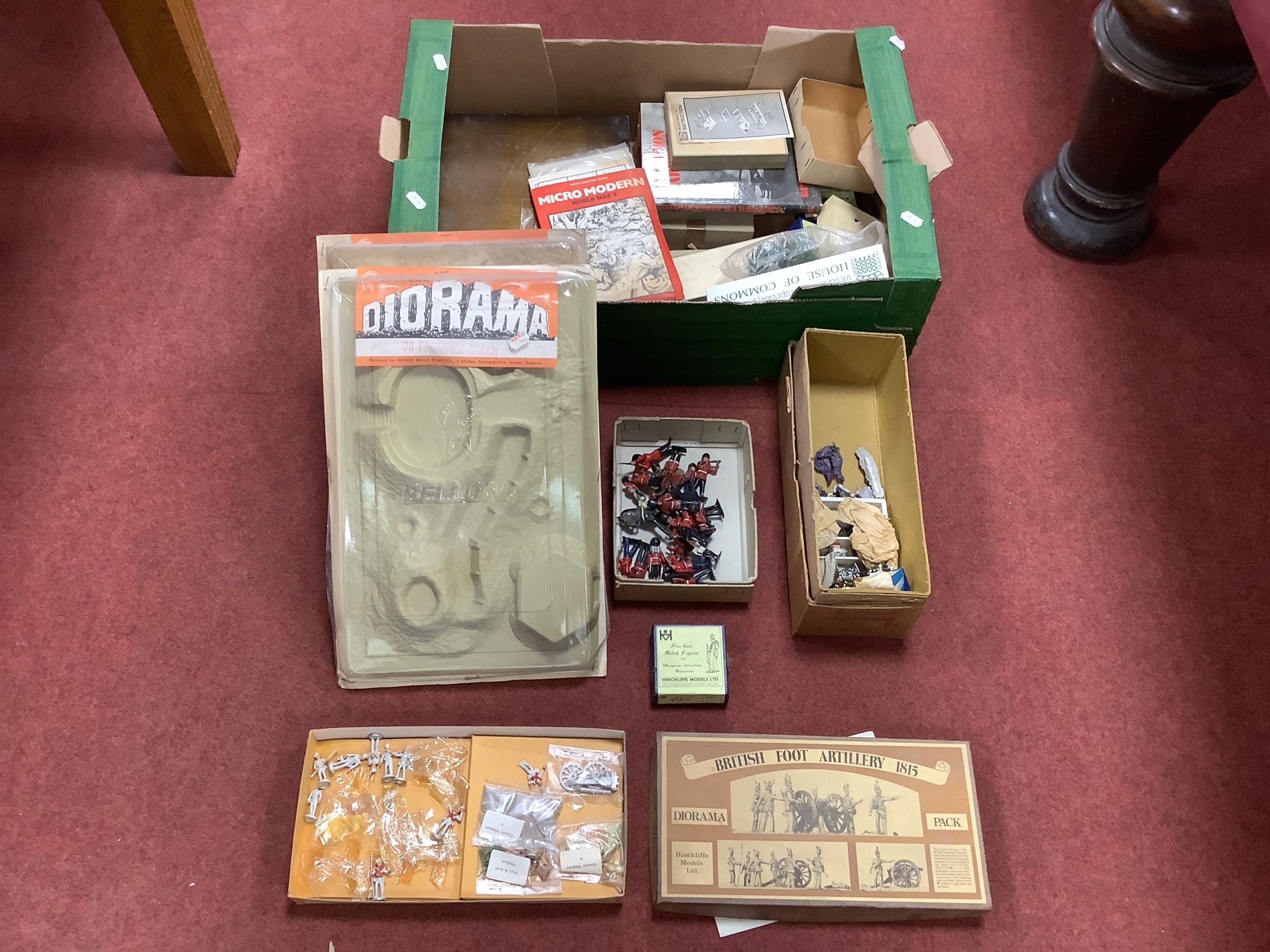 A Quantity of White Metal Military Modelling Figures, mid XX Century lead military figures, military 1:76th scale dioramas and associated items, playworn.