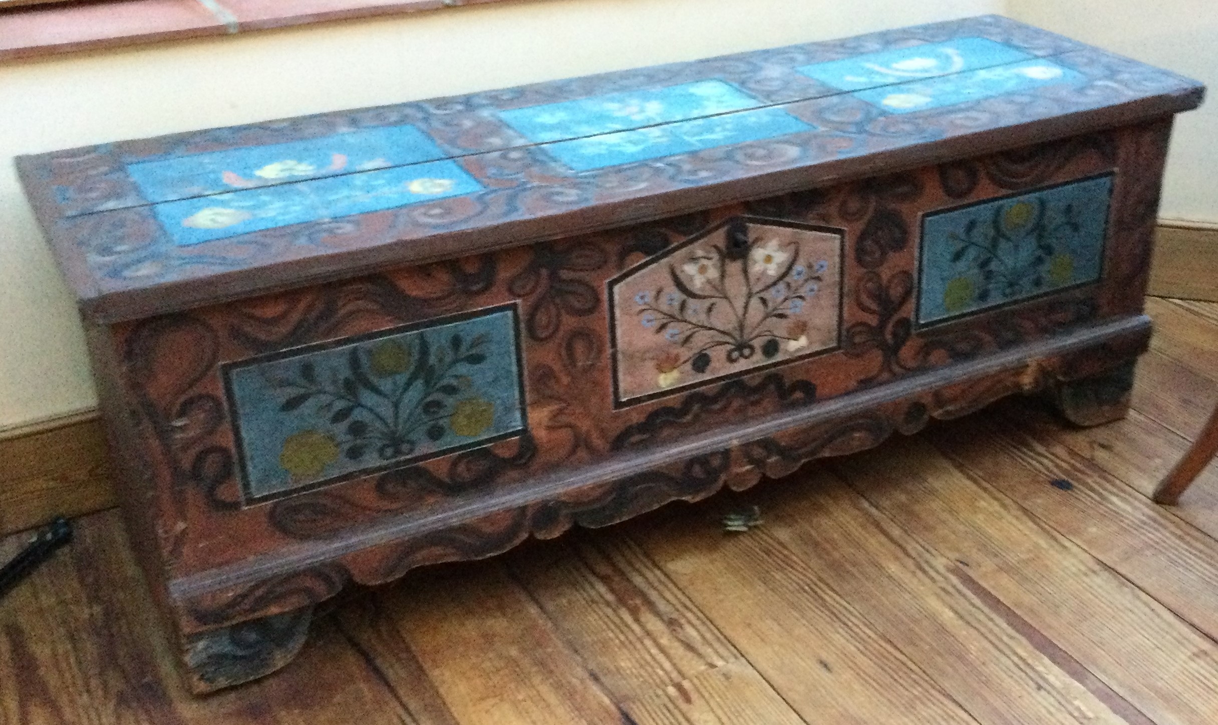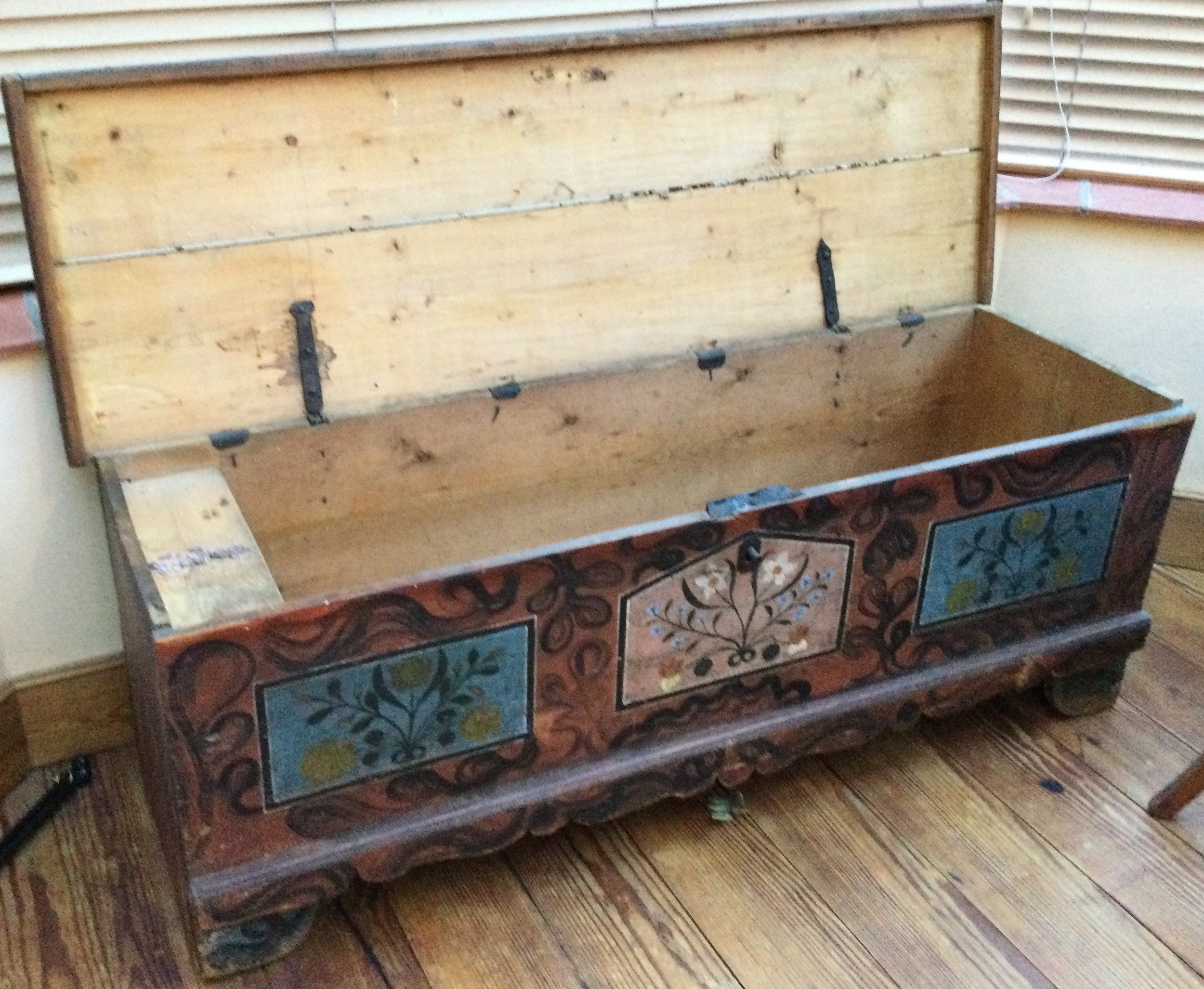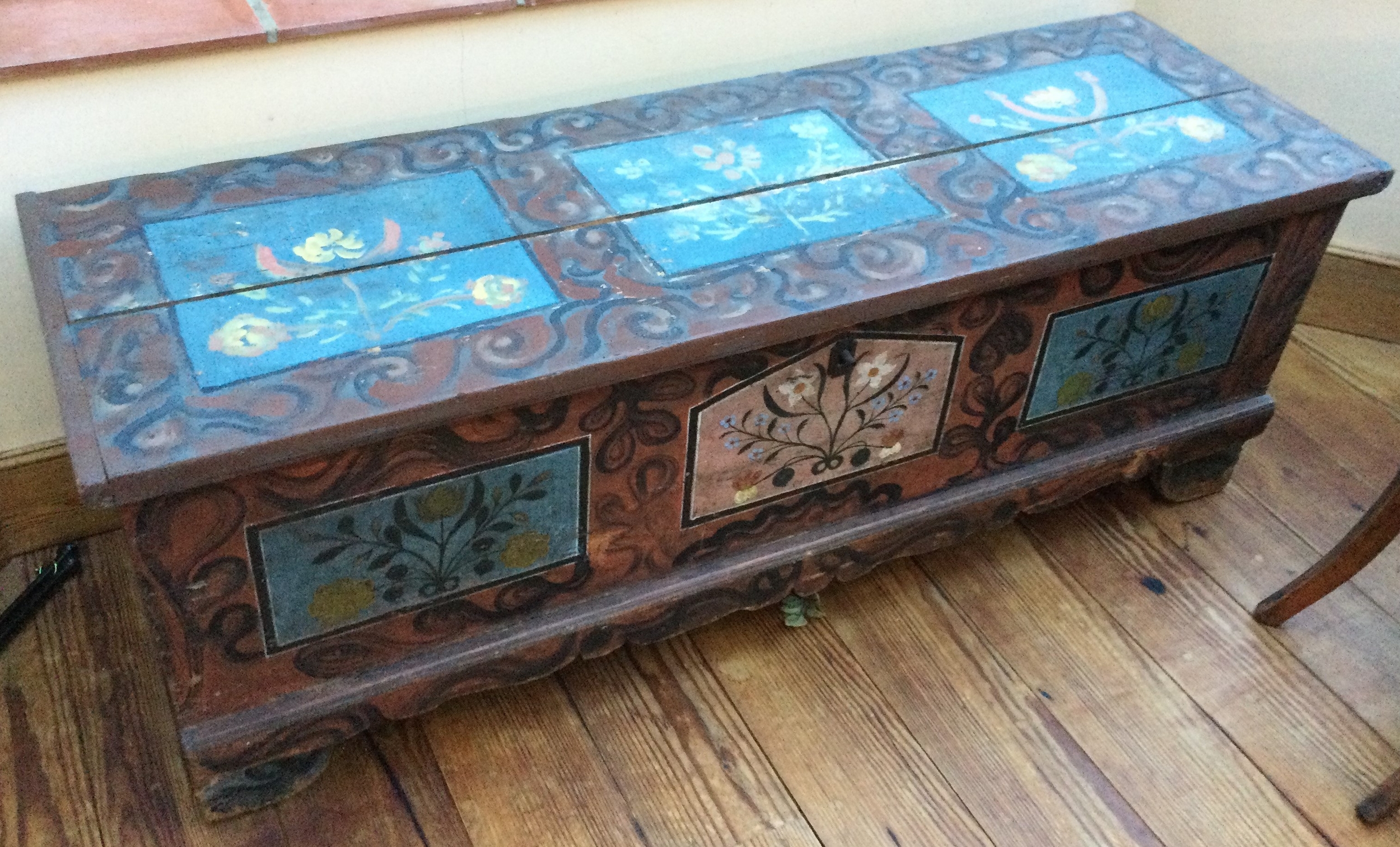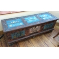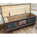 A good Antique trunk with painted decoration to hinged top. Est. £100 - £200.