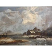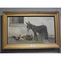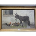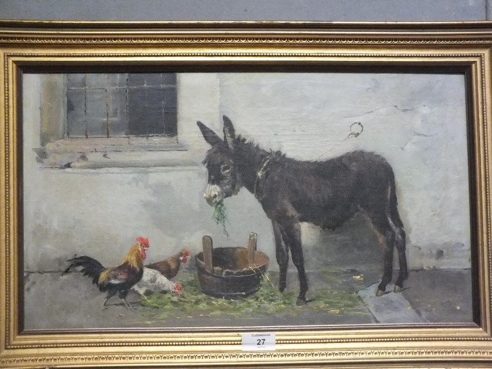19TH CENTURY ENGLISH SCHOOL - DONKEY AND CHICKENS OUTSIDE A STABLE OIL ON CANVAS 30 X 51.5 CM