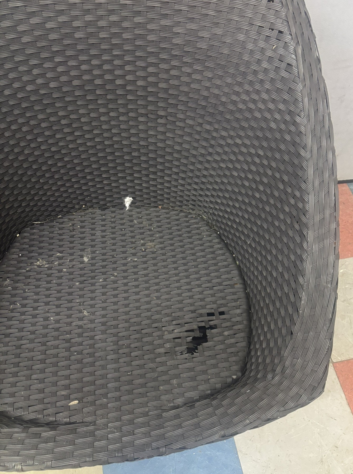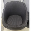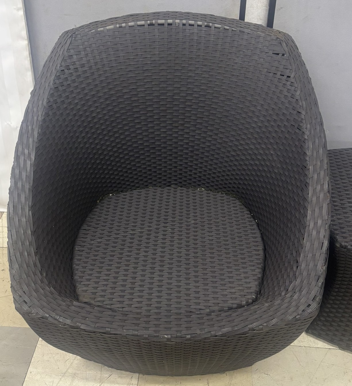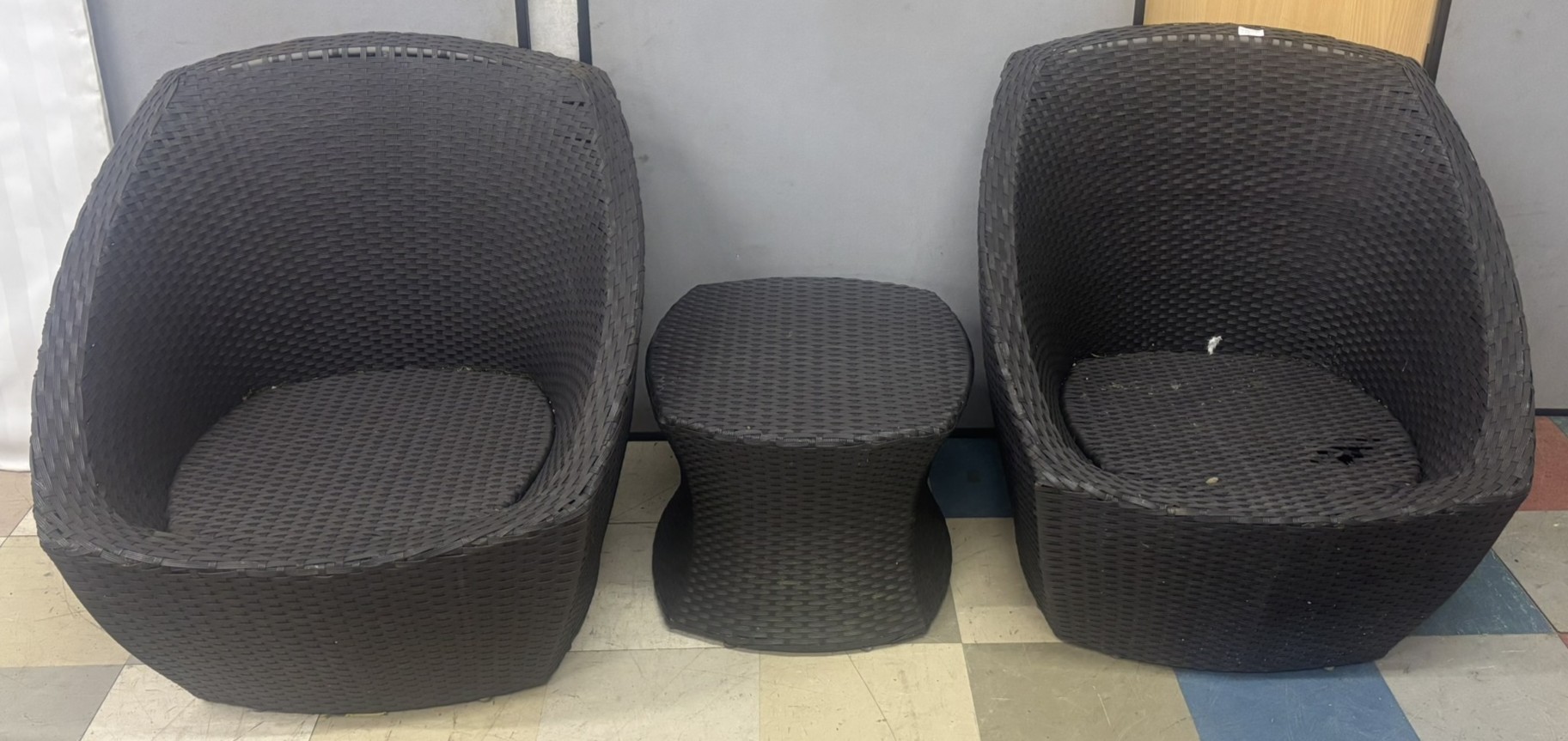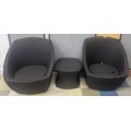 PAIR WOVEN PATIO CHAIRS AND MATCHING TABLE - 1 CHAIR DAMAGED