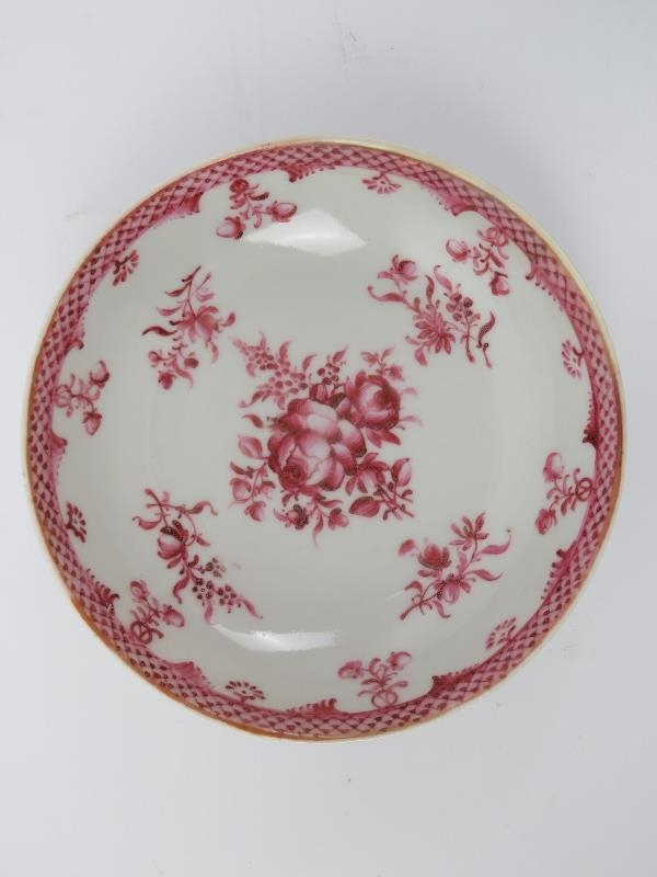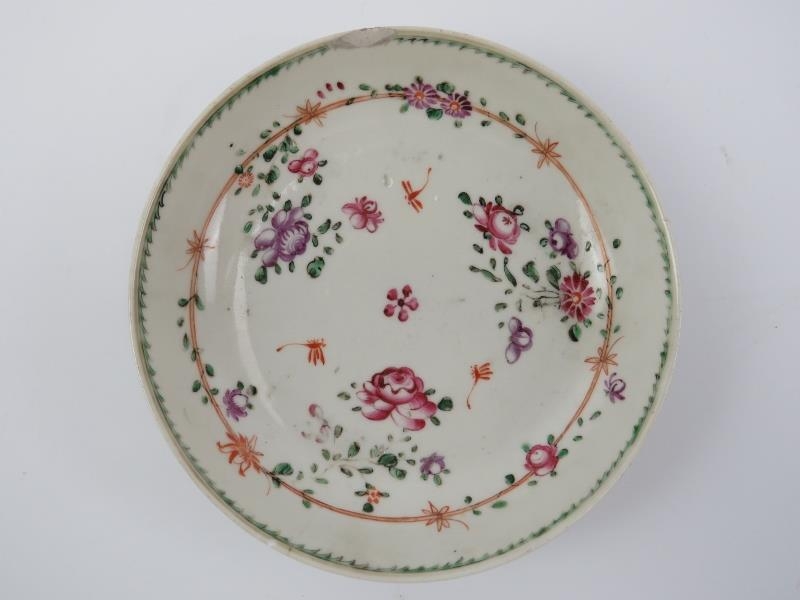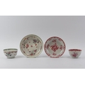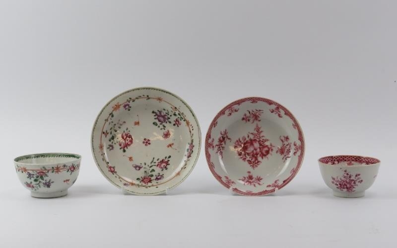 Two Chinese Famille Rose porcelain cups and saucers, 18th/19th century. (4 items) Saucers: 13.9 cm diameter, 12.6 cm diameter.