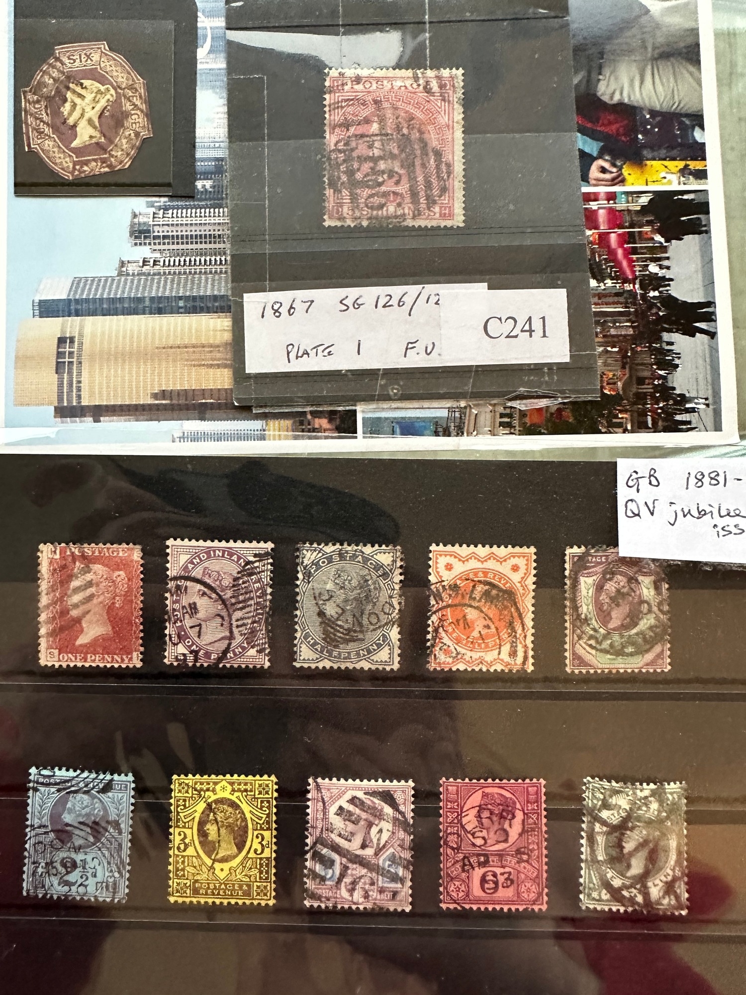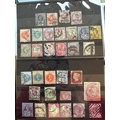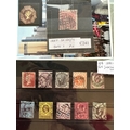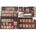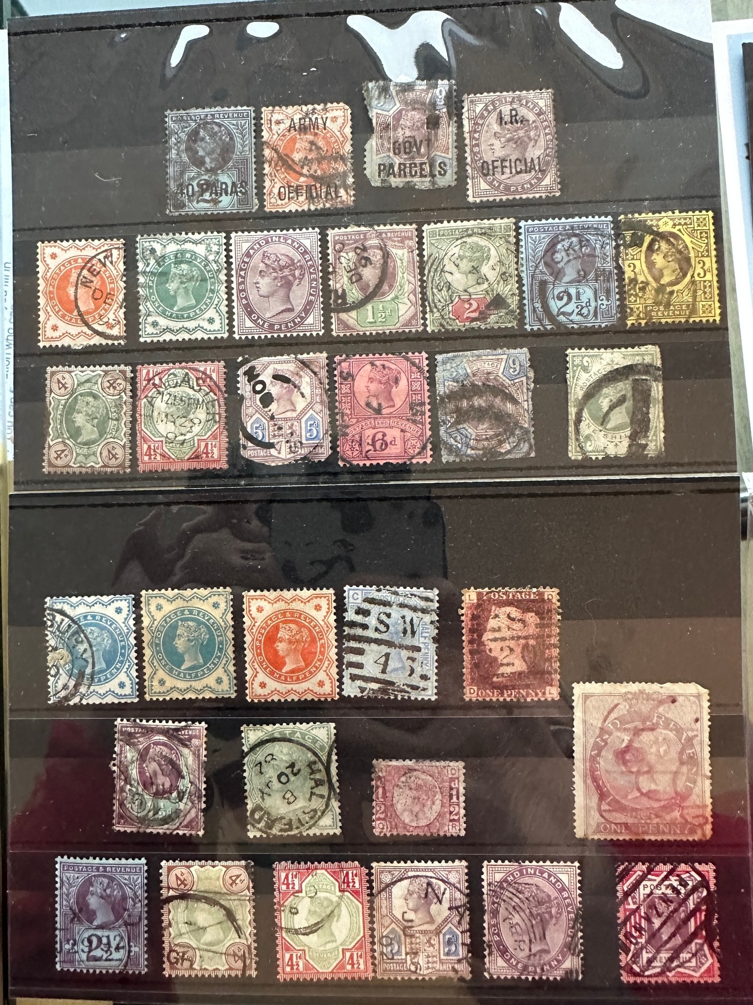 GB QV small collection / selection of early used stamps on stockcards inc Jubilee Edition, penny reds (one plum ?), GOV PARCELS, OFFICIAL overprints, 5 shillings plate 1, line engraved and surface printed. Six pence embossed. London, Penzance, Derry and Halstead cancels noted. One shilling 'fancy cancel'