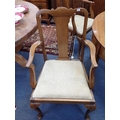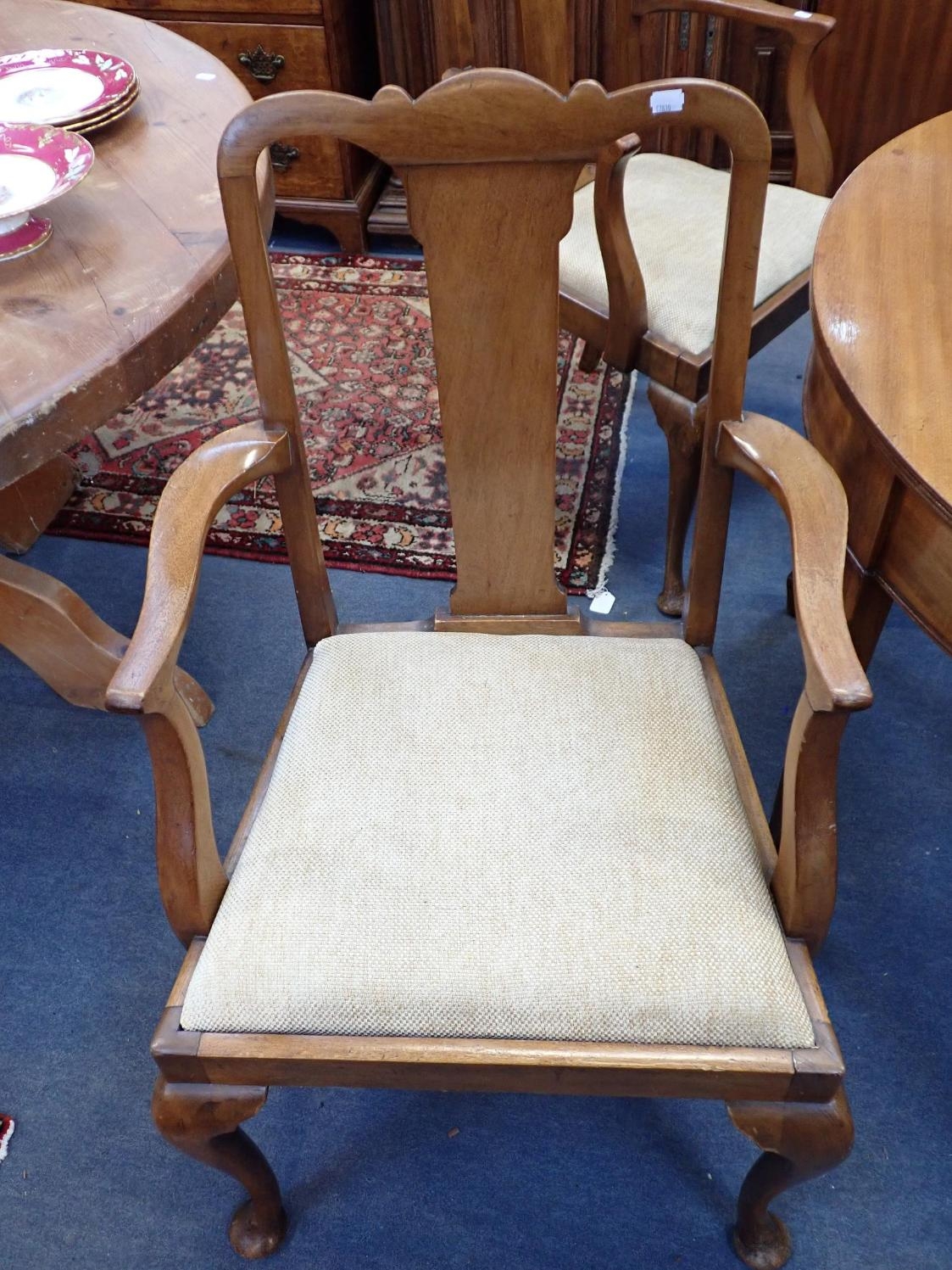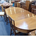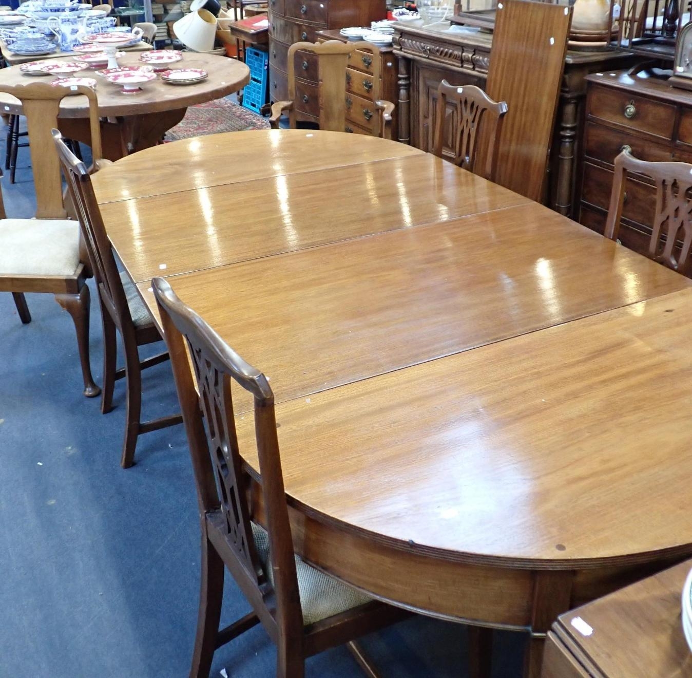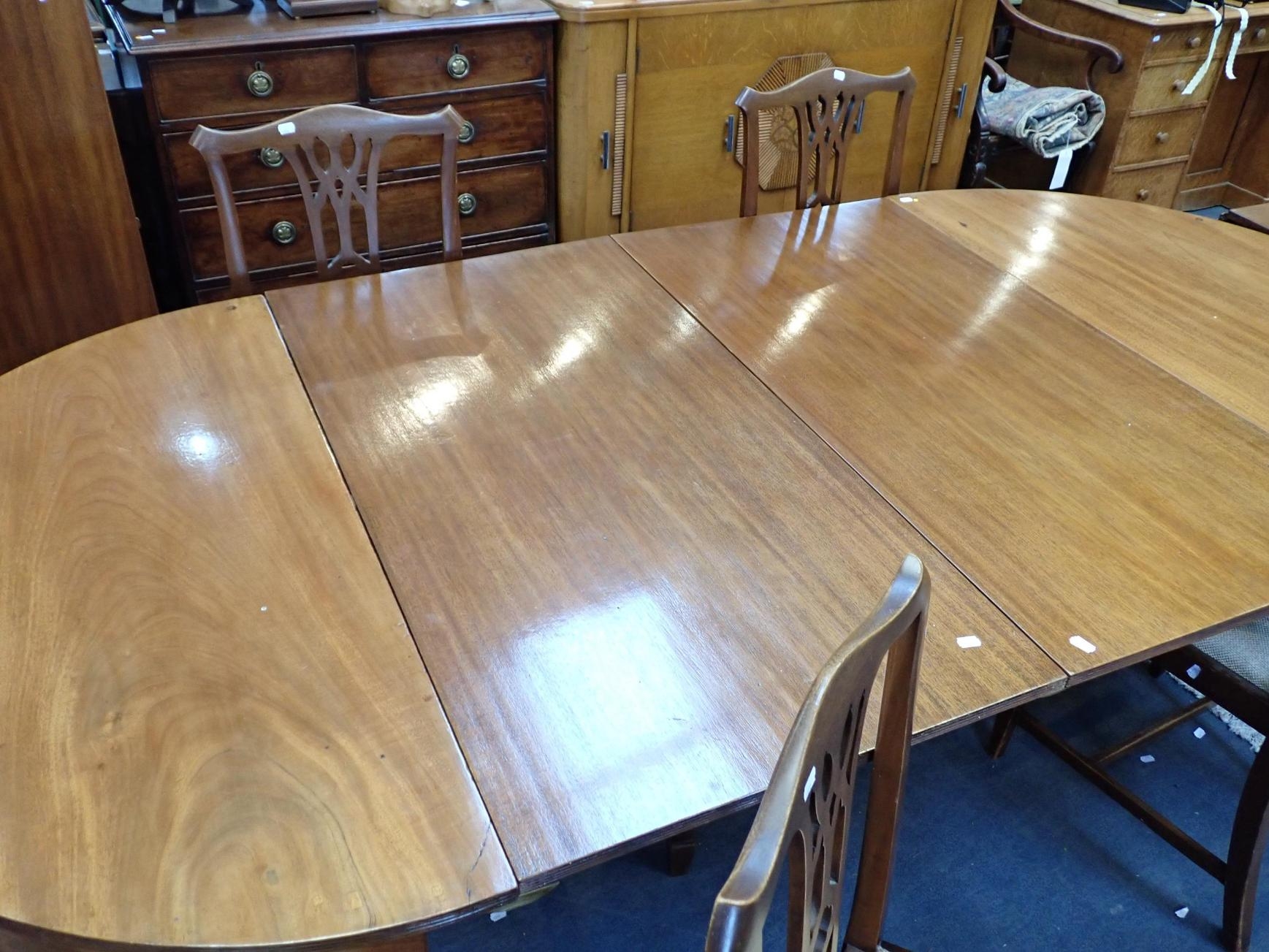 with two 'D' ends, and three leaves, 118cm wide, 286cm long (extended) and six mahogany chairs, four with pierced splats, the carvers with plain splats (central leaf has no support except the brass forks; faded, repairs)