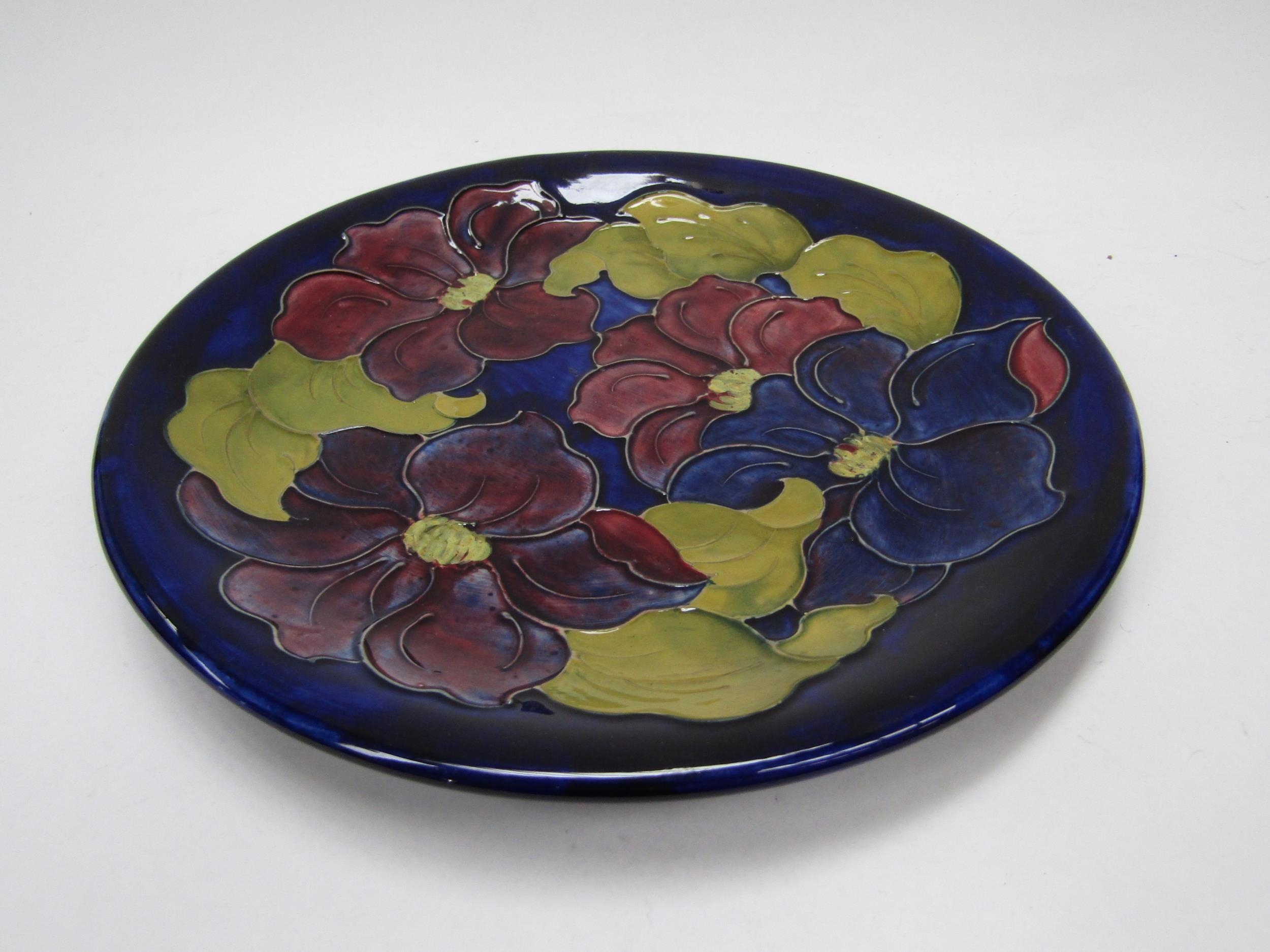 A Moorcroft Clematis pattern plate on blue ground, 26cm diameter