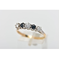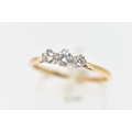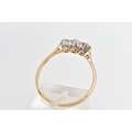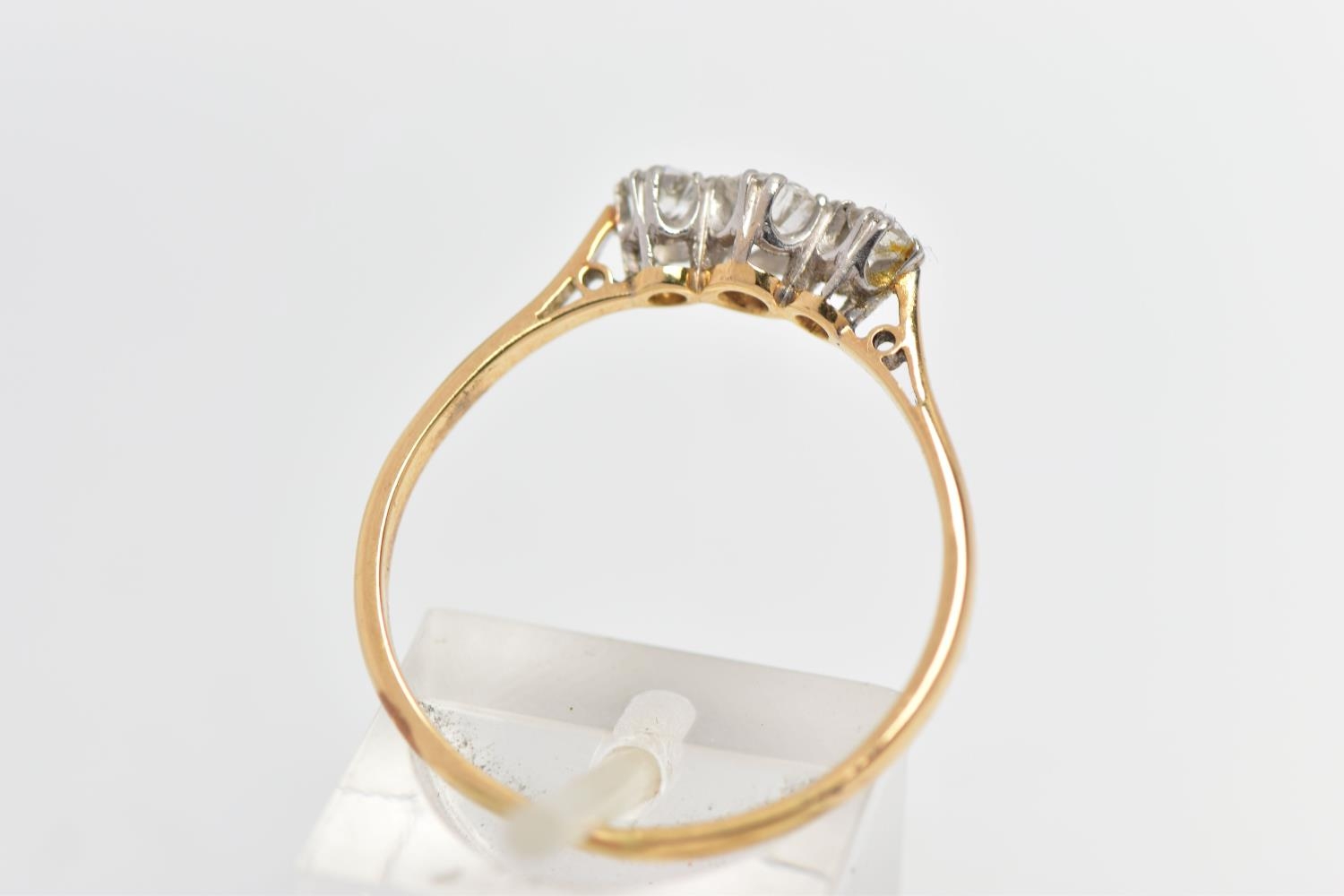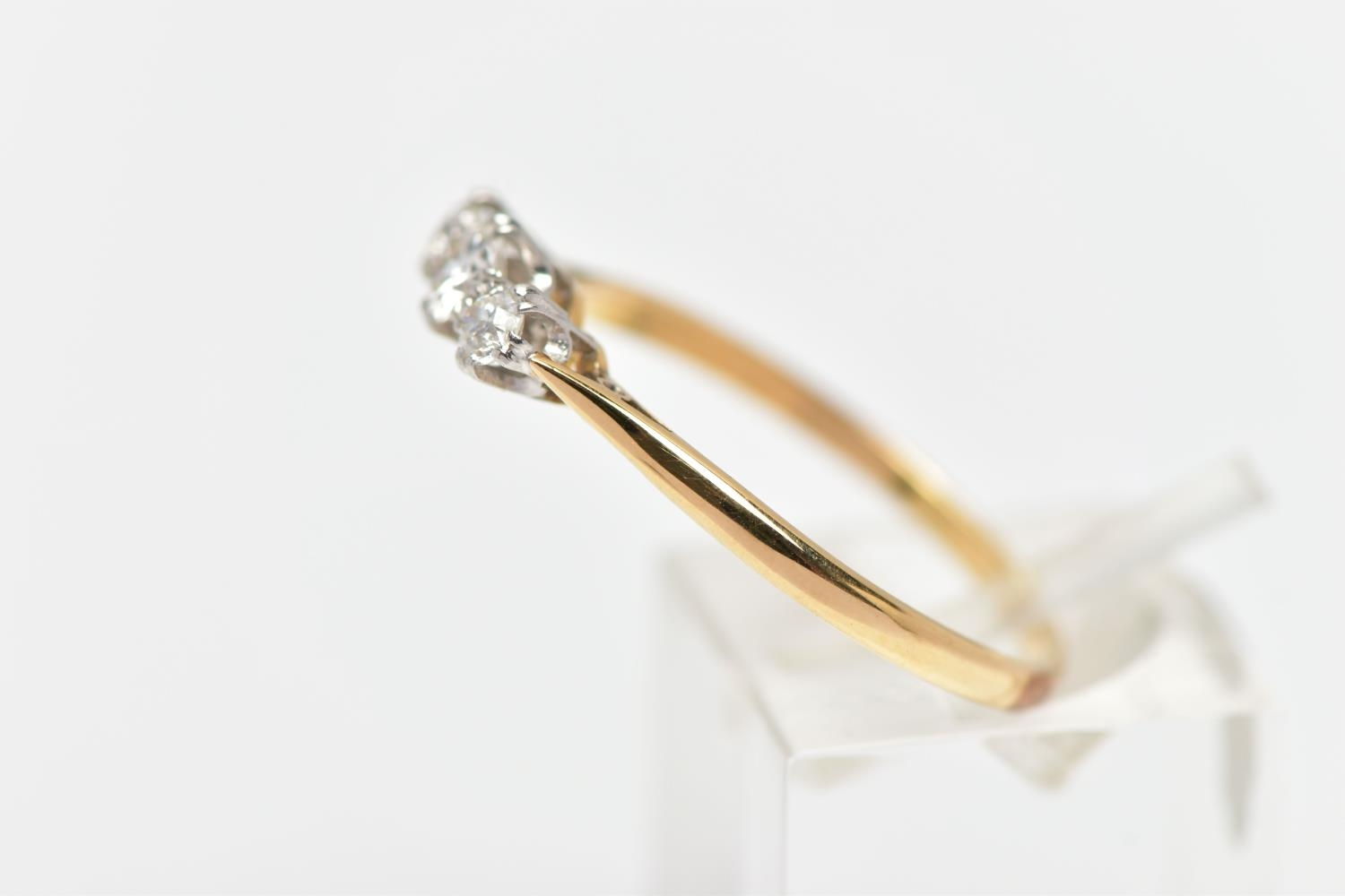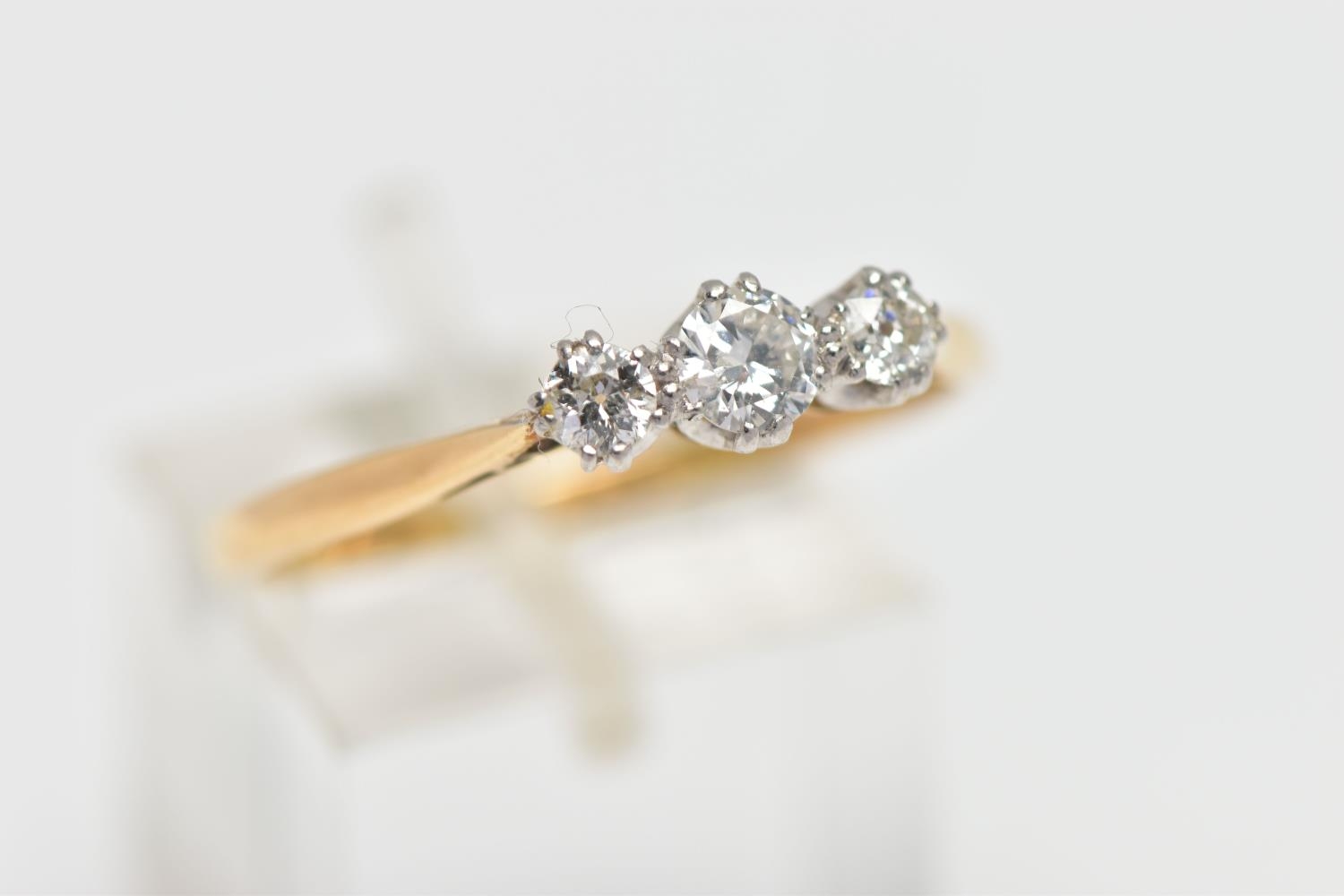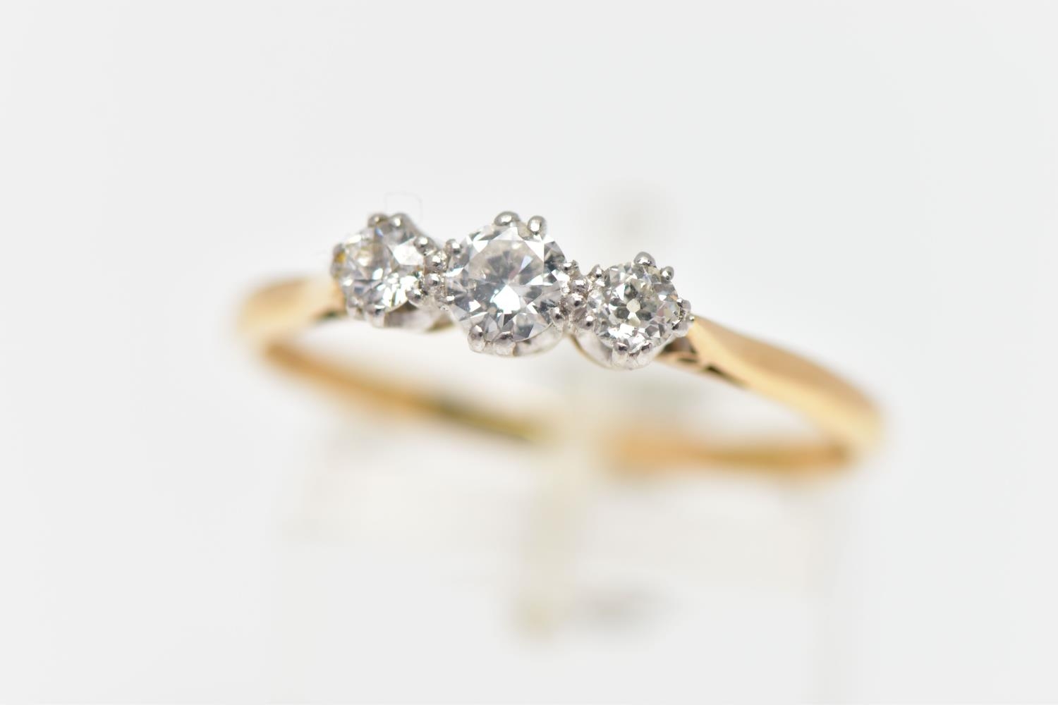 A MID 20TH CENTURY PLATINUM AND 18CT YELLOW GOLD DIAMOND THREE STONE RING, set with a principal round brilliant cut diamond, flanked with old European cut diamonds, estimated total diamond weight 0.40ct, assessed colour H-I, assessed clarity SI2- I1, approximate ring size U 1/2, stamped Plat.18 (rubbed), approximate gross weight 2.7 grams (condition report: overall condition very good, diamonds bright and lively, acid mark visible to band)