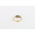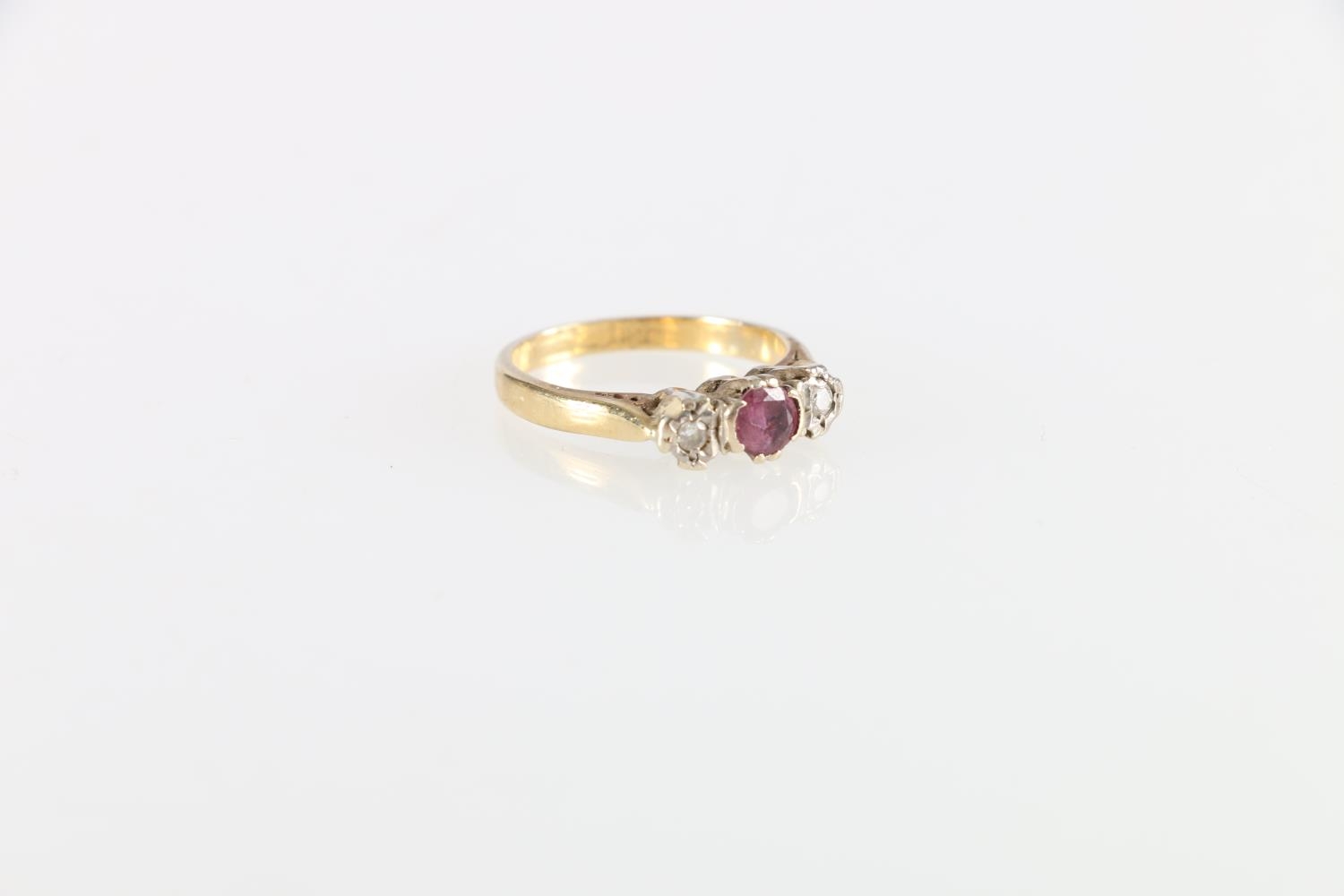 Unhallmarked yellow metal ruby and diamond three stone ring, size K, 3.2g
