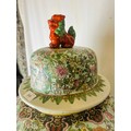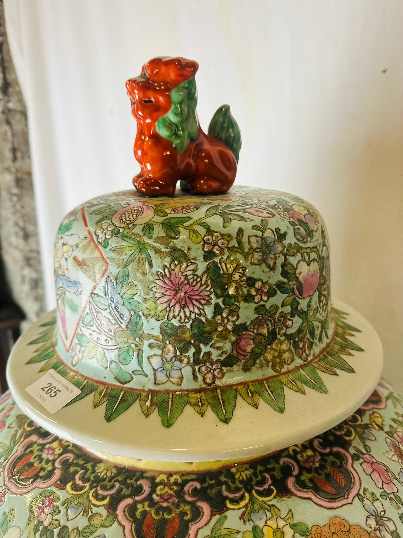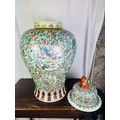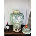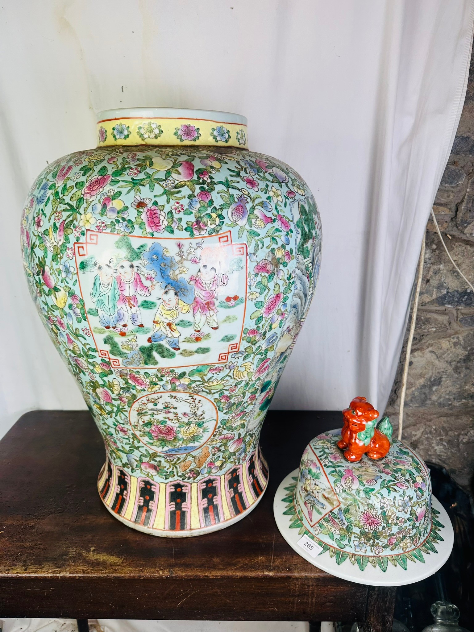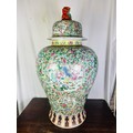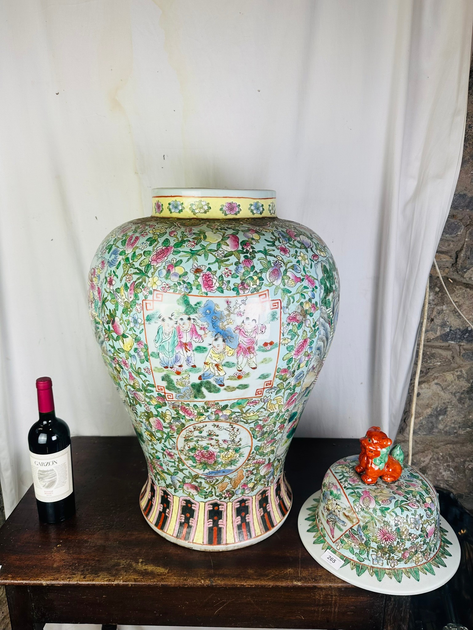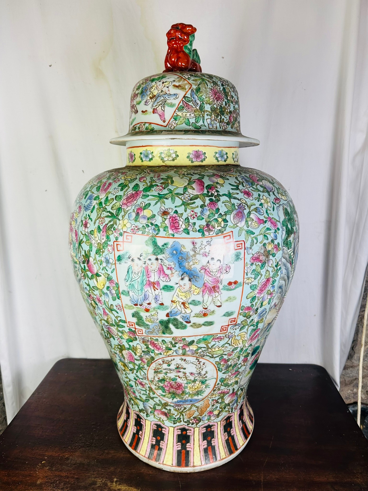 A large Chinese Rose Medallion temple jar complete with lid. Porcelain jar, hand painted depicting court figures and scenes, traditional baluster shape and a foo dog finial, 35''h