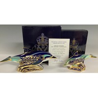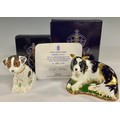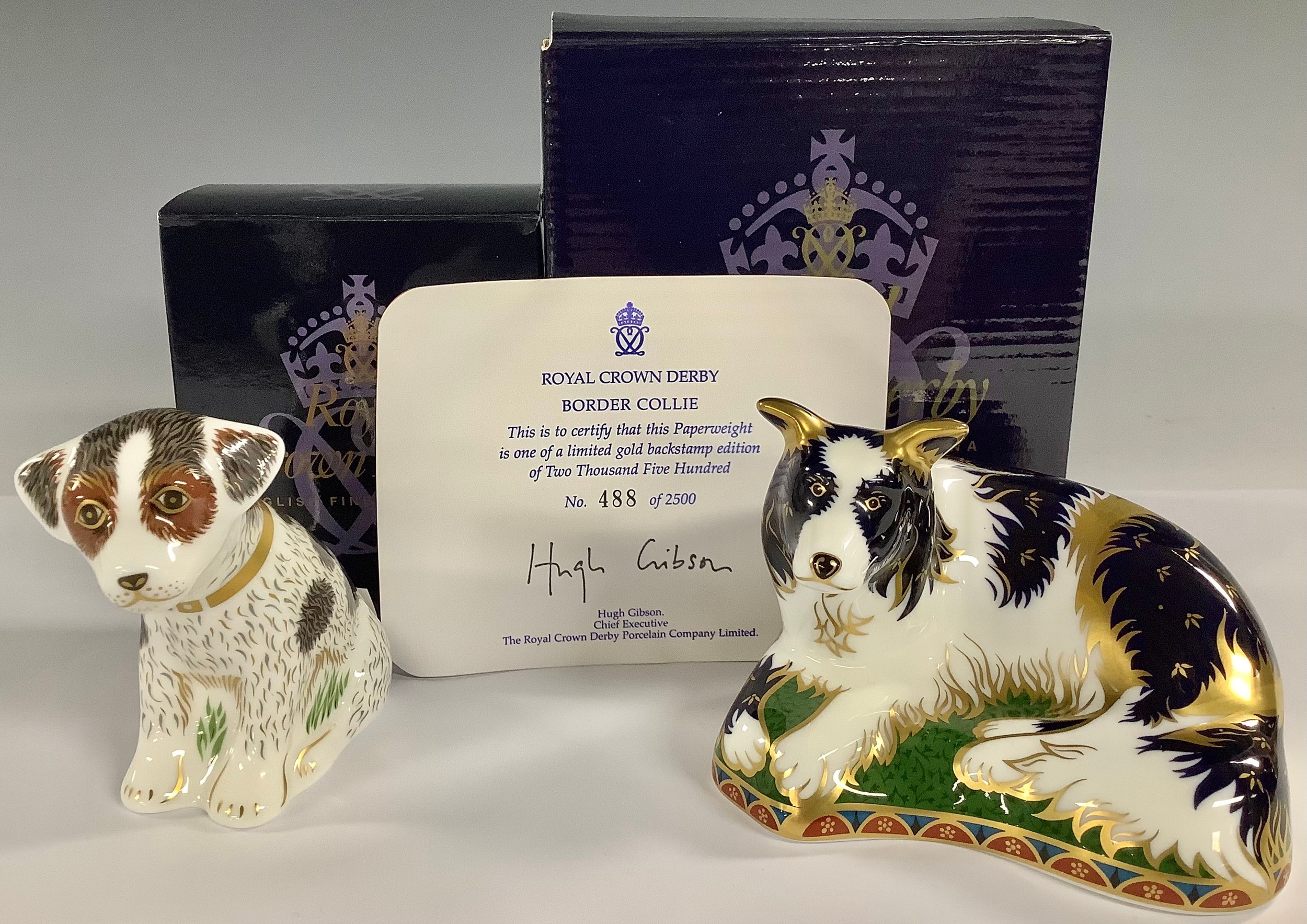 A Royal Crown Derby paperweight, Border Collie, gold backstamp limited edition, 488/2,500, signed in gold on the base by designer Jane James, gold stopper, gold printed marks, certificate, boxed; another, Sitting Puppy, gold stopper and red printed marks to the base, boxed (2)