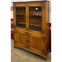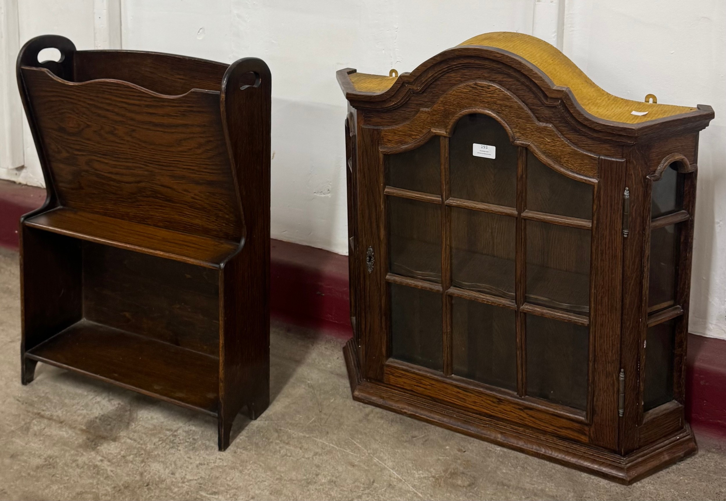 A Dutch oak wall hanging display cabinet and an oak magazine stand