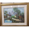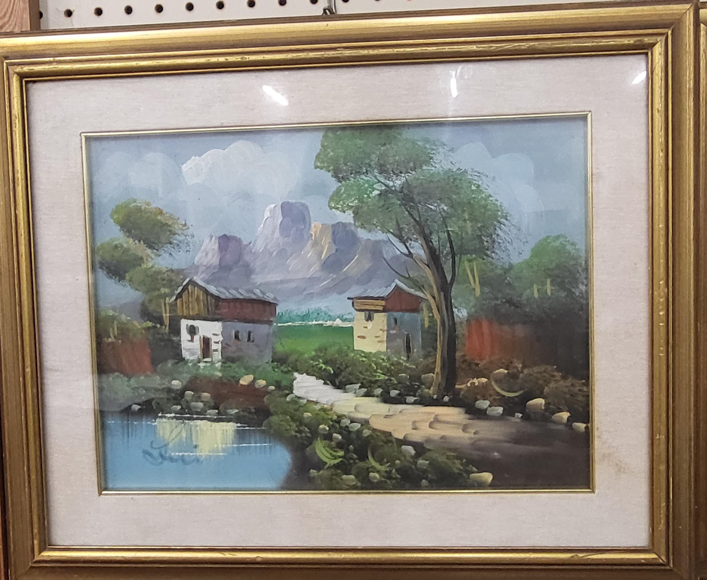 An oil on board depicting two houses at the foot of a mountain. Indistinguishably signed. 45 x 55cm incl. frame.