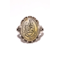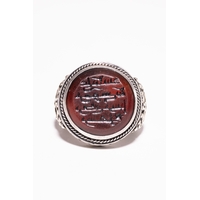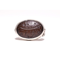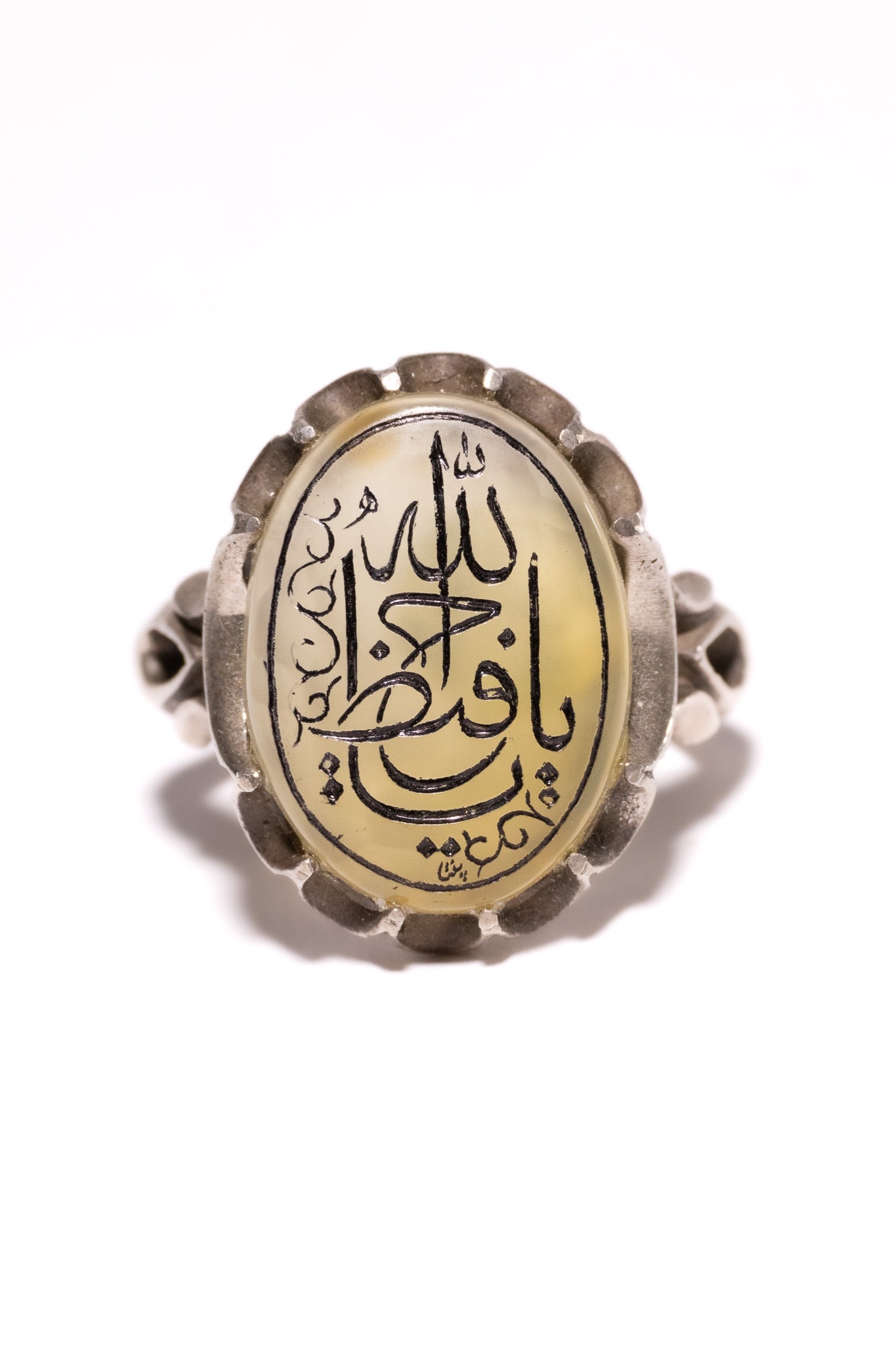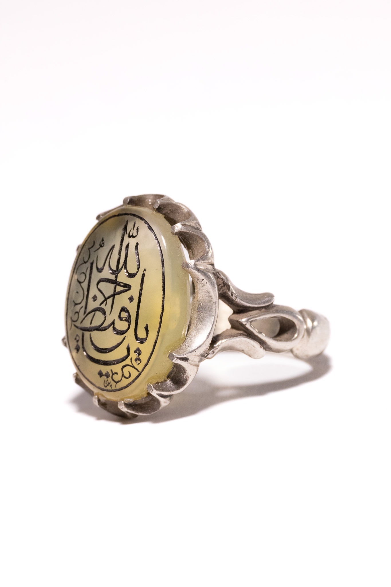 AN ISLAMIC SILVER SIGNET RING WITH CALLIGRAPHY INTAGLIO. - An Islamic signet-style ring crafted from silver. The ring features a central oval cabochon of translucent, honey-coloured chalcedony. The stone is deeply intaglio-carved with Arabic calligraphy, representing a religious invocation reading Allah and Ya Hafiz. The carved characters are highlighted with a black pigment. The stone is secured in a scalloped bezel setting. The shoulders of the ring are decorated with a bifurcated, openwork scroll design that transitions into a plain, rounded shank.