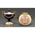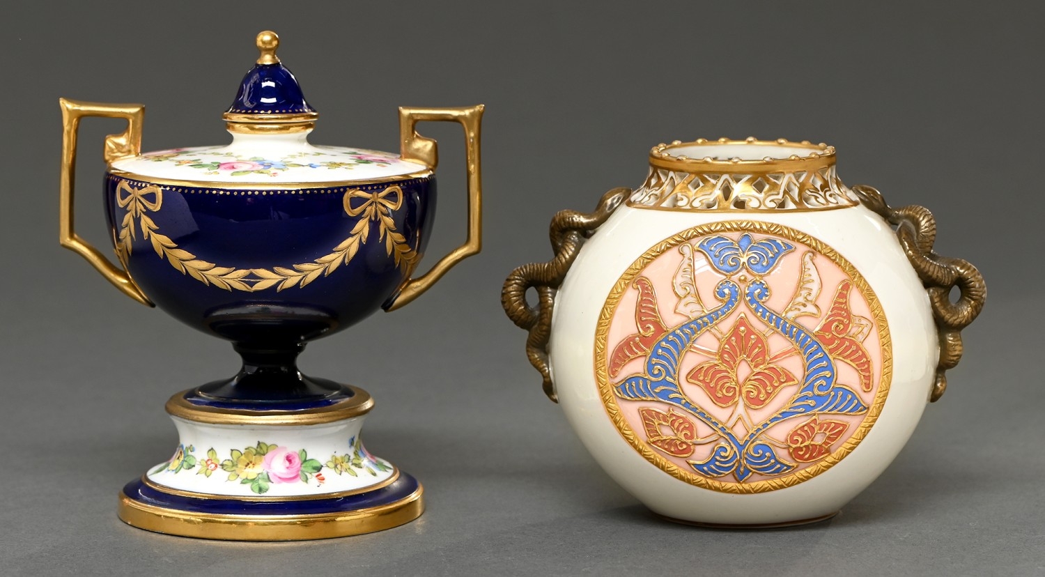 A Grainger's Worcester globular vase, c1890, with reticulated rim and bronzed snake handles, both sides with gilt tube-lined decoration, 10.5cm h, sepia printed mark and a Minton two-handled vase and cover, c1910, painted with flowers, the cobalt ground with gilt festoons, 14cm h, printed mark (2)